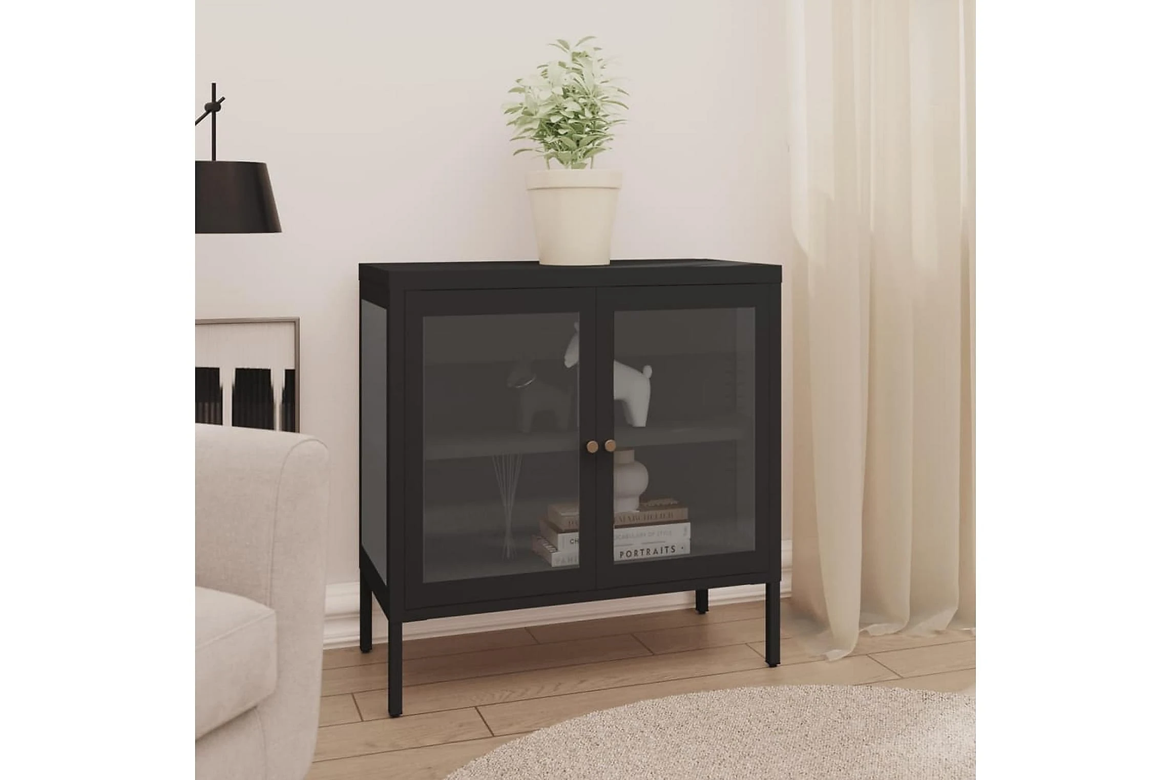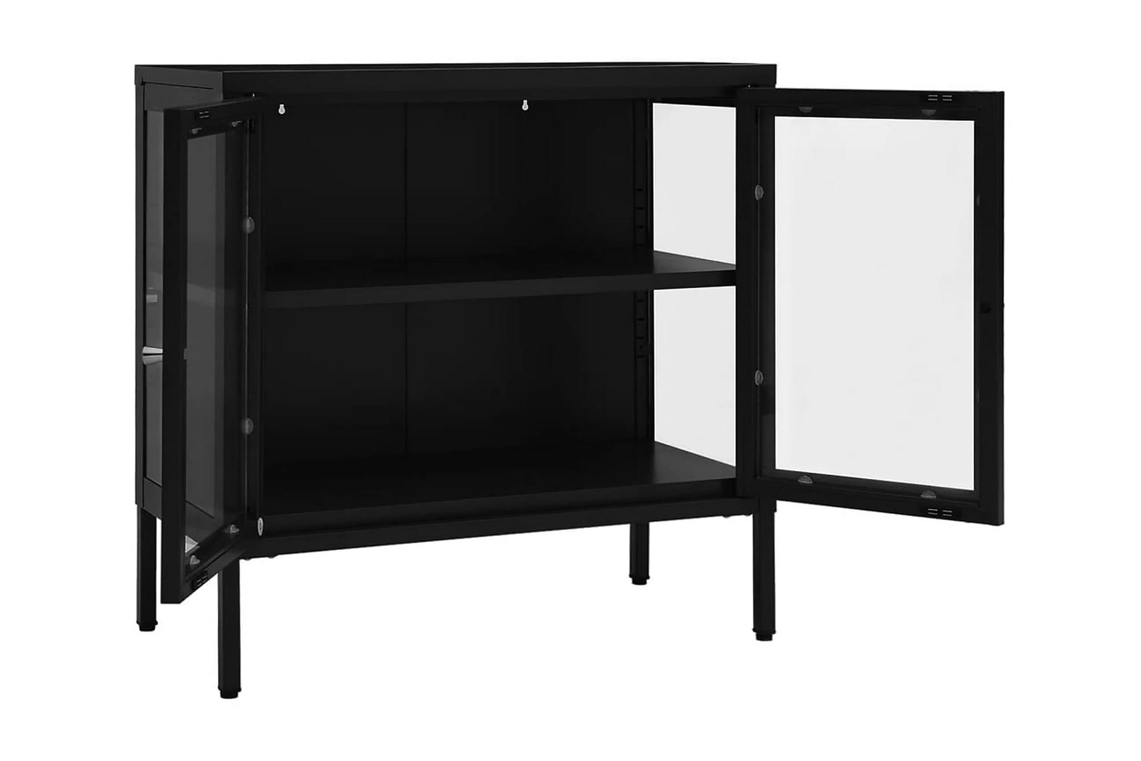 Detta förvaringsskåp är tillverkat av stål och är robust och hållbart, vilket säkerställer många års användning. Skåpet har fack bakom glasdörren med gott om plats för att förvara och visa upp böcker, tidskrifter, dvd:er, vaser och andra prydnadssaker organiserat och inom räckhåll. Dessutom kan hyllas installeras i olika höjder för att än dra storleken på förvaringsutrymmet. Fötterna kan enkelt justeras och hjälper till att hålla skåpet stabilt. Dessutom torkas det enkelt av med en fuktig trasa.
