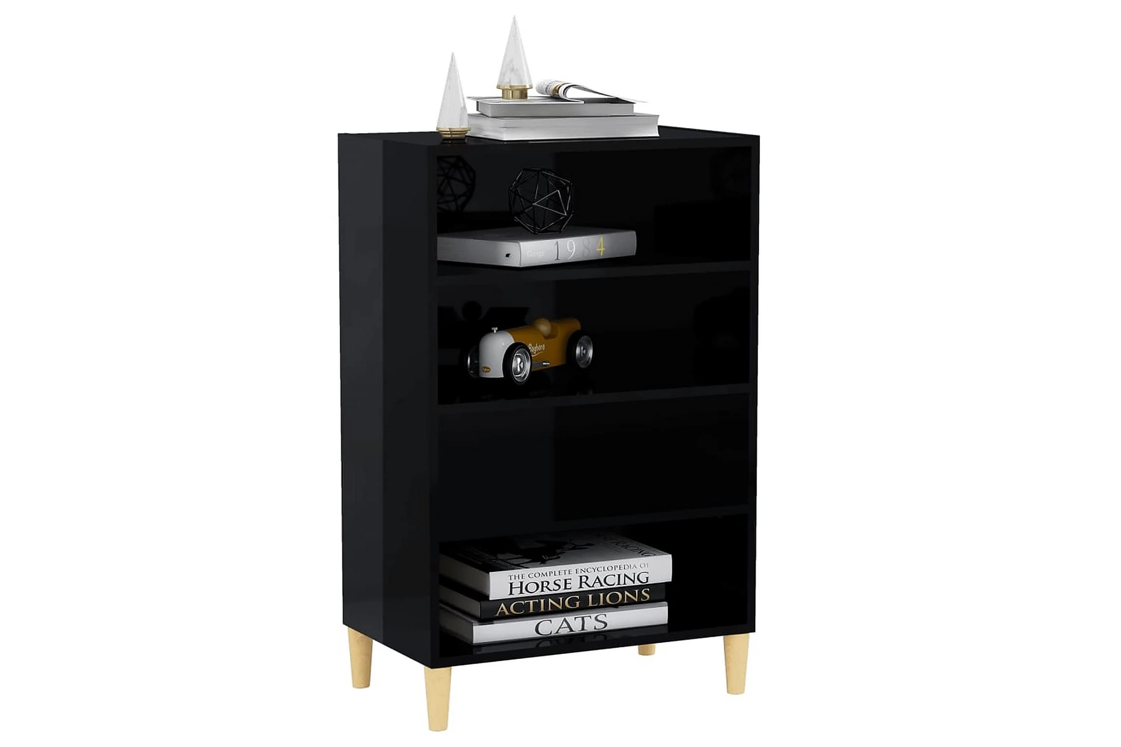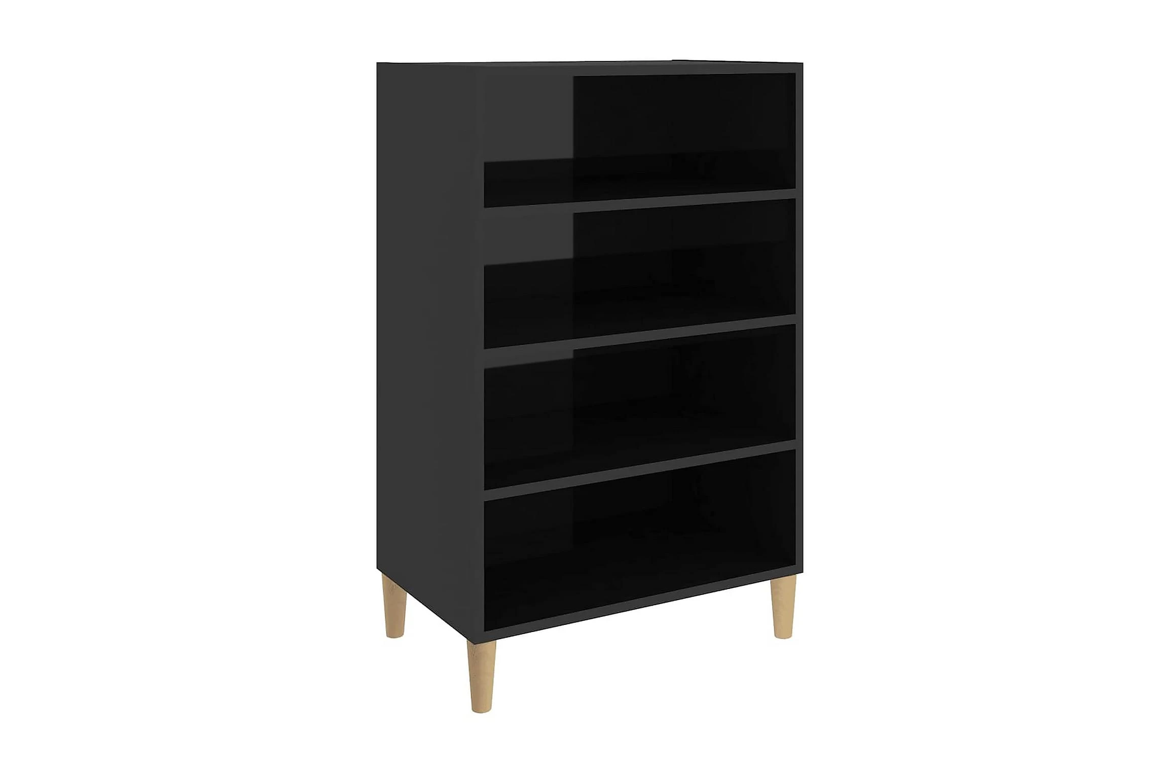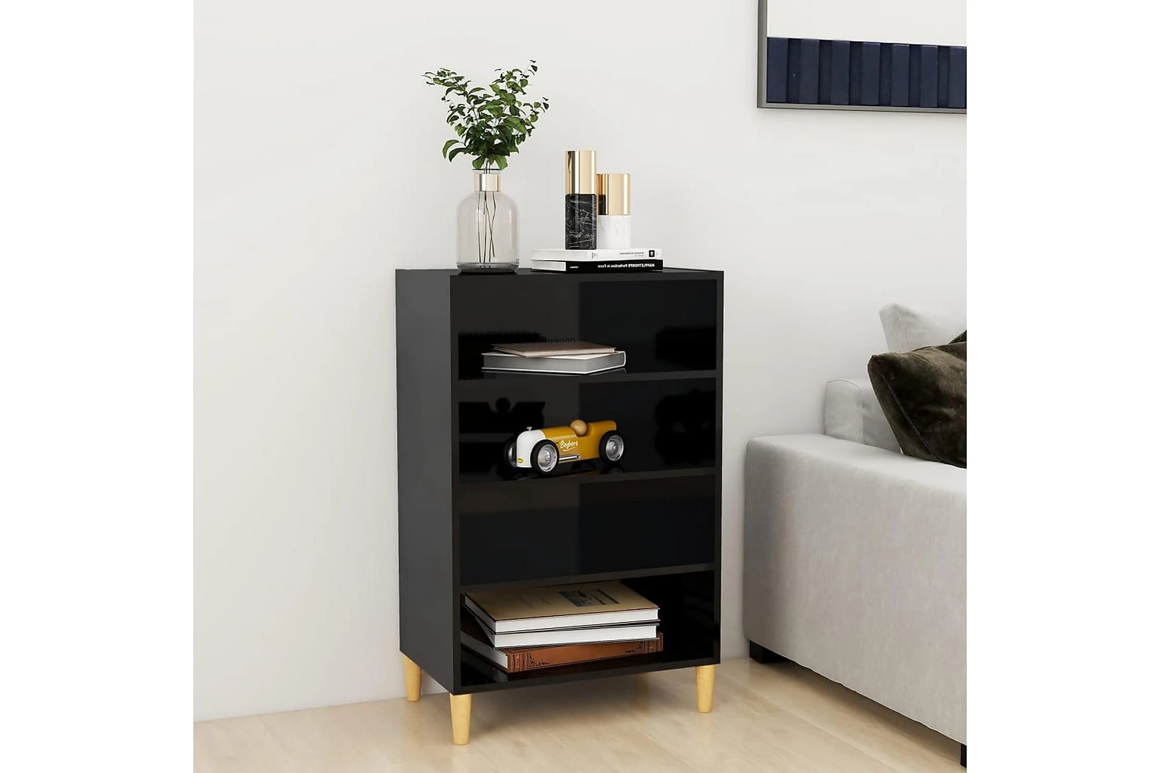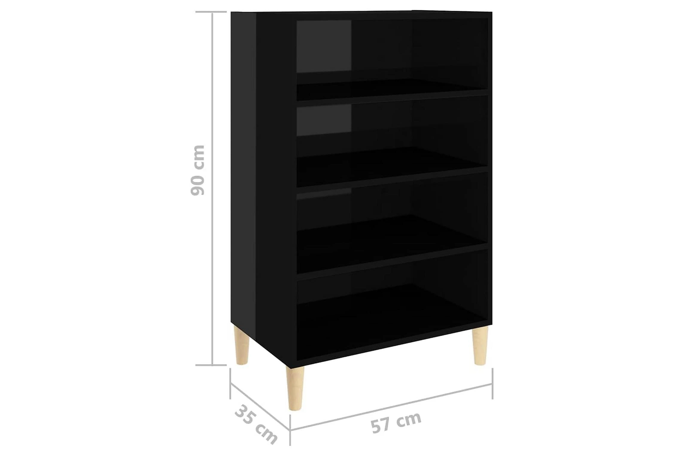 Skänken/bokhyllan är tillverkad av spånskiva, vilket gör den robust och hållbar för många års användning. Benen i trä bidrar till extra stabilitet. Skänken har 4 hyllor med gott om förvaringsplats. Den robusta skivan är en perfekt plats att ställa prydnadssaker, fotoramar eller krukväxter på. Skänken kan enkelt torkas av med en fuktig trasa.