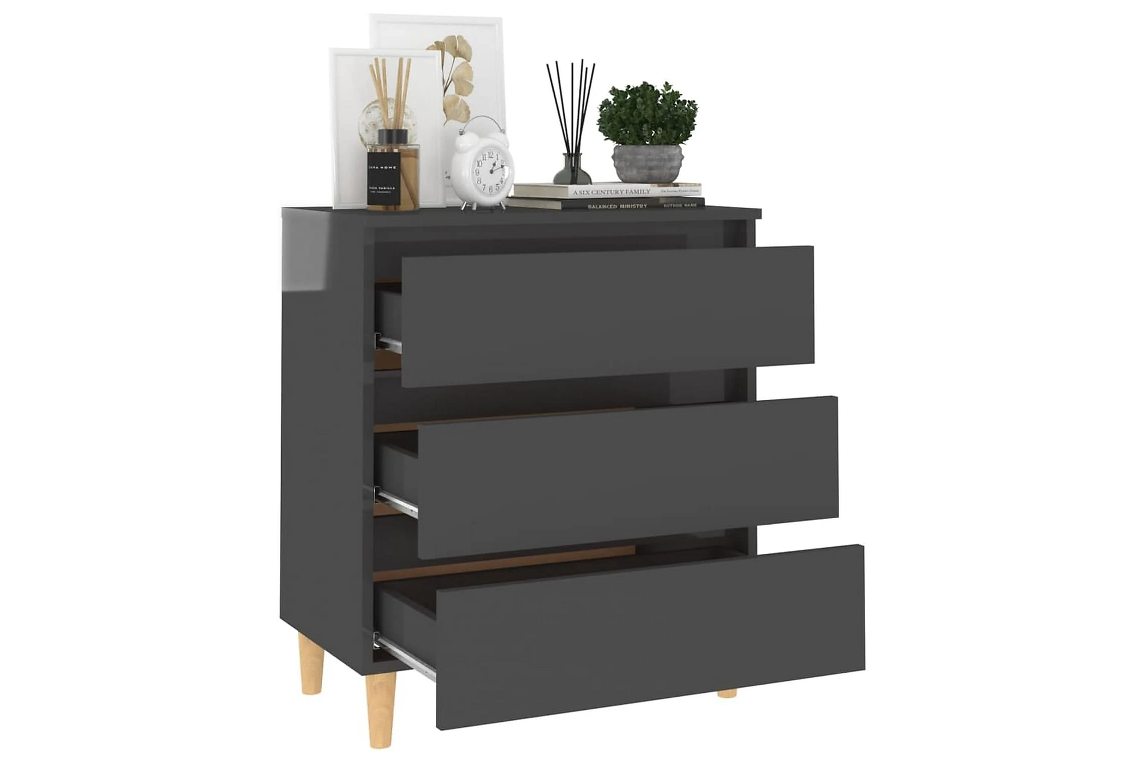 Denna skänk har träben och en stabil konstruktion, vilket gör den extrem hållbar och stadig. Den har 3 lådor som ger gott om förvaringsplats för böcker, mediaapparater och andra saker. Den stadiga bordsskivan är perfekt för att visa upp dekorativa föremål, fotoramar eller krukväxter. Dessutom kan den enkelt torkas av med en fuktig trasa.
