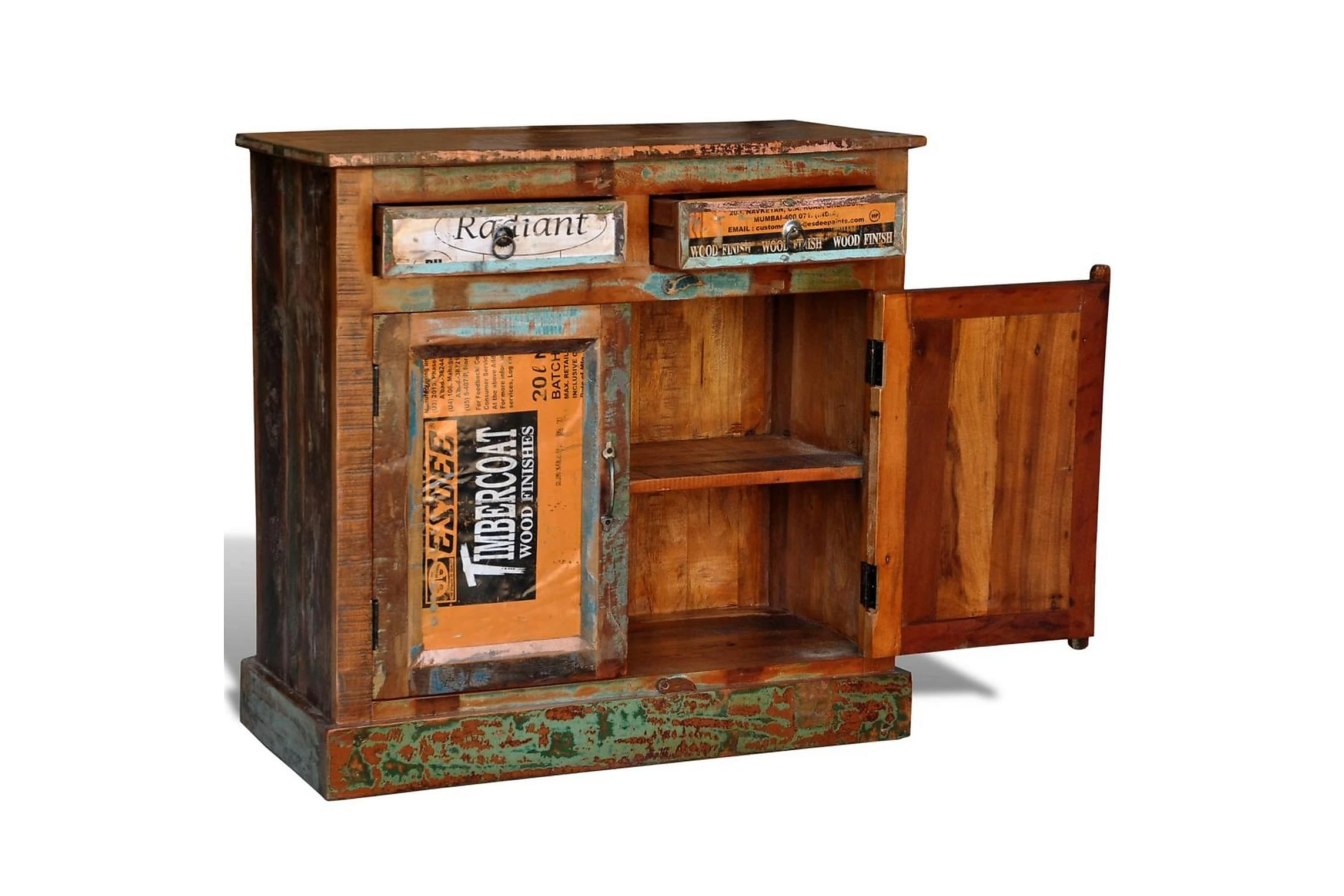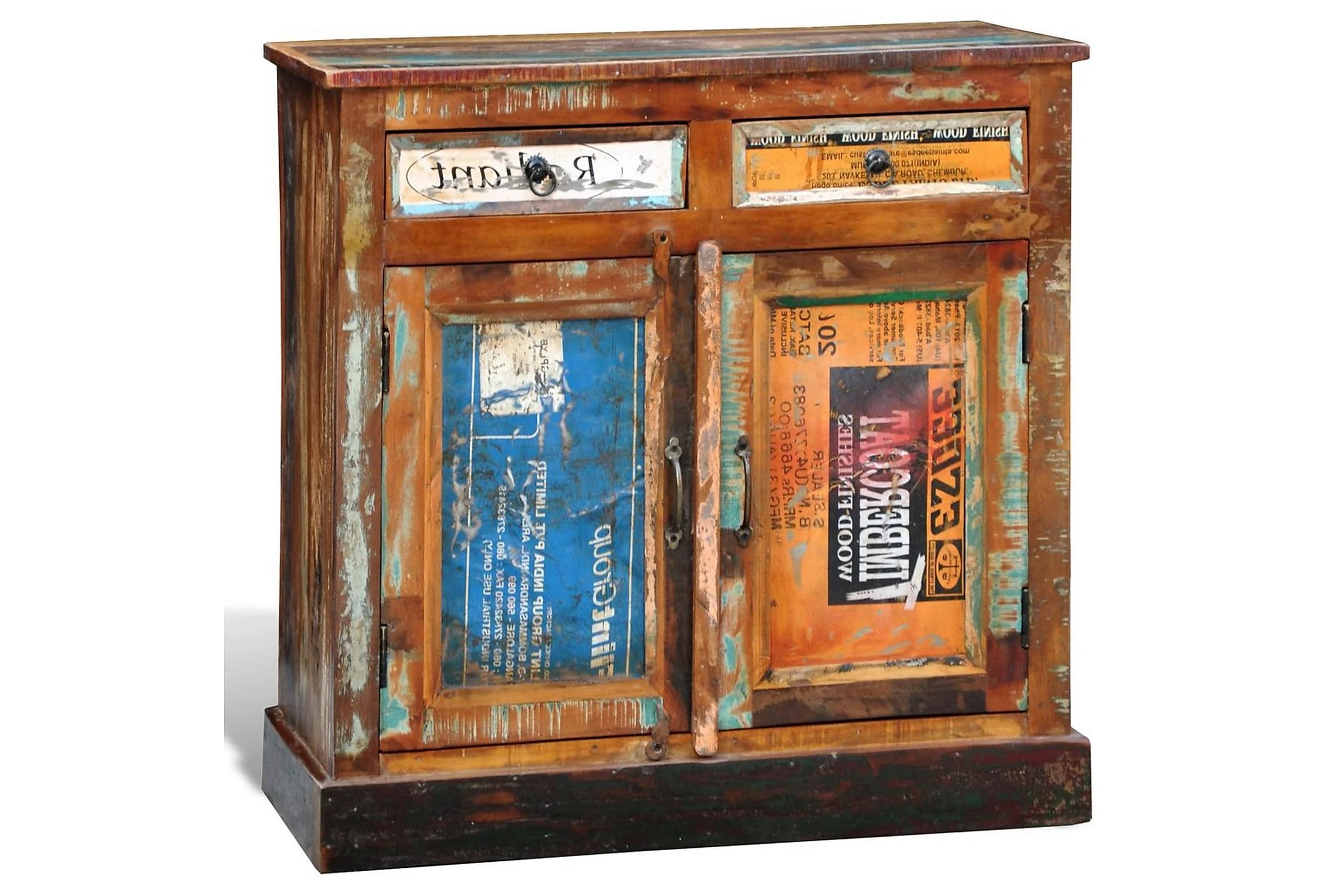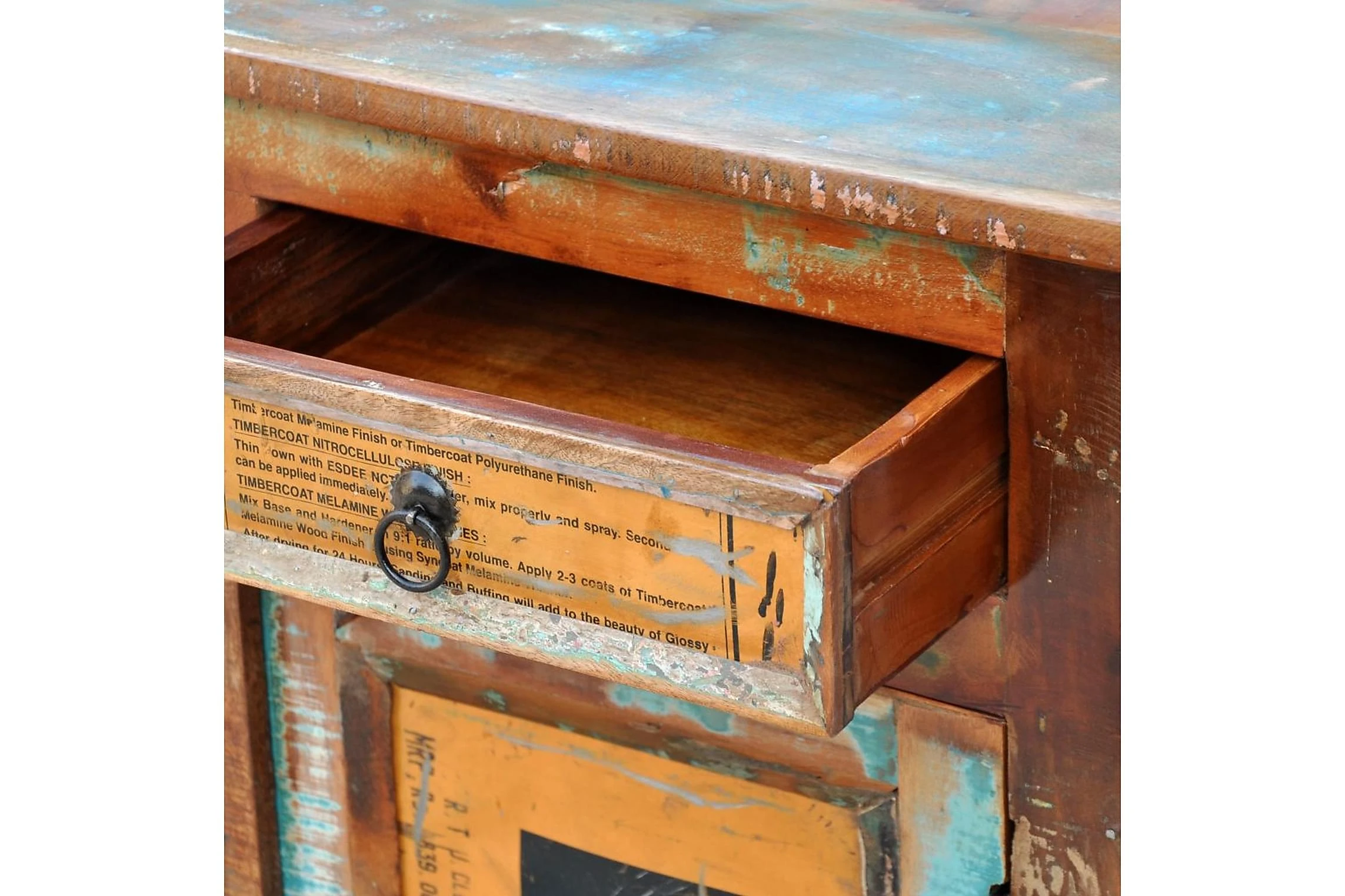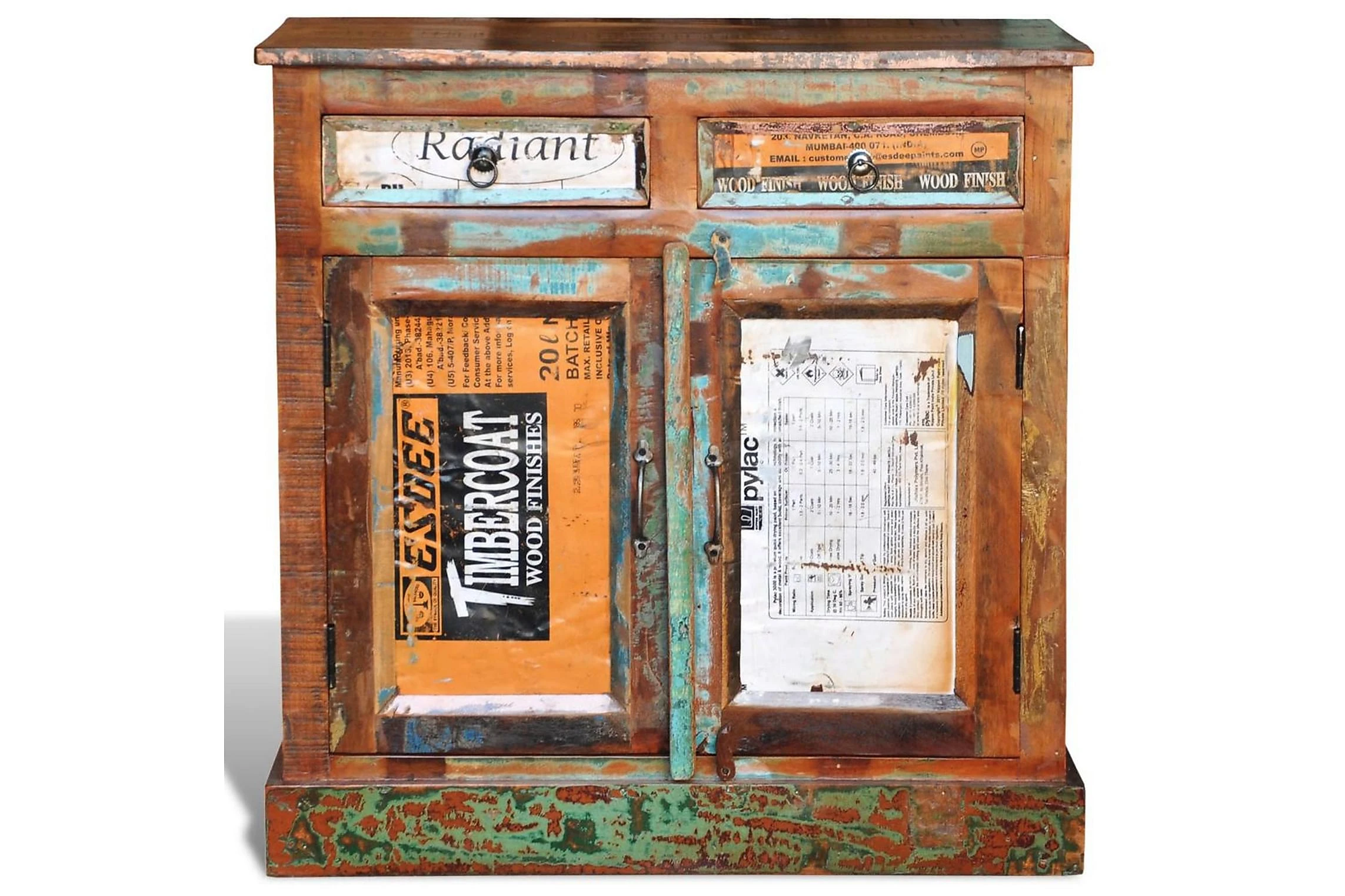 Denna skänk i antik stil levereras komplett med två lådor och två luckor, den erbjuder dig gott om förvaringsutrymme och hjälper dig att hålla dina prylar i ordning. Du kan också ställa din datorn, ipad, böcker, toalettartiklar eller dekorationer på den stadiga ovansidan. De två luckorna med dörrbultar säkerställer säkerhet. Skänken är tillverkad i återvunnet trä vilket betyder att varje möbel är unik och skiljer sig något från de andra. Möbler tillverkade av återvunnet trä har karaktärsdrag från olika träslag såsom sheesham, teak, palisander, mangoträ, akacia, ädelträ, etc. Återvunnet trä är massivt, stadigt, hållbart och vackert. Spikhål och synlig ådring ger möbeln en historia och bjuder in ännu en generation att genomsyra den med sin alldeles egen sådan. Den här möbeln kommer att visa att du förstår koncept såsom resursskydd, miljöskydd och hållbar utveckling. Dessutom tillför det rena hantverket en spektakulär, exotisk vintagestil till skänken. Varje process för återkombinering, polering, målning och vaxning är omsorgsfullt utförd. Oavsett om du har skänken i matsalen eller i sovrummet, kommer skänken i trä vara ett bra val. Viktig anmärkning: Eftersom varje del är handgjord med en unik blandning av återvunnet trä, är varje skänk något annorlunda i färg. Leveransen är slumpartad.
