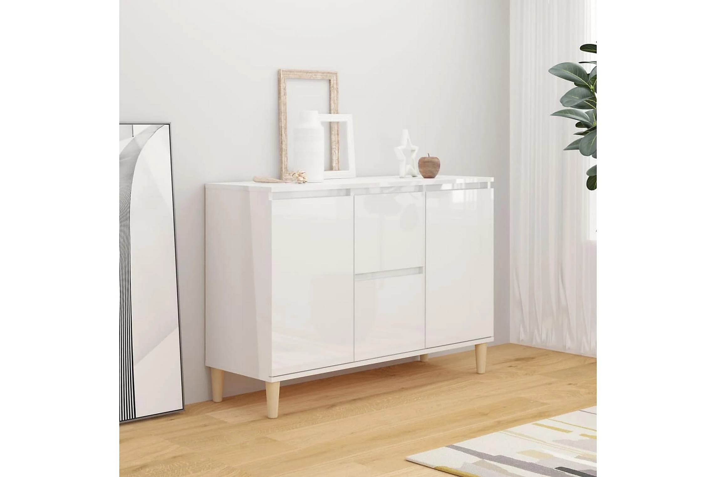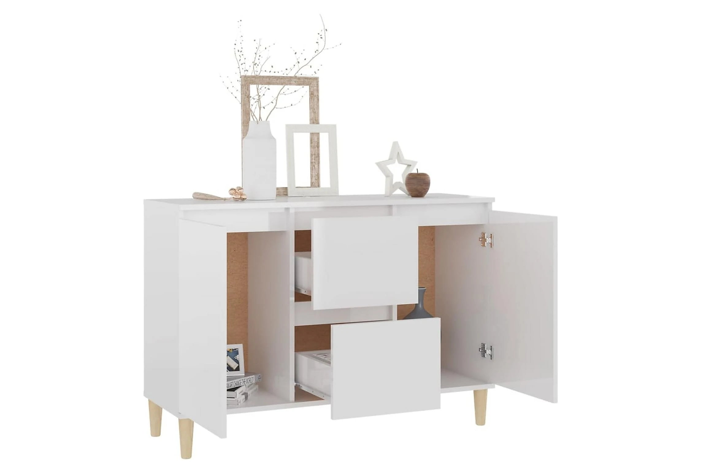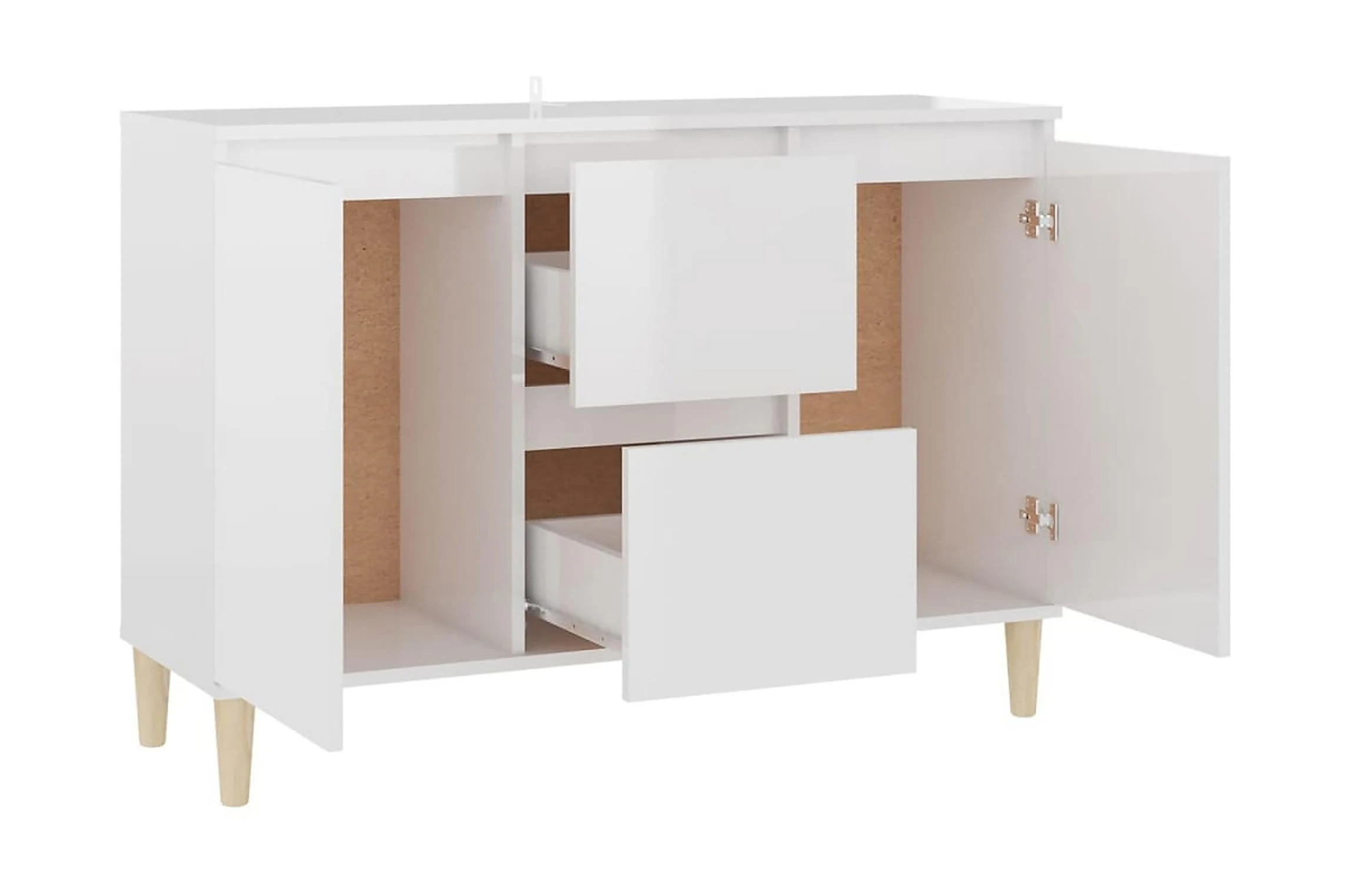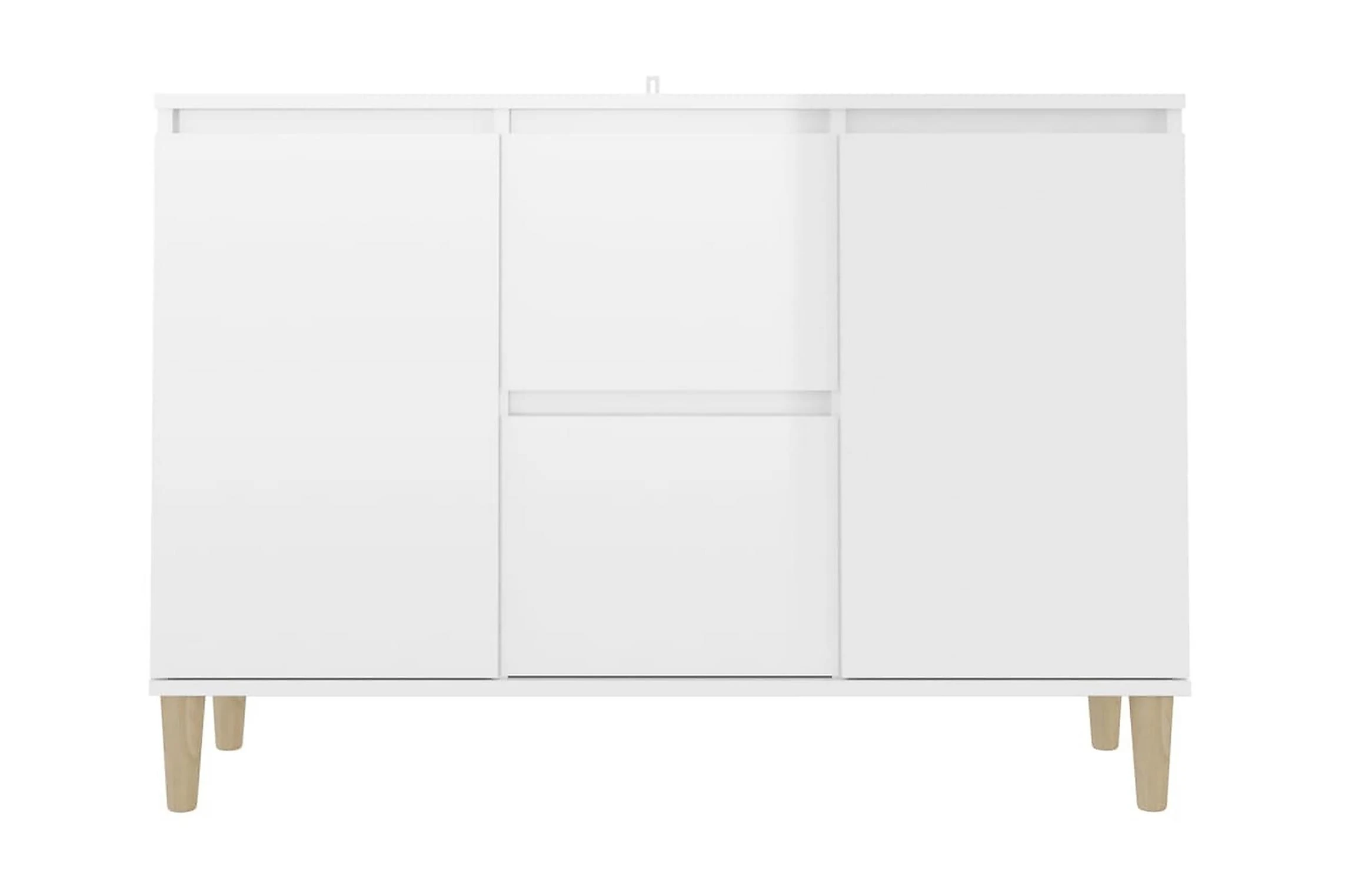 Skänken är tillverkad av spånskiva, vilket gör den robust och hållbar för många års användning. Benen i trä bidrar till extra stabilitet. Skänken har 2 lådor och 2 dörrar med gott om förvaringsplats. Den robusta skivan är en perfekt plats att ställa prydnadssaker, fotoramar eller krukväxter på. Skänken kan enkelt torkas av med en fuktig trasa.