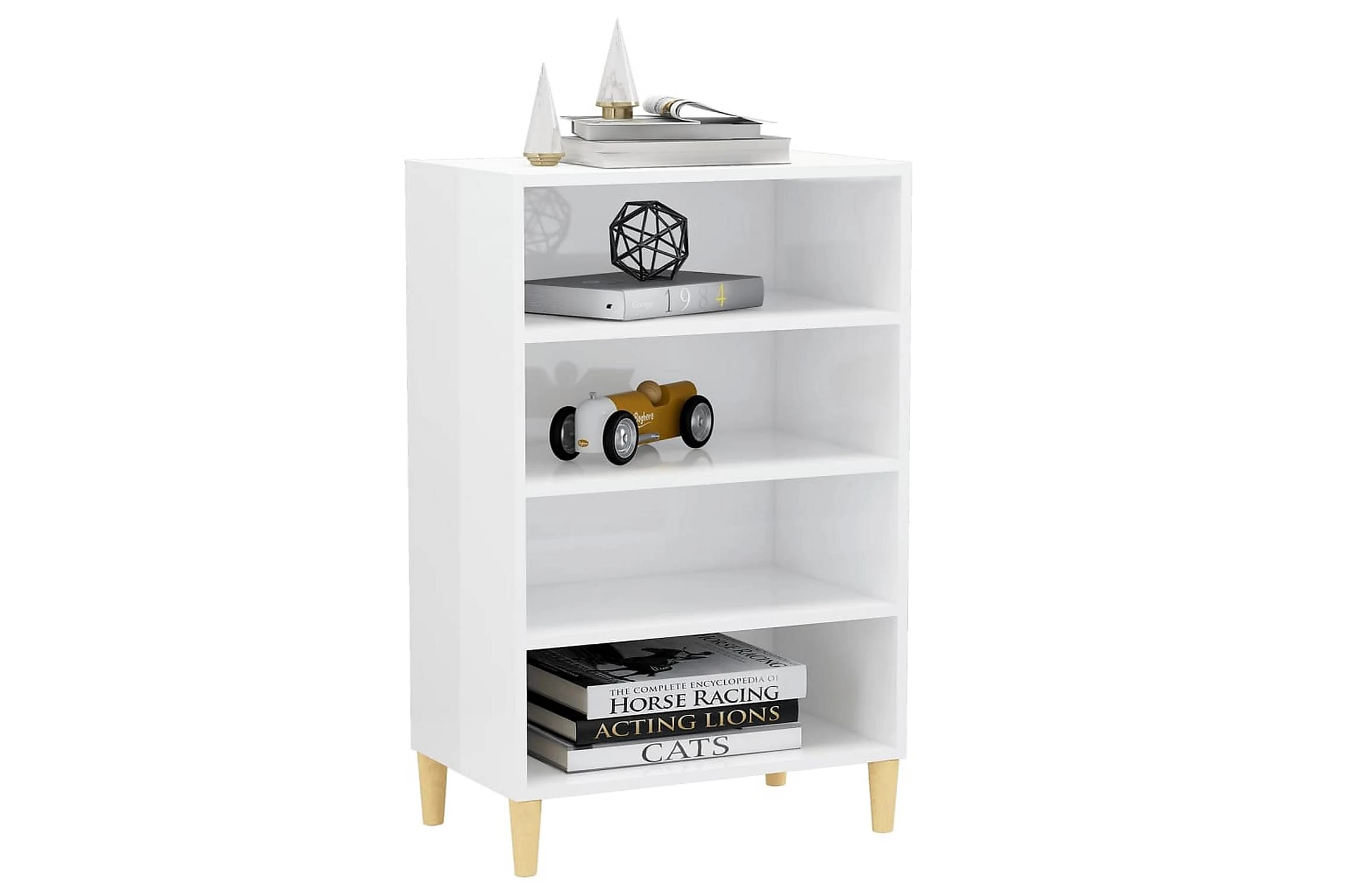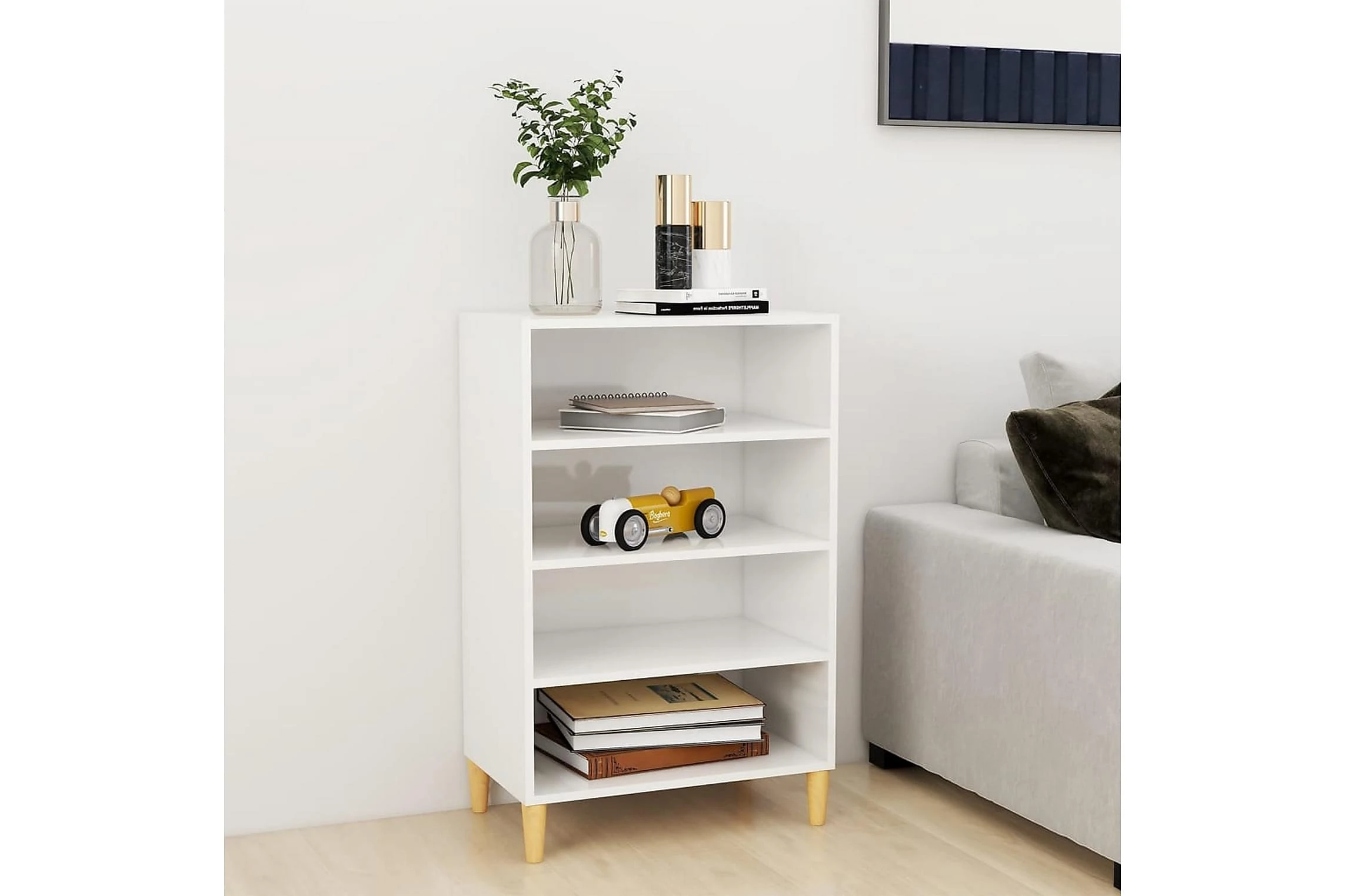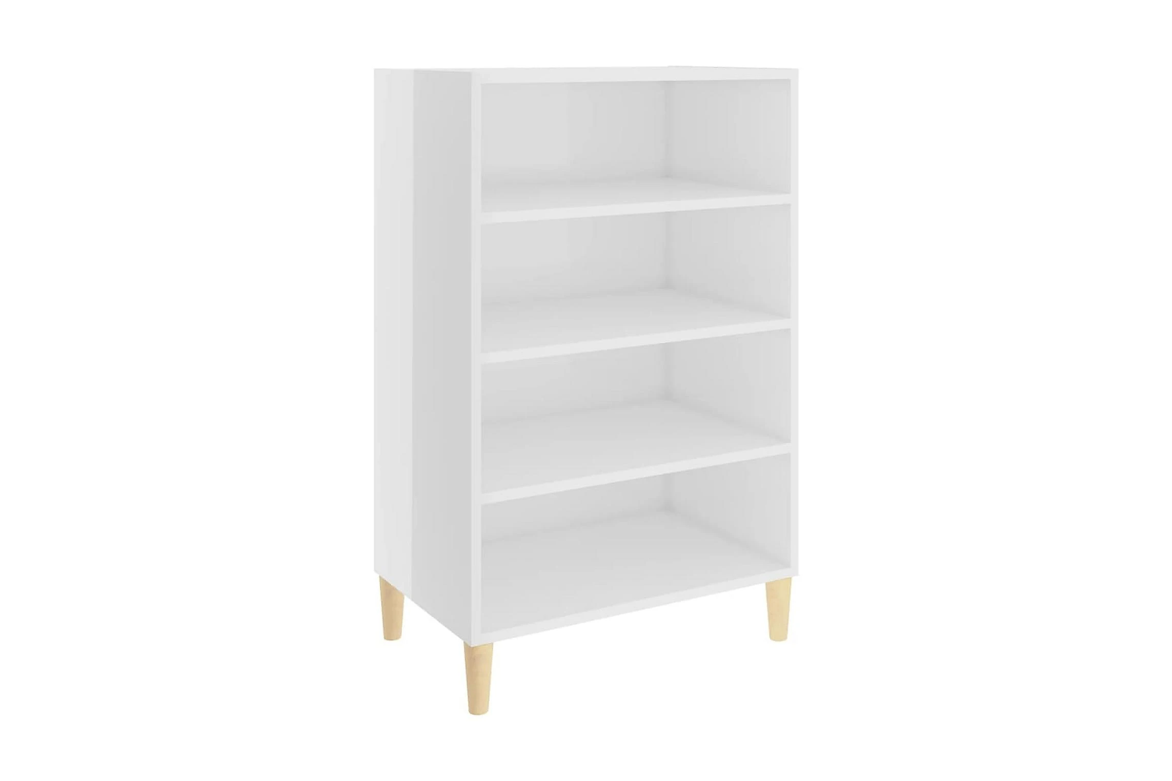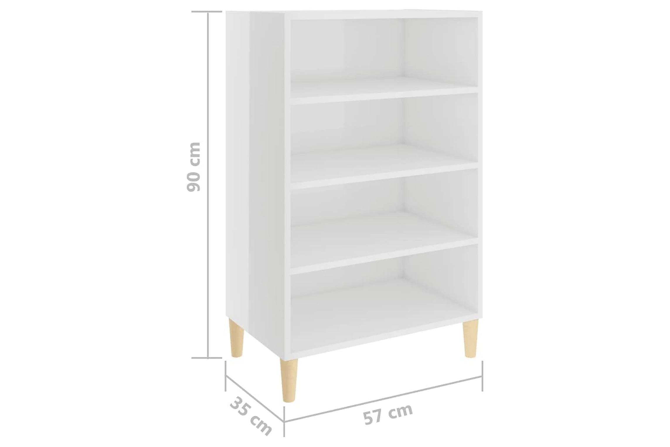 Skänken/bokhyllan är tillverkad av spånskiva, vilket gör den robust och hållbar för många års användning. Benen i trä bidrar till extra stabilitet. Skänken har 4 hyllor med gott om förvaringsplats. Den robusta skivan är en perfekt plats att ställa prydnadssaker, fotoramar eller krukväxter på. Skänken kan enkelt torkas av med en fuktig trasa.
