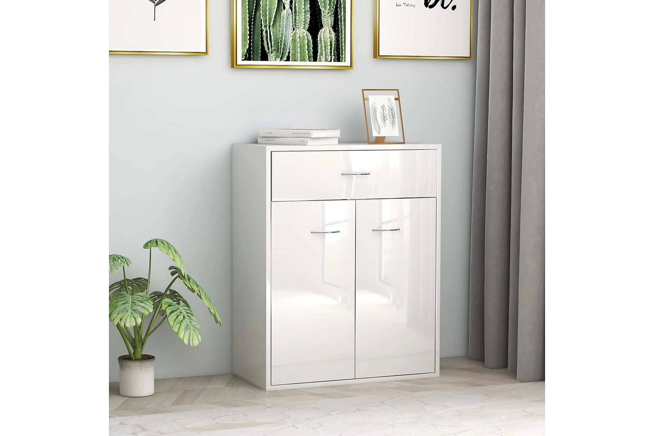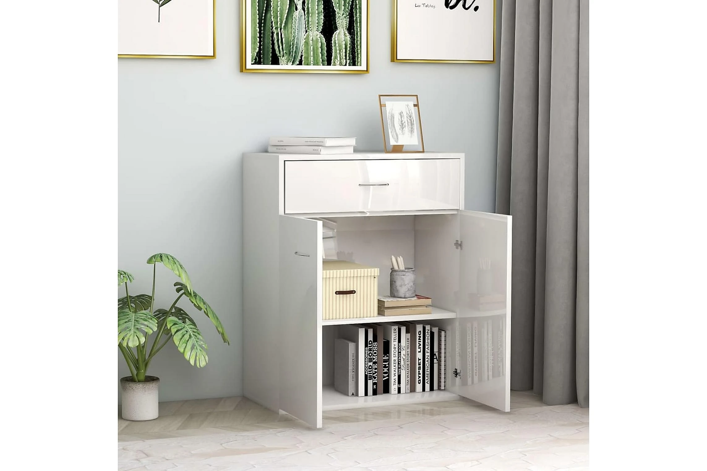 Skänken med 2 dörrar och en låda har gott om förvaringsutrymme för böcker, mediaenheter och andra föremål. Den stadiga ovansidan är perfekt för att visa upp dekorativa föremål, fotoramar eller krukväxter. Den kan även användas som avlastningsbord, sidoskåp, med mera. Tack vare sin högkvalitativa spånskiva är skänken mycket hållbar.