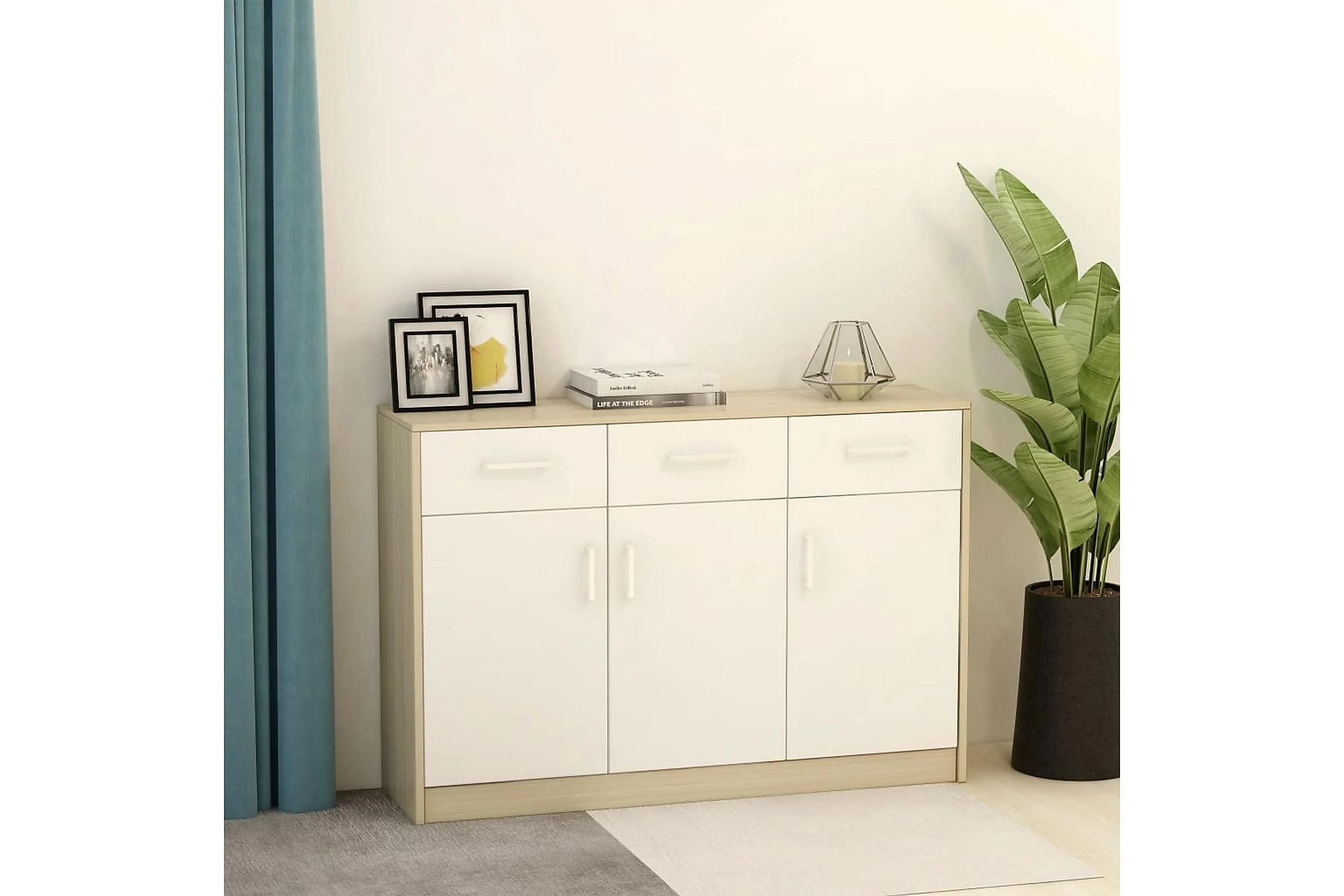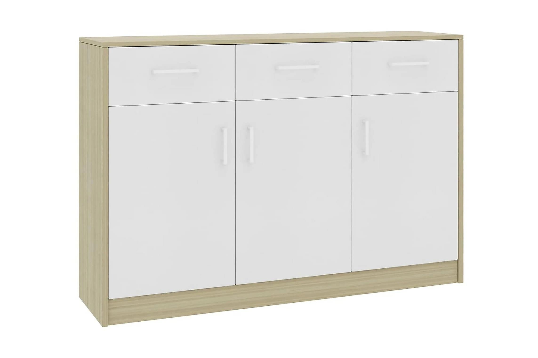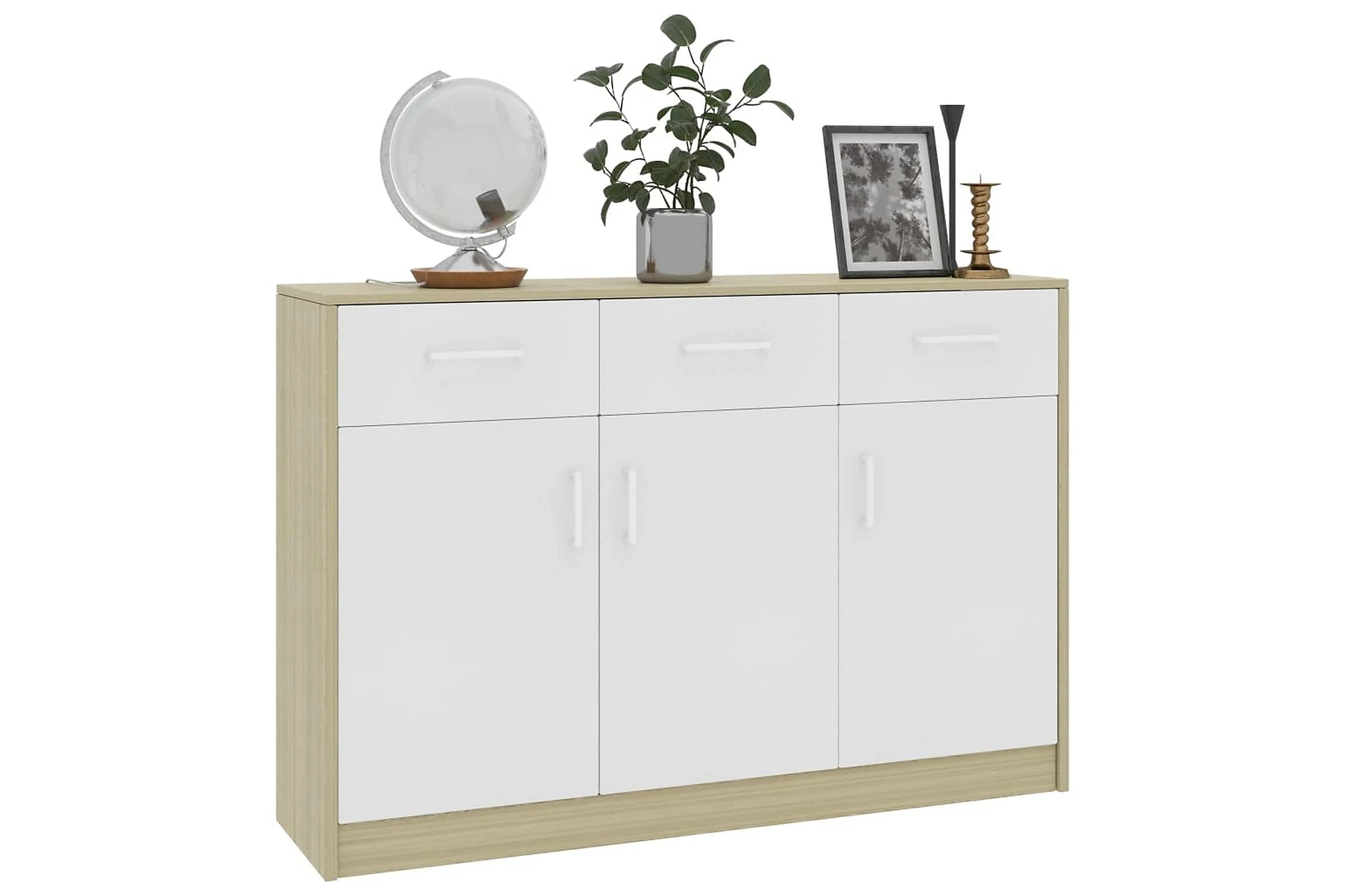 Skänken med 3 lådor och 3 dörrar har gott om förvaringsutrymme för böcker, mediaenheter och andra föremål. Den stadiga ovansidan är perfekt för att visa upp dekorativa föremål, fotoramar eller krukväxter. Den kan även användas som avlastningsbord, sidoskåp, med mera. Tack vare sin högkvalitativa spånskiva är skänken mycket hållbar.