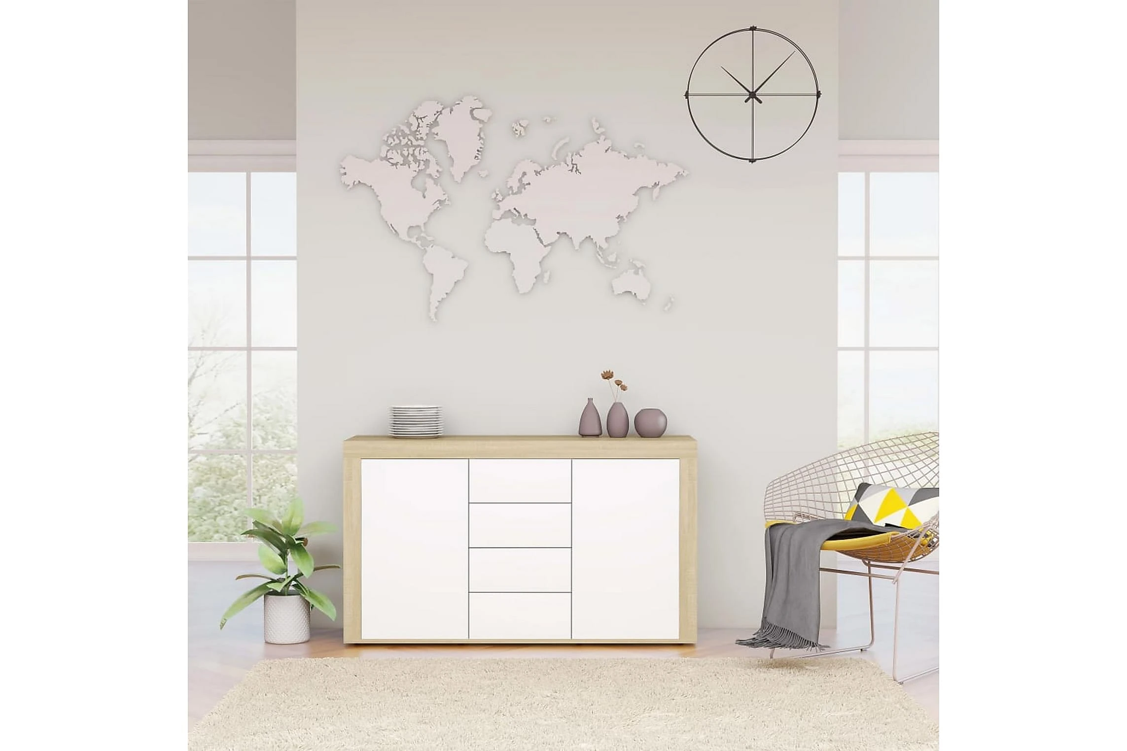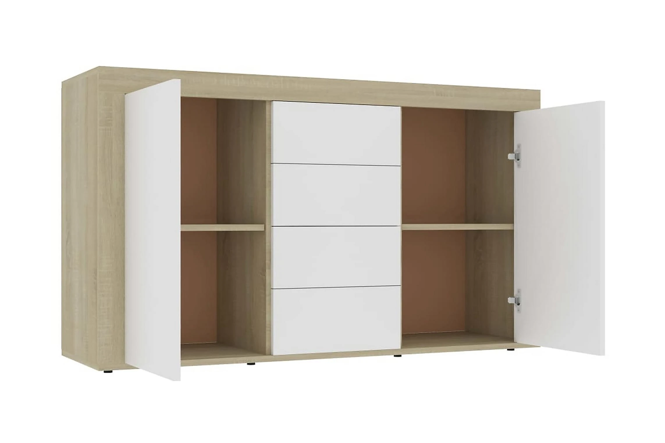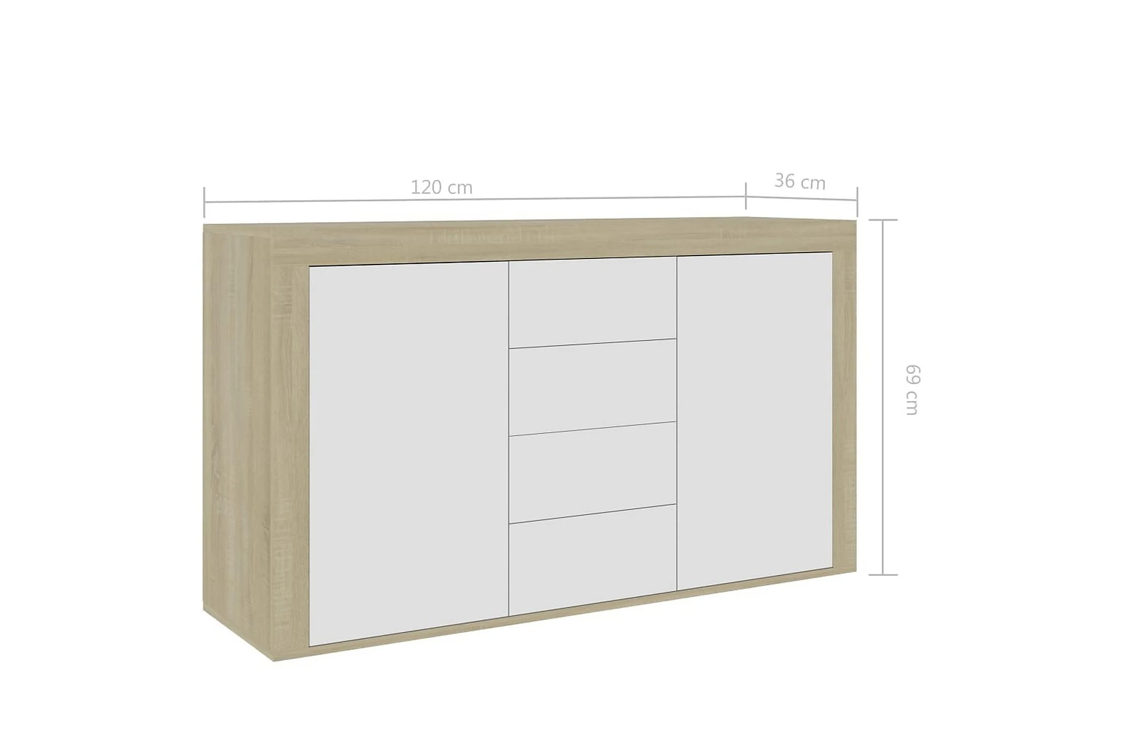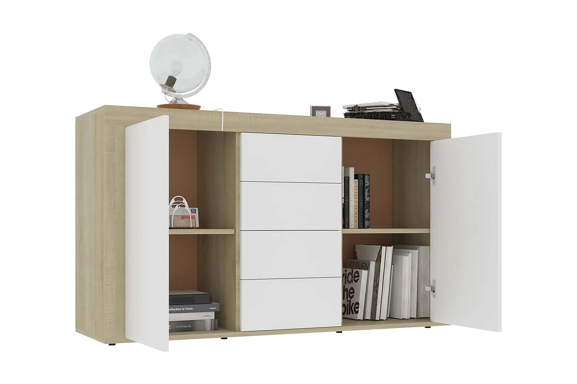 Skänken med 2 luckor och 4 lådor har gott om förvaringsplats för böcker, mediaenheter och andra saker. Den stadiga ovansidan är perfekt för att visa upp prydnadsföremål, fotoramar eller krukväxter. Skänken är byggd för att hålla tack vare dess premium spånskiva. Den kan enkelt rengöras med en fuktig trasa.