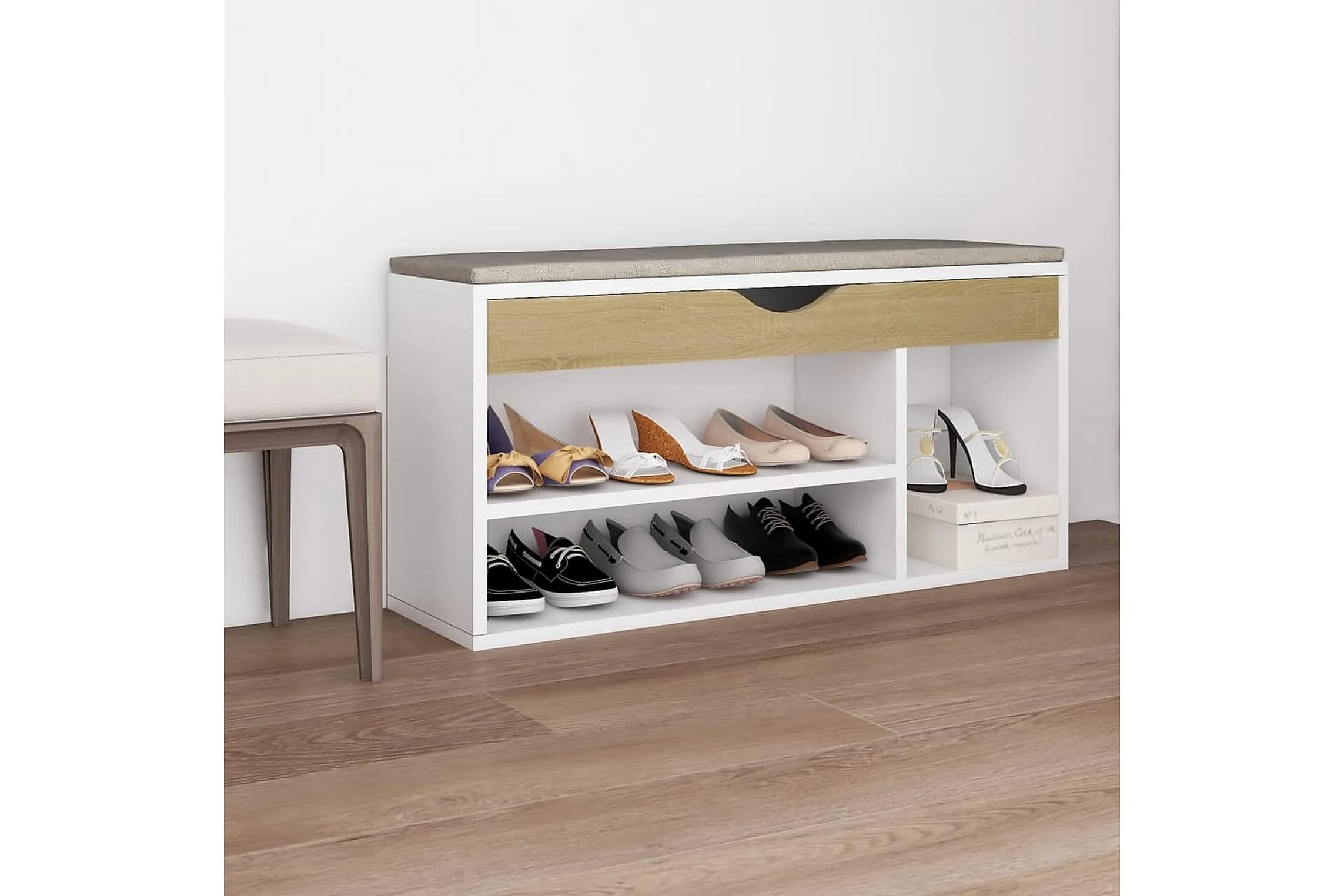 Håll dina skor organiserade och inom räckhåll med denna skobänk! Bänken med dyna är även en bekväm plats att sitta och vila.