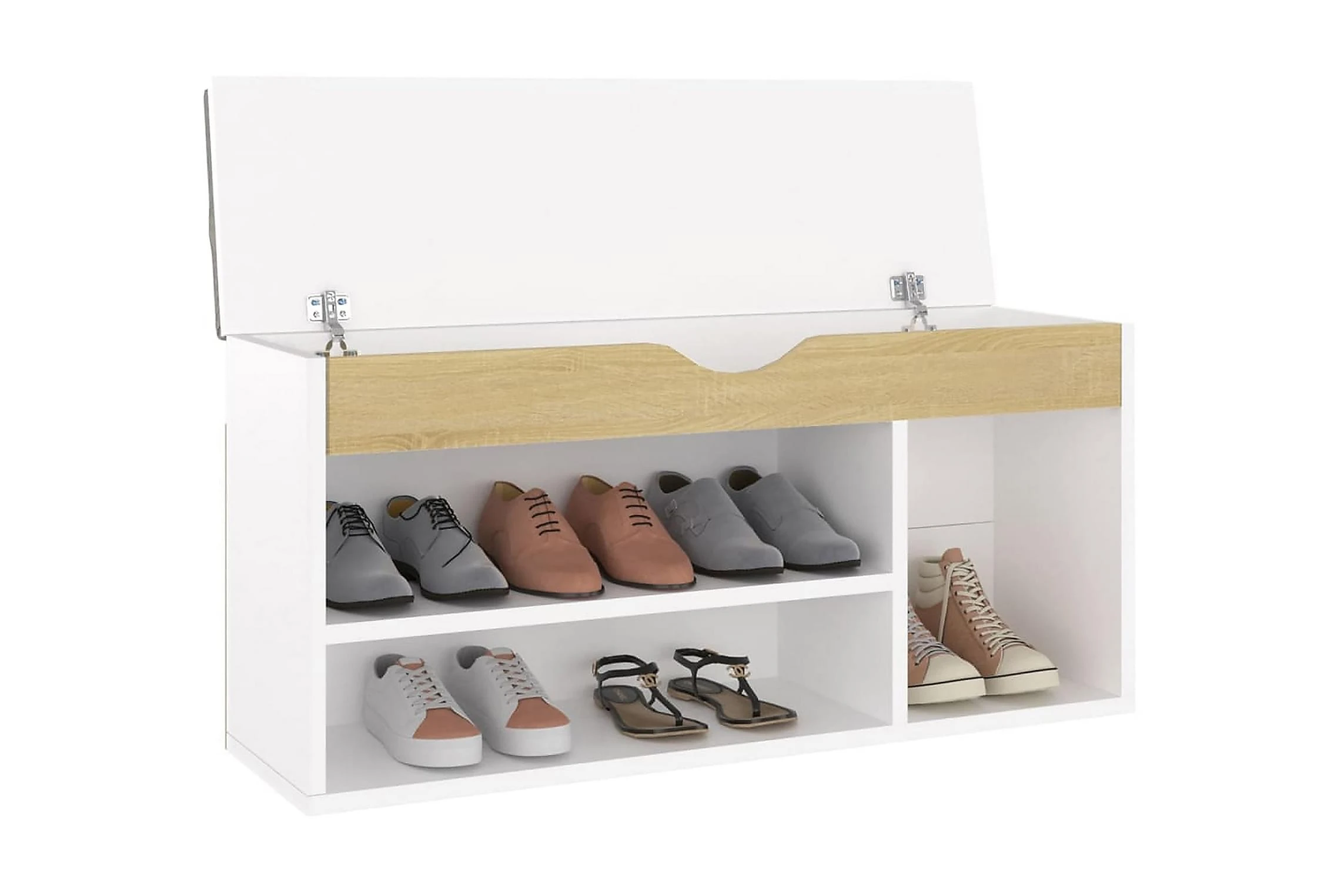 Skobänken har gott om plats att förvara skor. Den robusta ovansidan med avtagbar dyna låter dig sitta bekvämt när du tar på eller av skorna. Dessutom är den lätt att rengöra med en fuktig trasa. Förvaringsbänken är en mycket praktisk plats för att förvara skor snyggt.