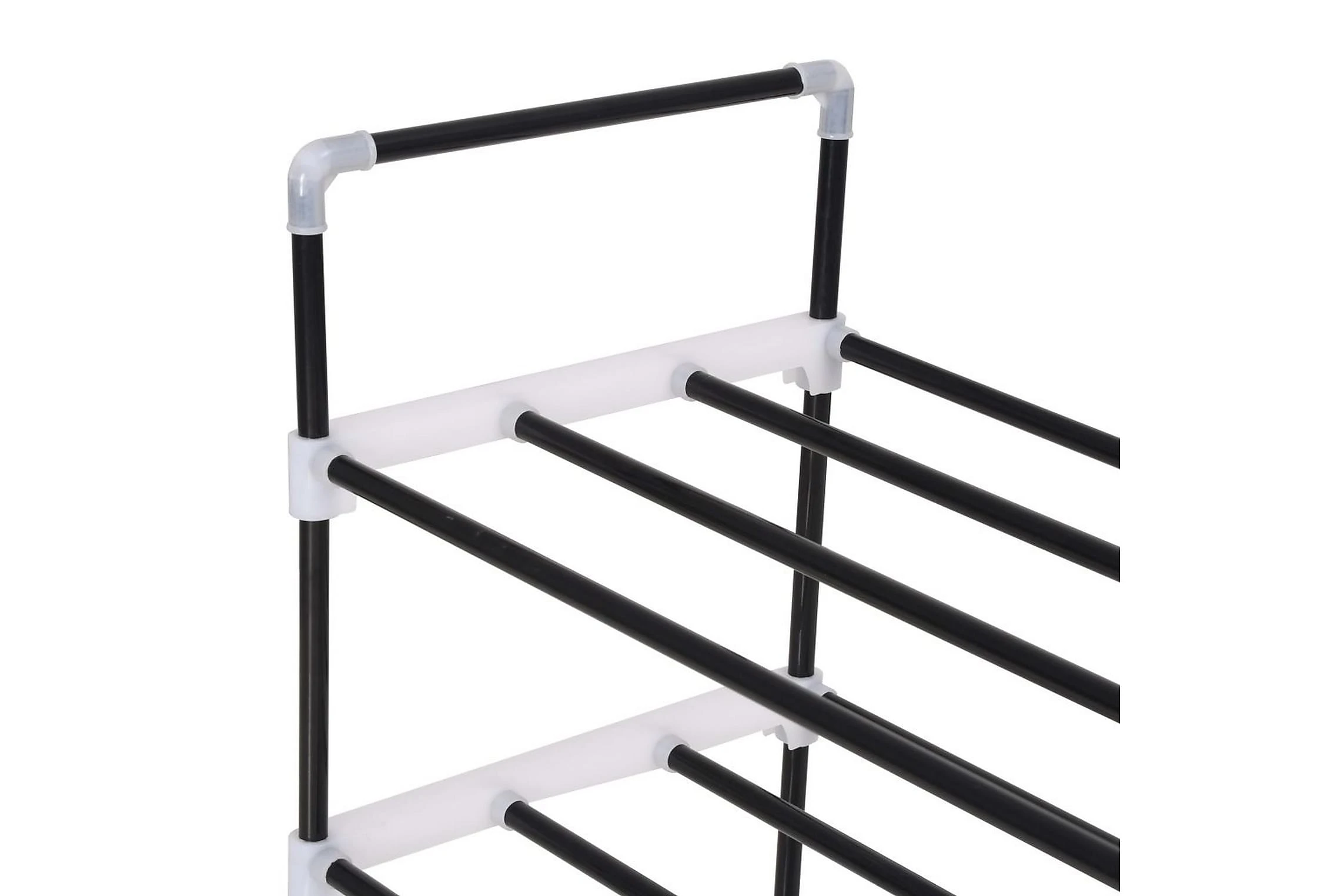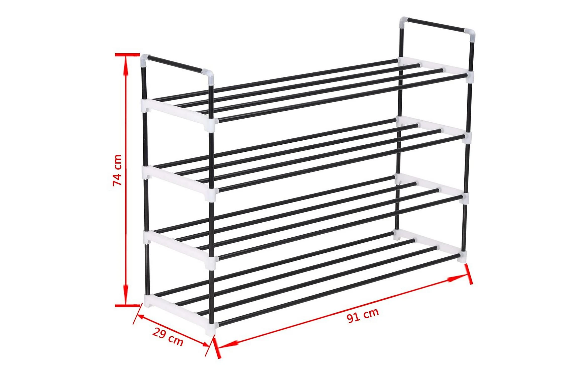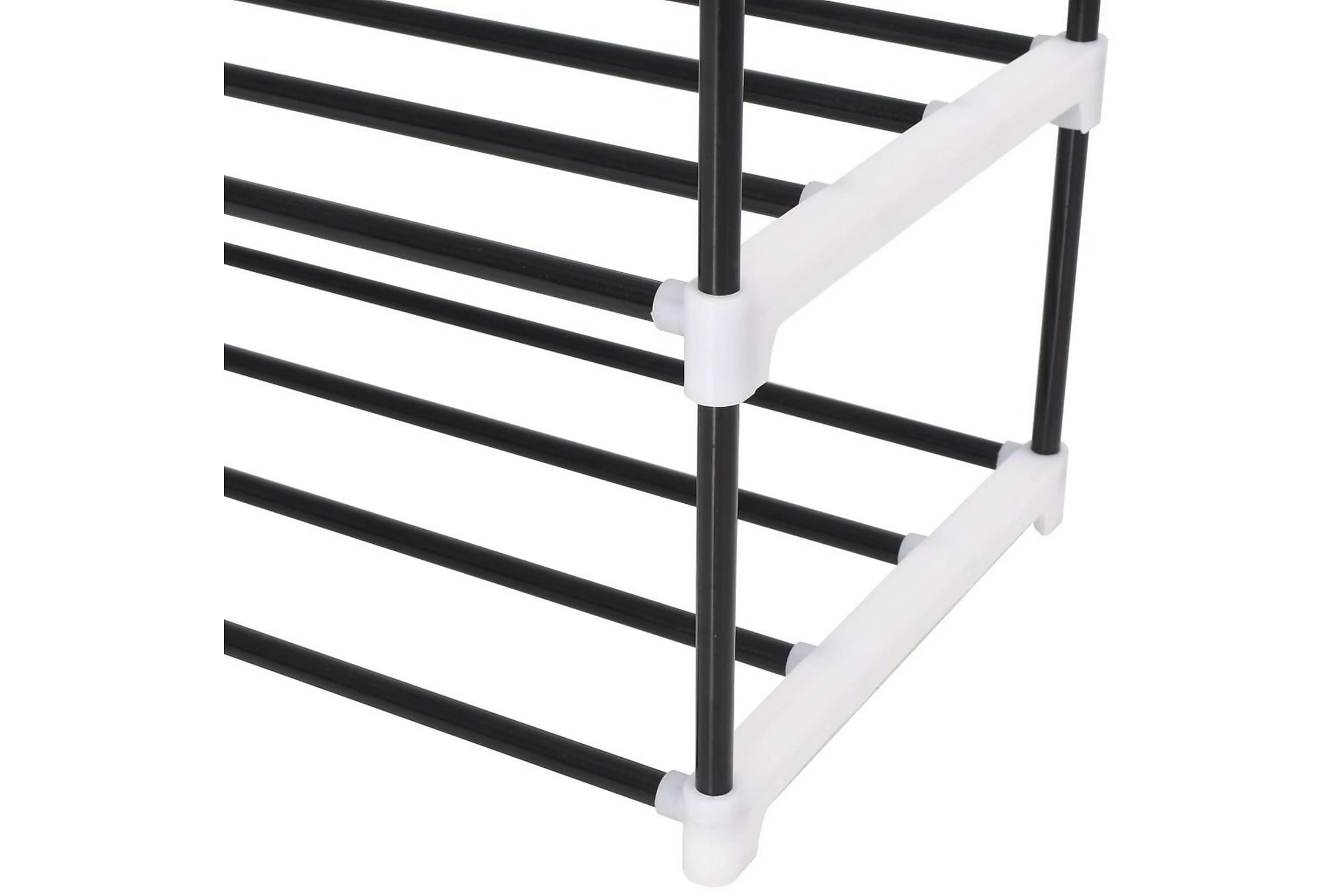 Den har en rörformad metallram, som är lätt men robust, vilket gör skostativet ganska hållbart och enkelt att flytta runt. Den har fyra generösa hyllor som har gott om utrymme för att hålla dina skor organiserade och ur vägen.