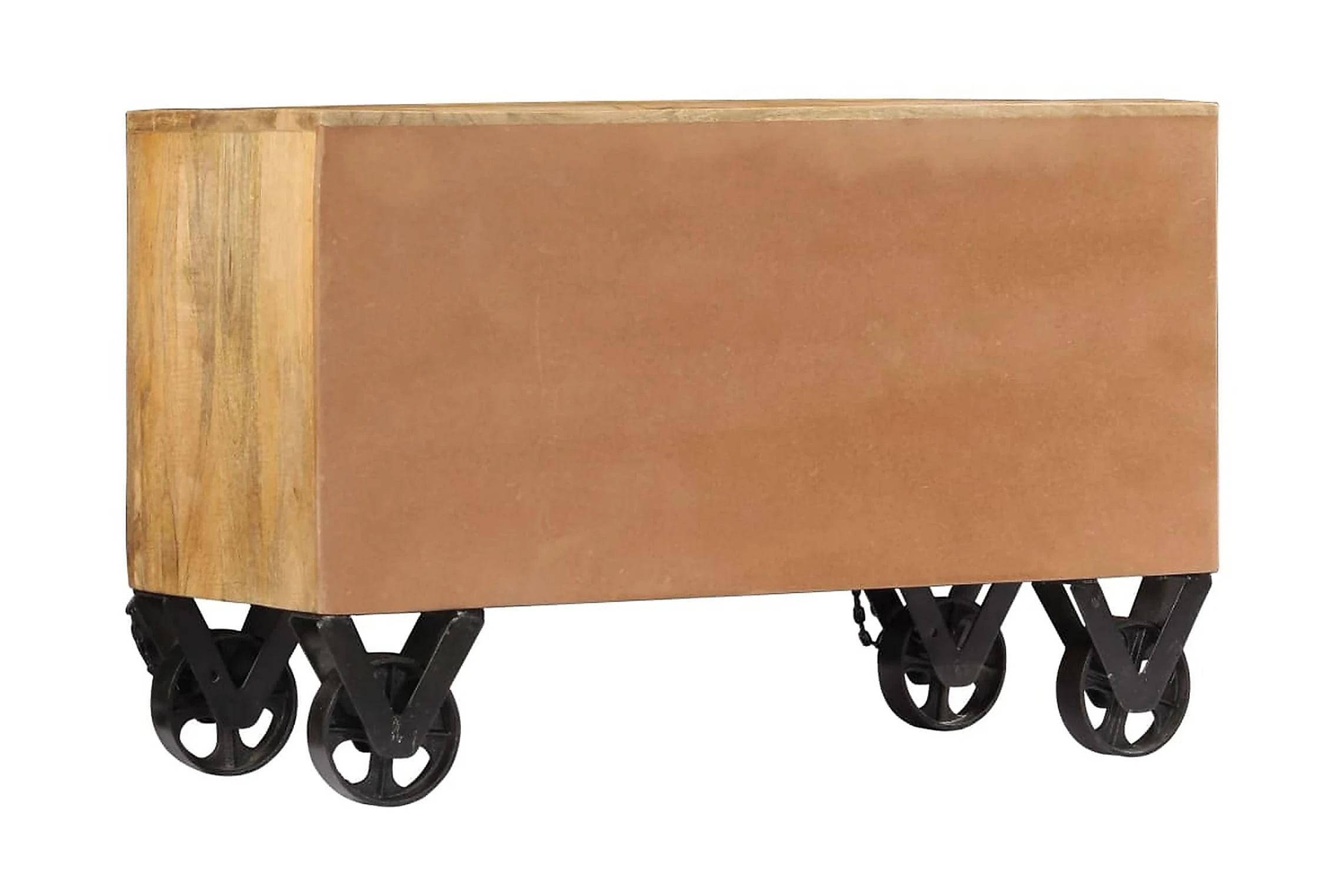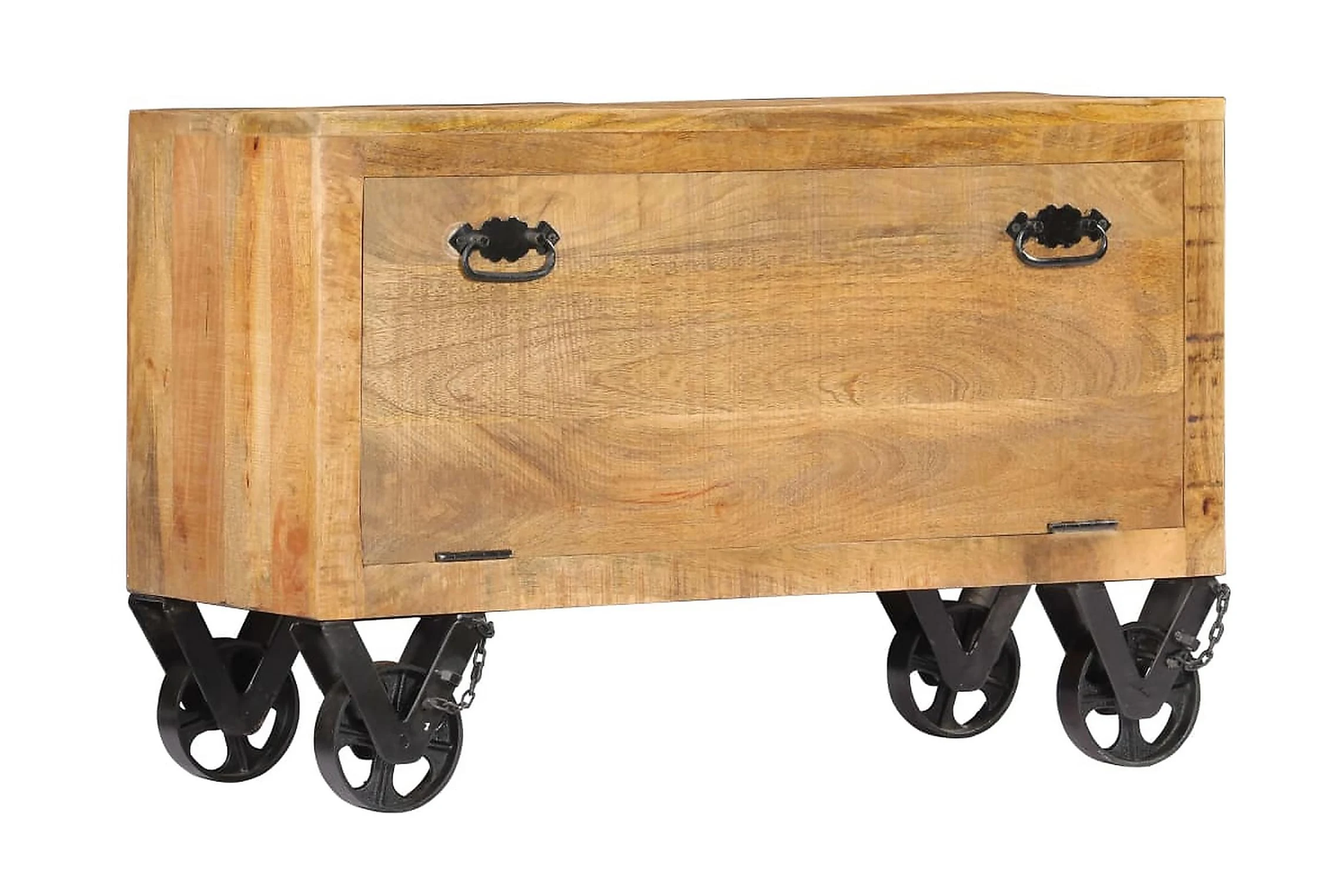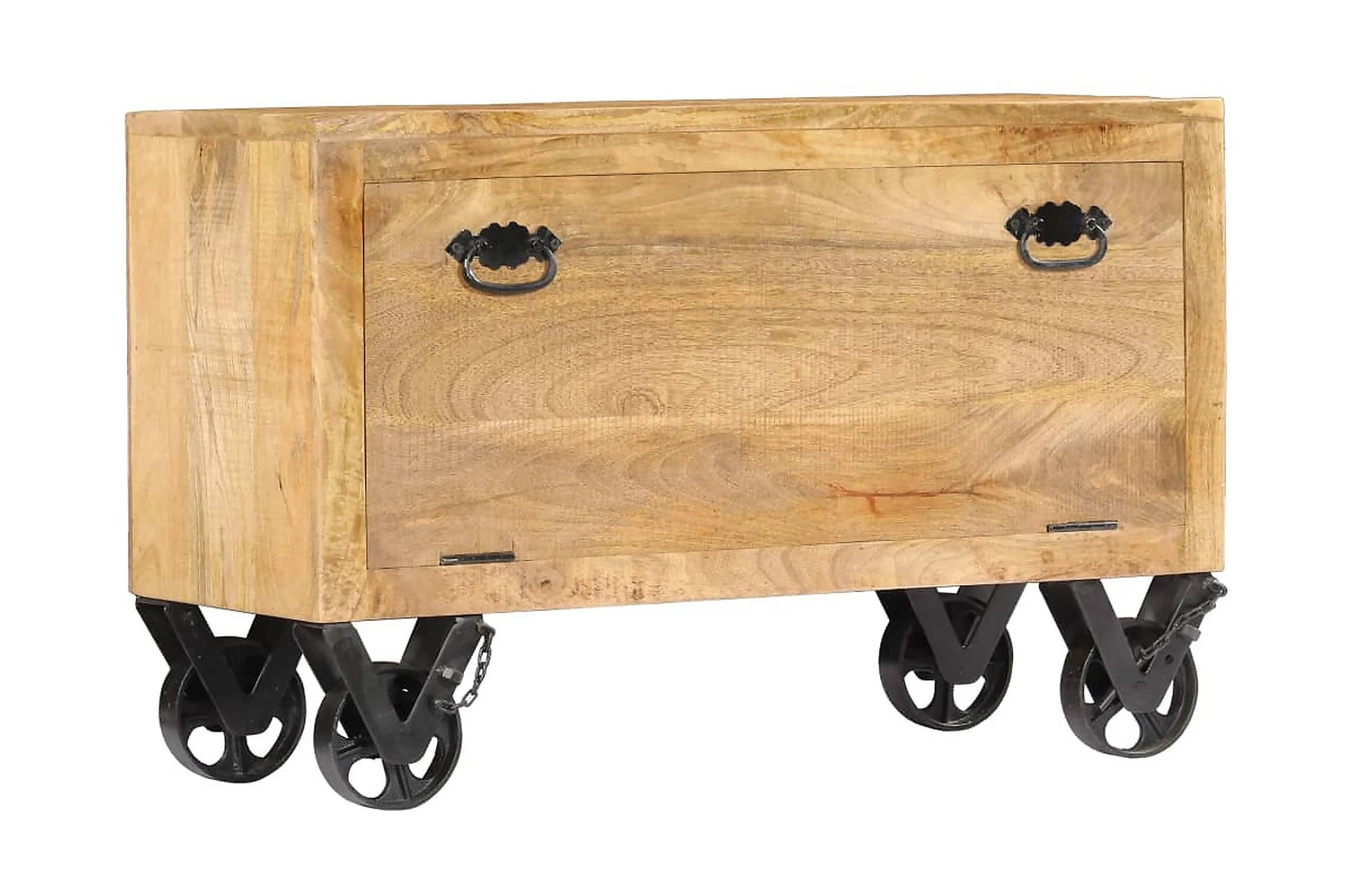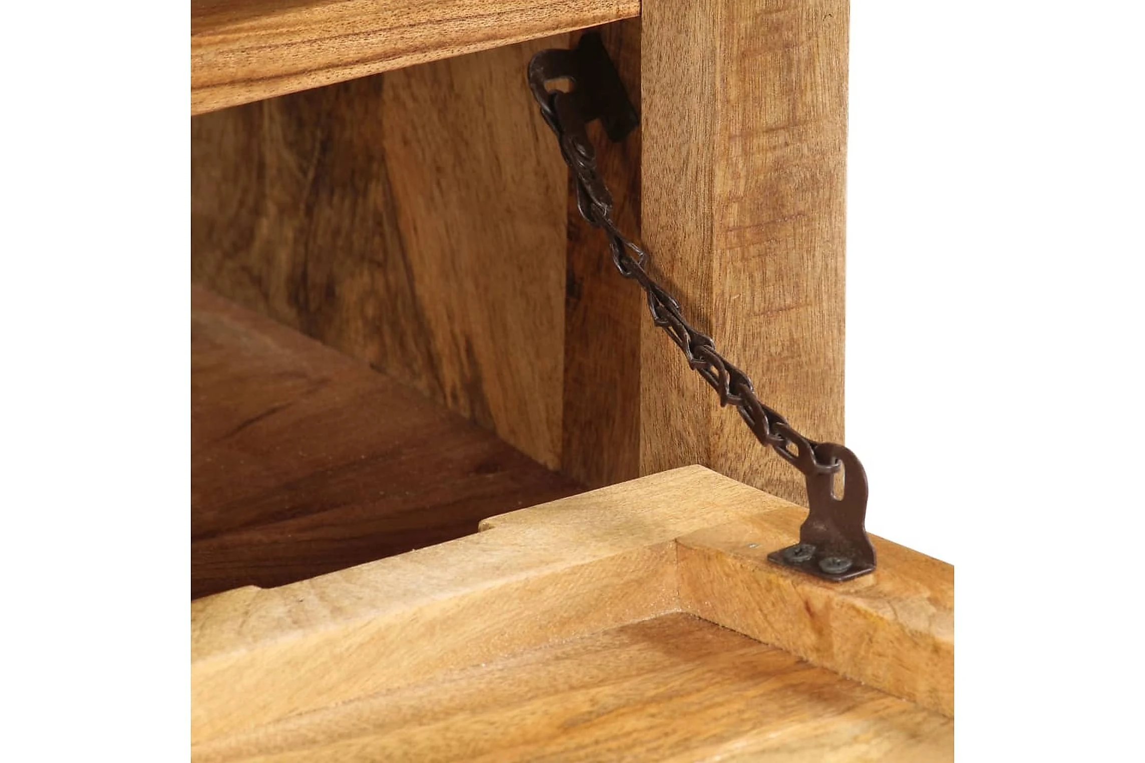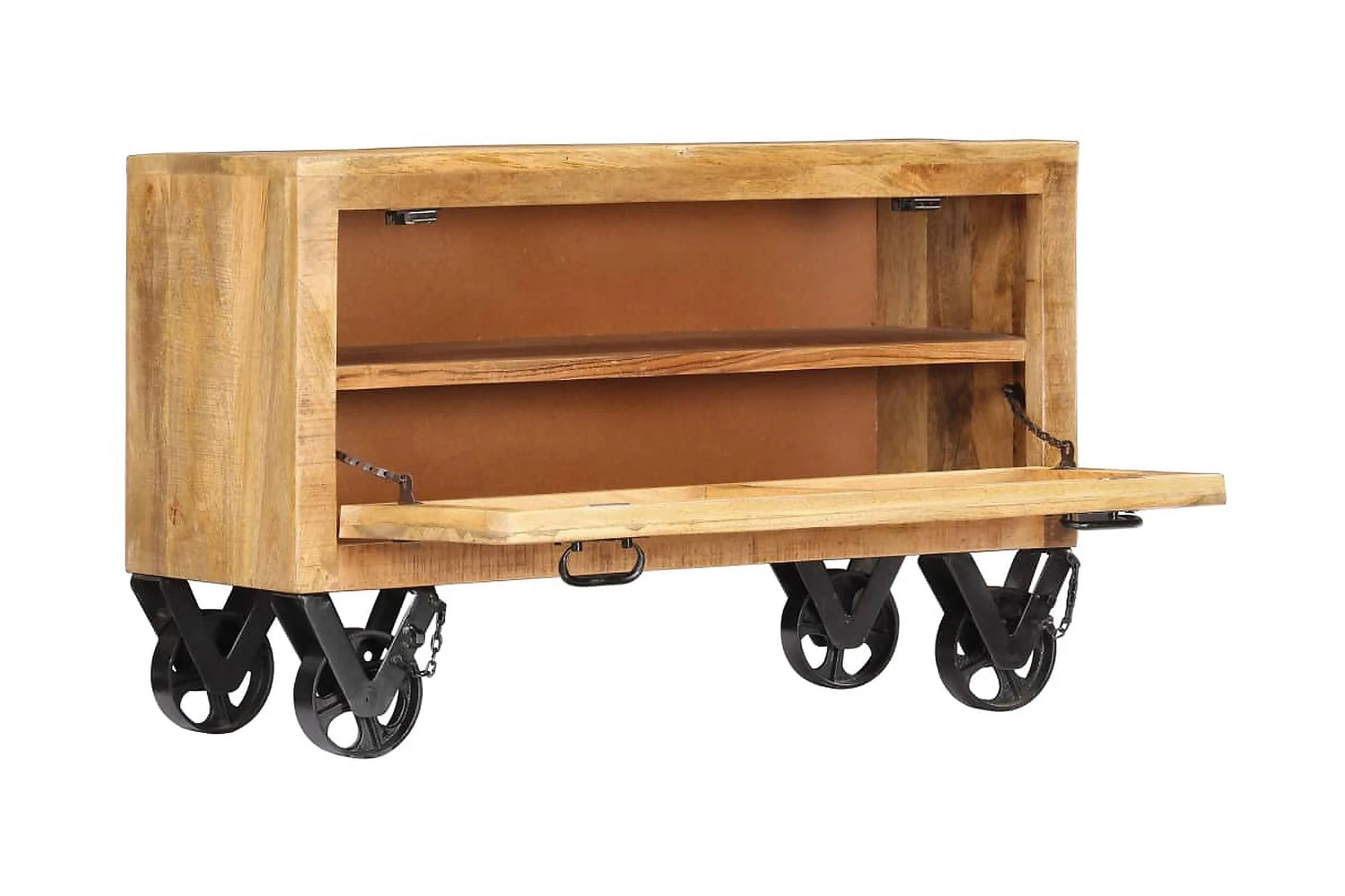 Detta skoskåp är tillverkat i massivt mangoträ, ett lövträ med täta ådringar. Grovt mangoträ har inte bara styrkan att bära vikten, det står även emot tidens tand. Hantverket och de eleganta träådringarna gör dessutom varje möbel distinkt och något annorlunda än nästa. Hallskåpet har 2 skåp med en dörr och därför gott om plats för att förvara dina skor. Sidoskåpet har dessutom 4 hjul så att det enkelt kan flyttas runt.