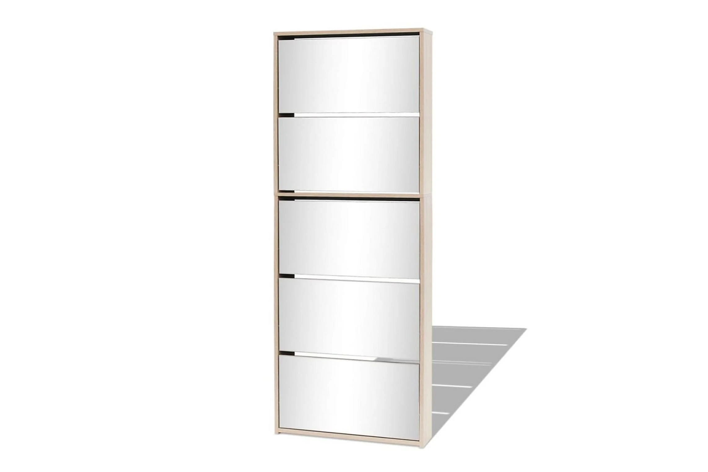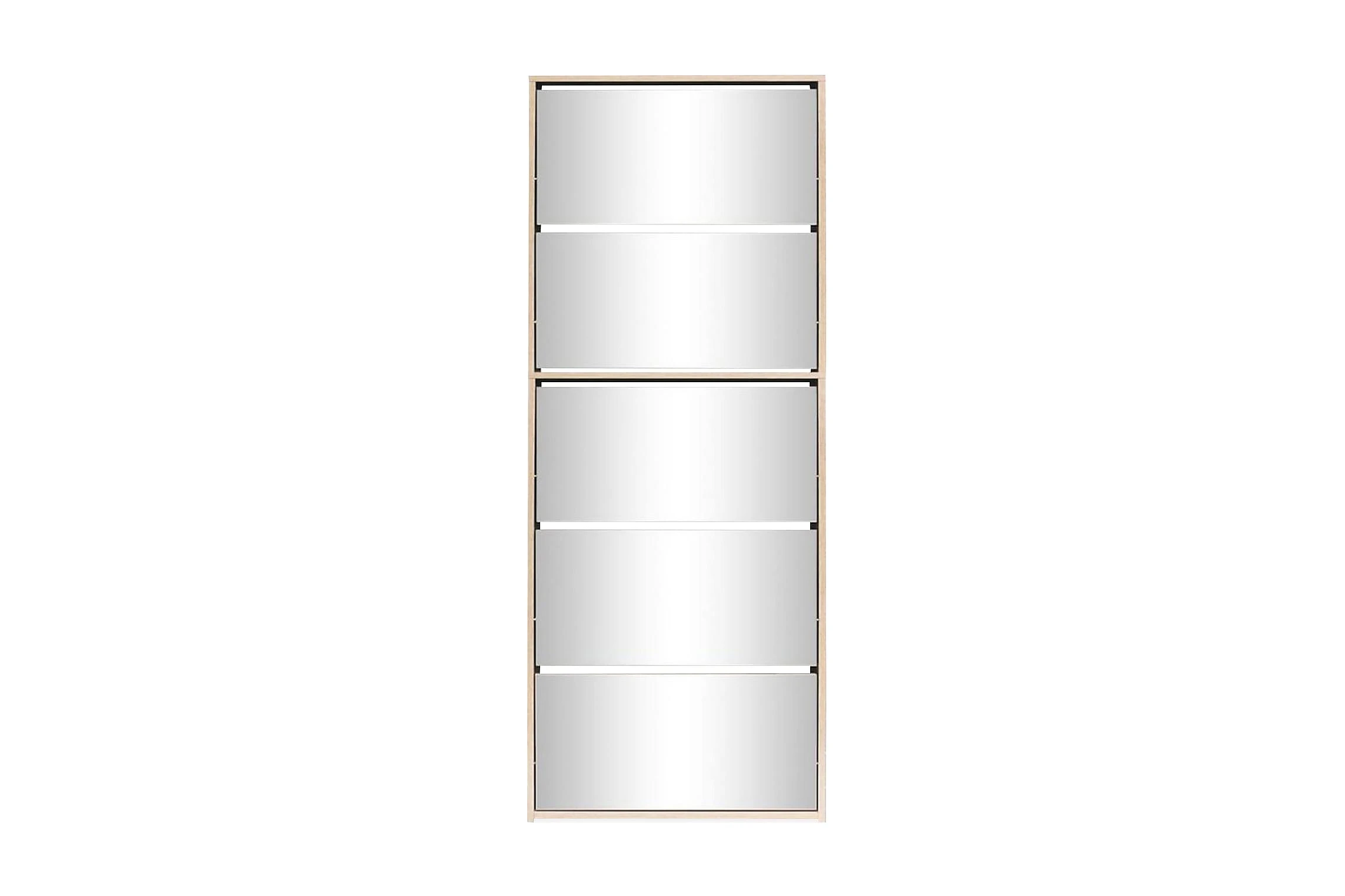 Skoskåpet med spegel har 5 lådor som dras ned, och varje låda har plats för 3 till 4 par skor. Skoskåpet monteras direkt på väggen. Det här är starka och hållbara skåpet är tillverkat i högkvalitativa material och är mycket praktiskt när du vill förvara dina skor på ett snyggt och välorganiserat sätt.