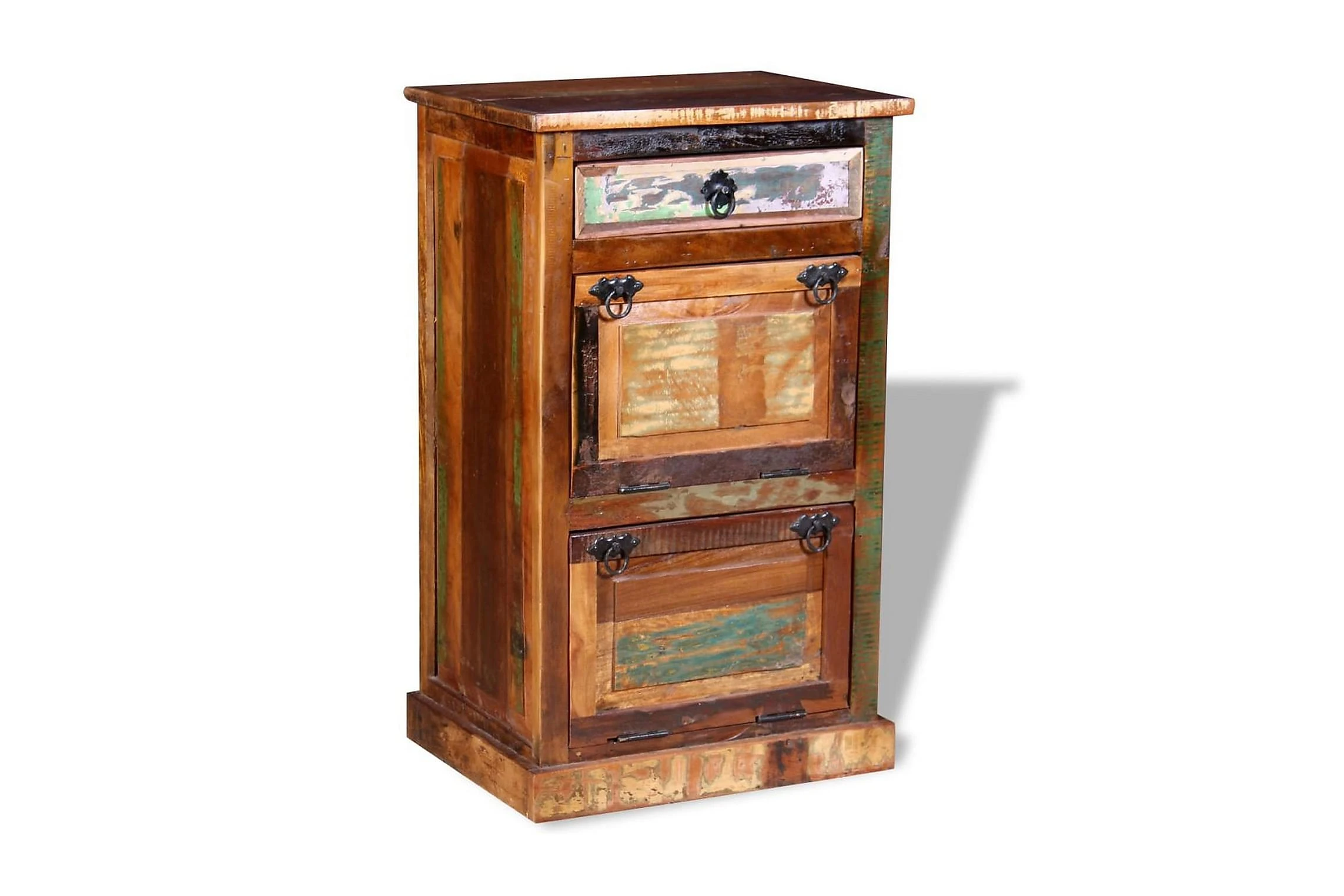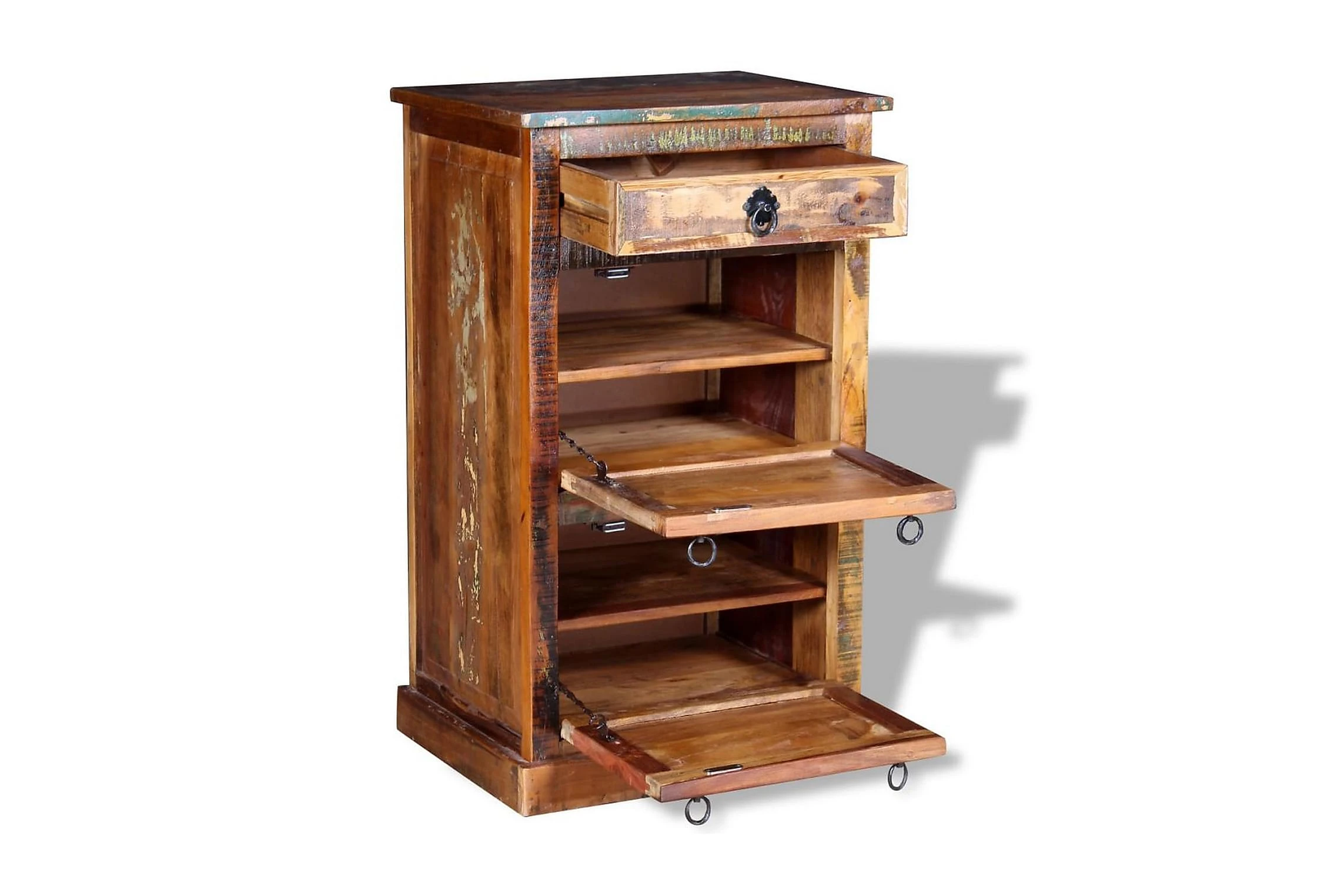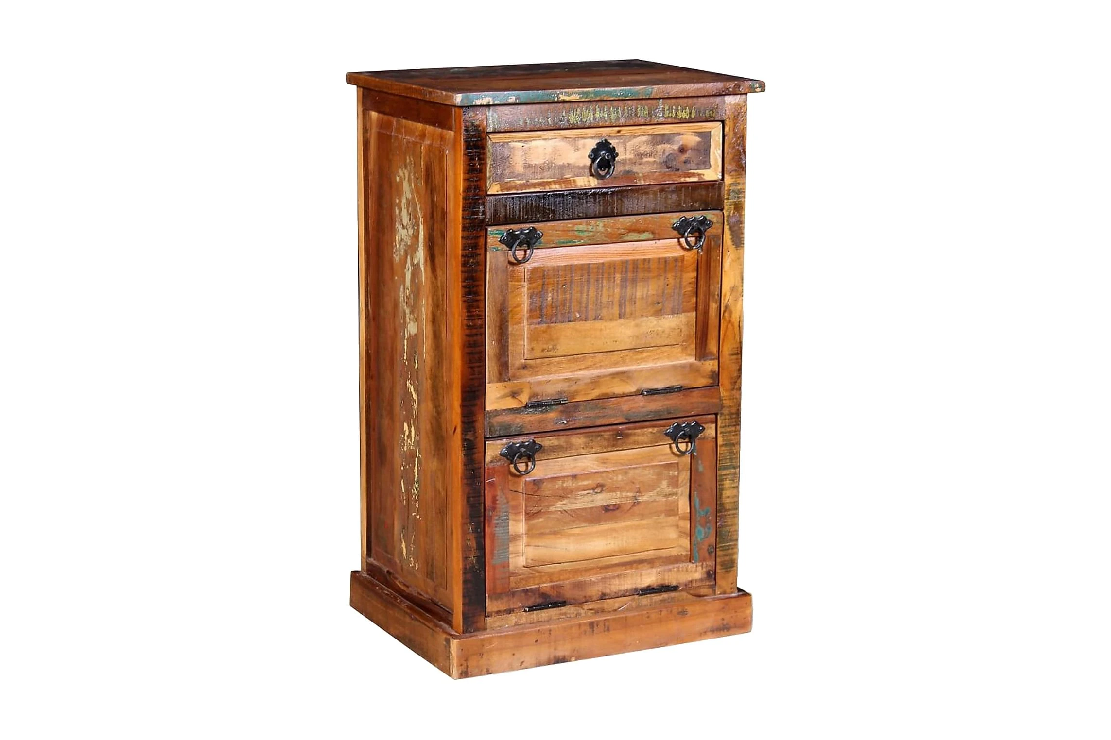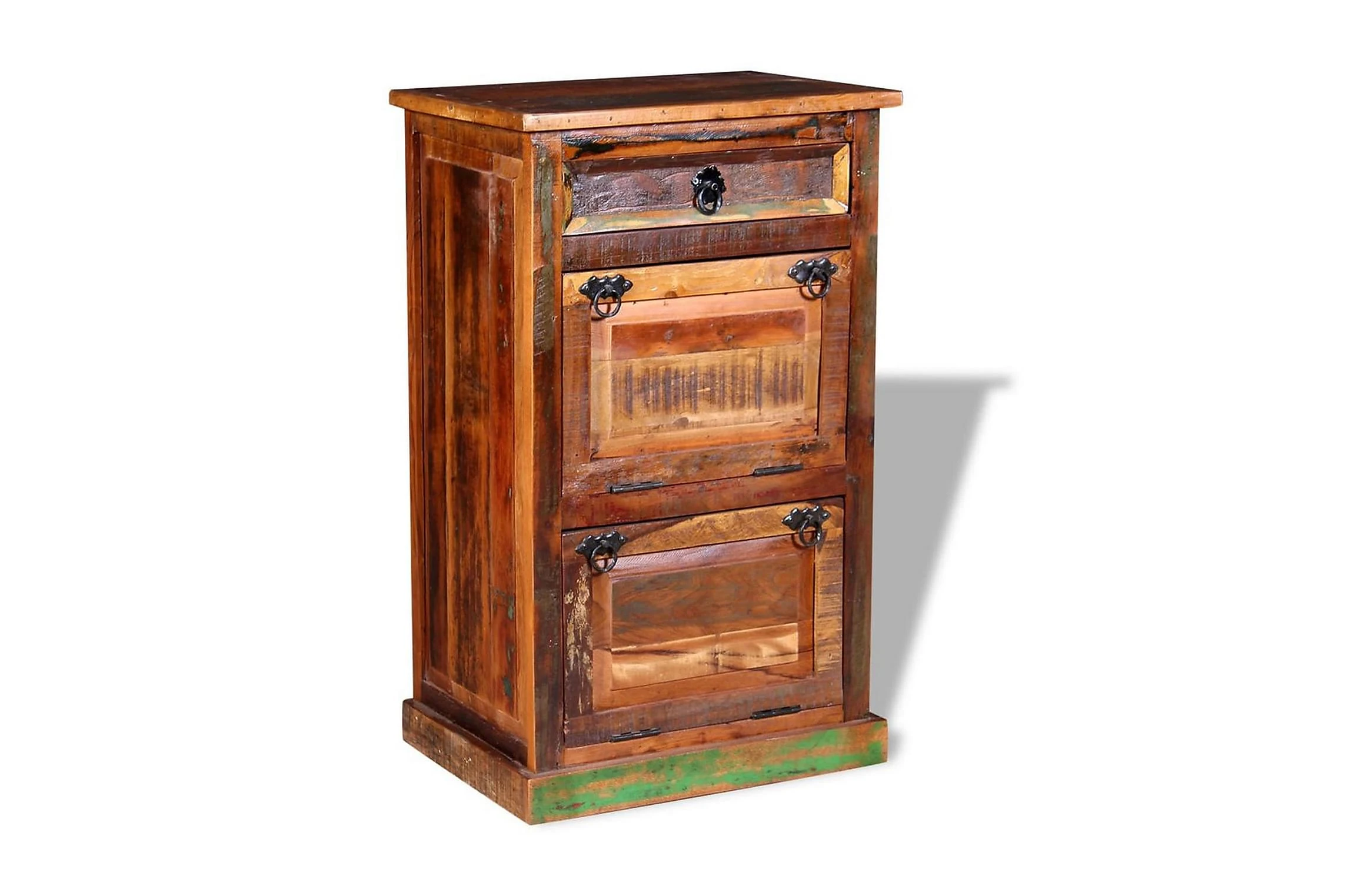 Detta skoskåp är tillverkat i återvunnet trä vilket gör det massivt, hållbart och vackert, och ger det en karaktär av olika träslag såsom teakträ, mangoträ, akacia, återvunnet trä, ädelträ, etc. Detta gör varje möbel unik och att den skiljer sig lite från resten. Tecken på slitage och synliga träfibrer ger varje skoskåp ett unikt utseende och spär på dess spektakulära vintagestil.