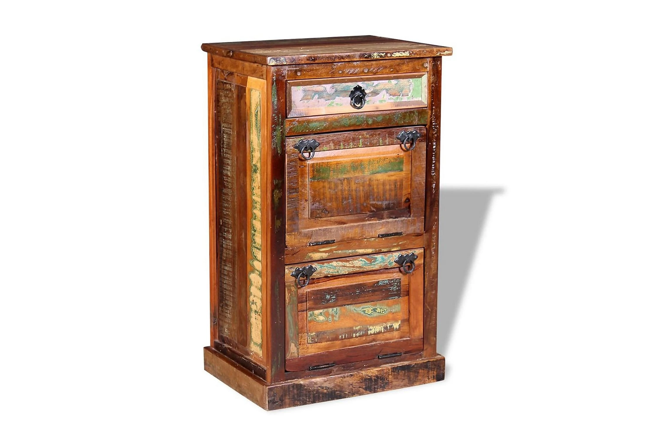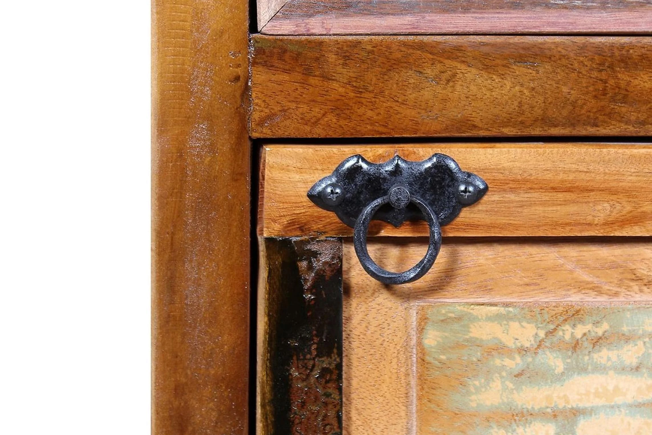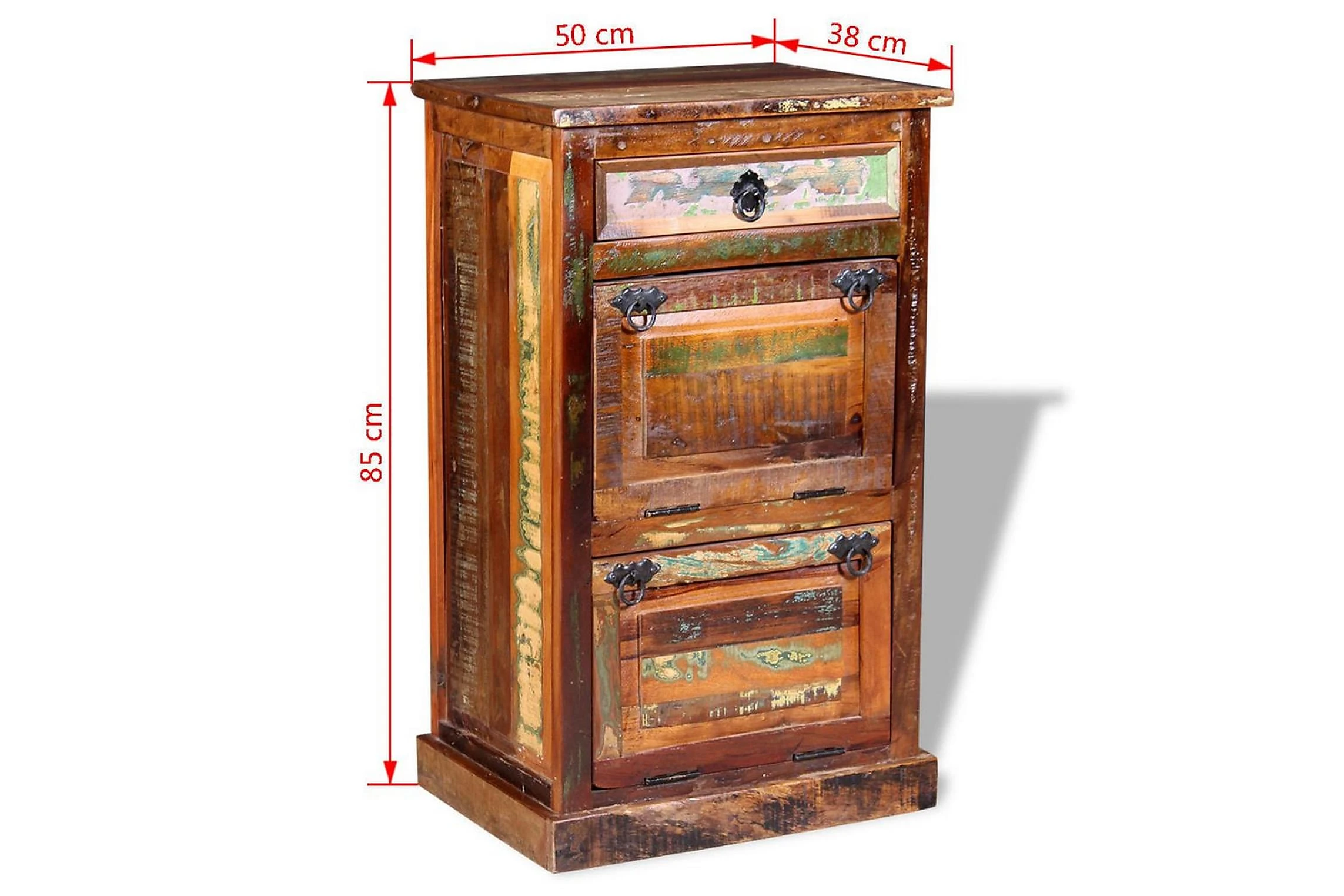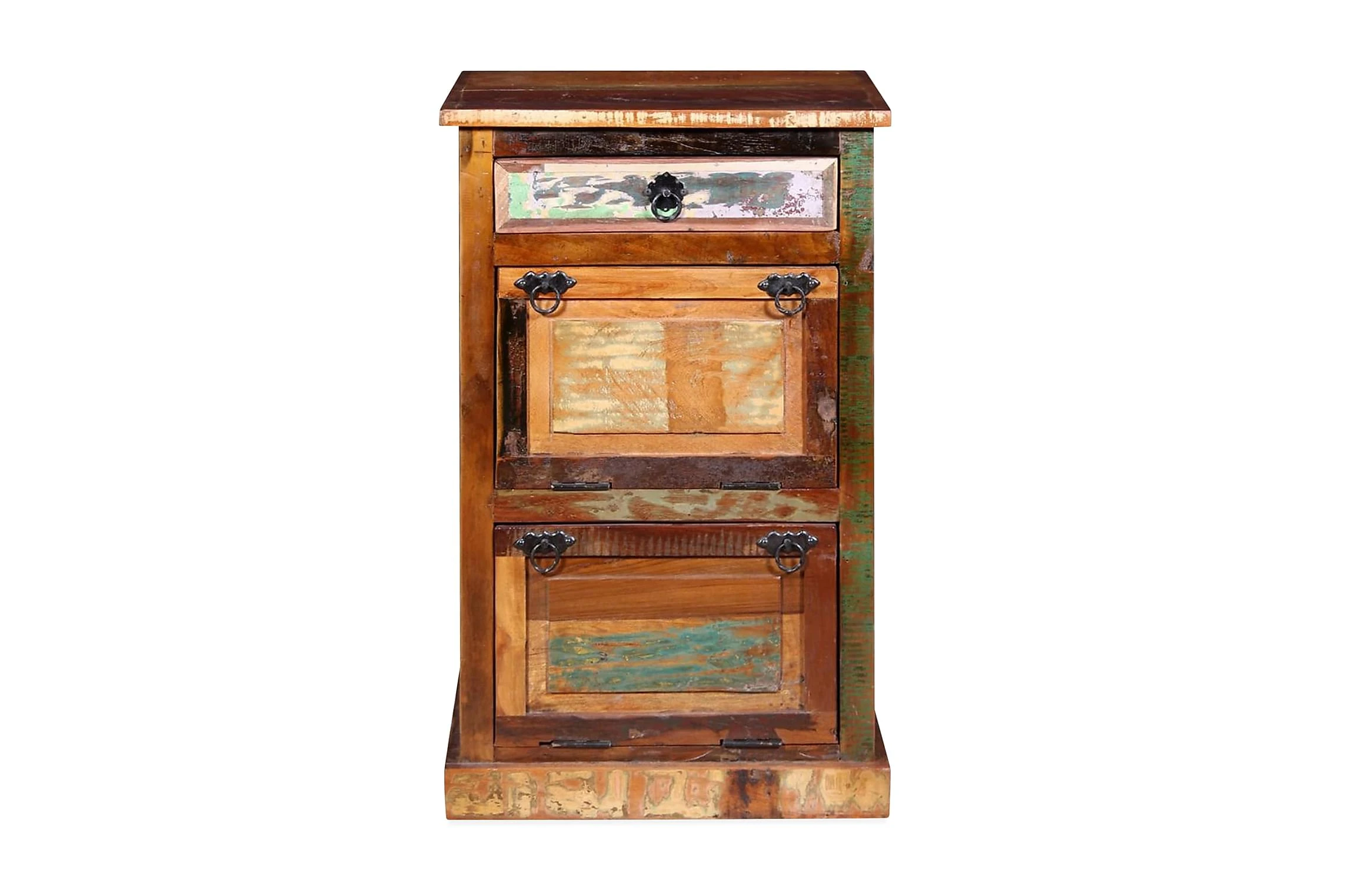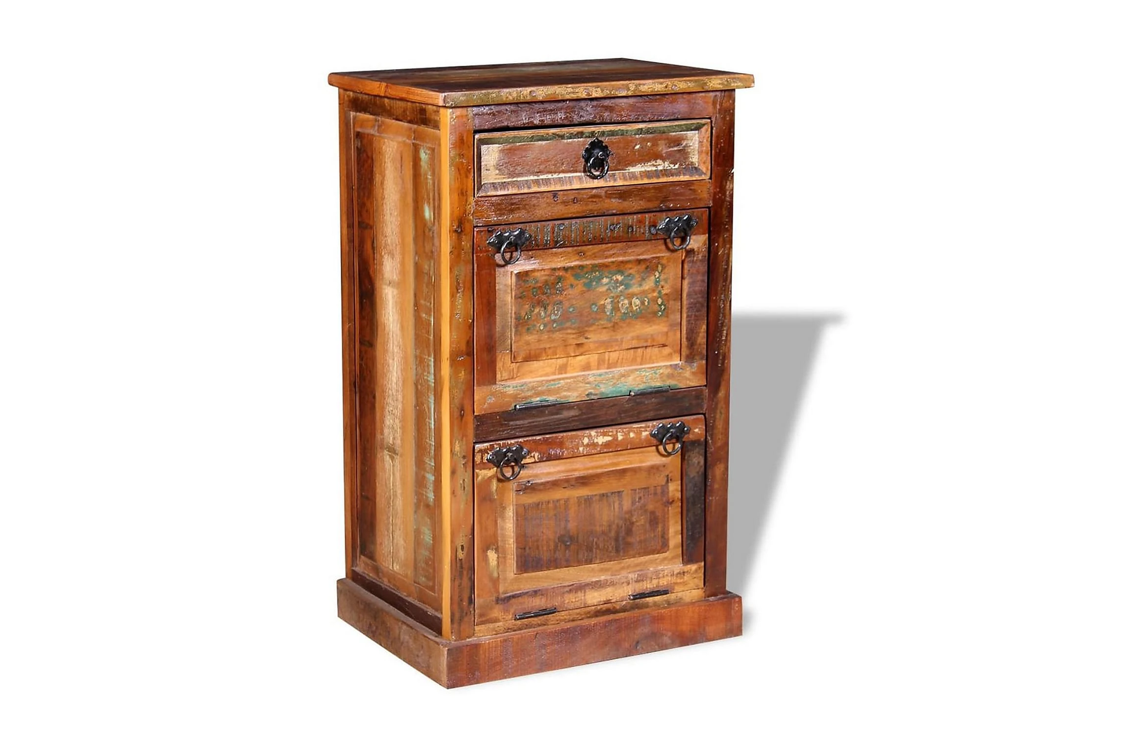 Detta skoskåp är tillverkat i återvunnet trä vilket gör det massivt, hållbart och vackert, och ger det en karaktär av olika träslag såsom teakträ, mangoträ, akacia, återvunnet trä, ädelträ, etc. Detta gör varje möbel unik och att den skiljer sig lite från resten. Tecken på slitage och synliga träfibrer ger varje skoskåp ett unikt utseende och spär på dess spektakulära vintagestil.