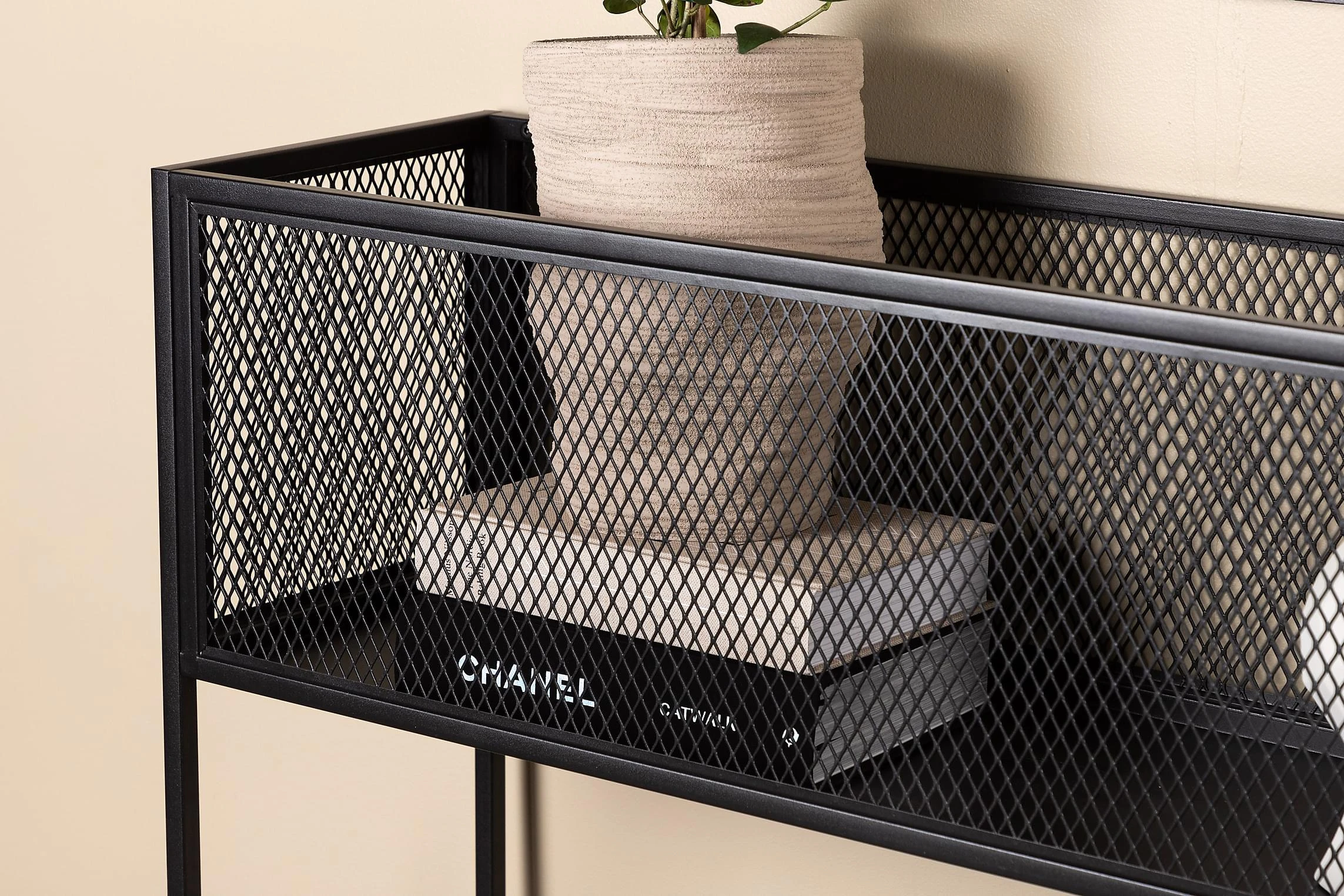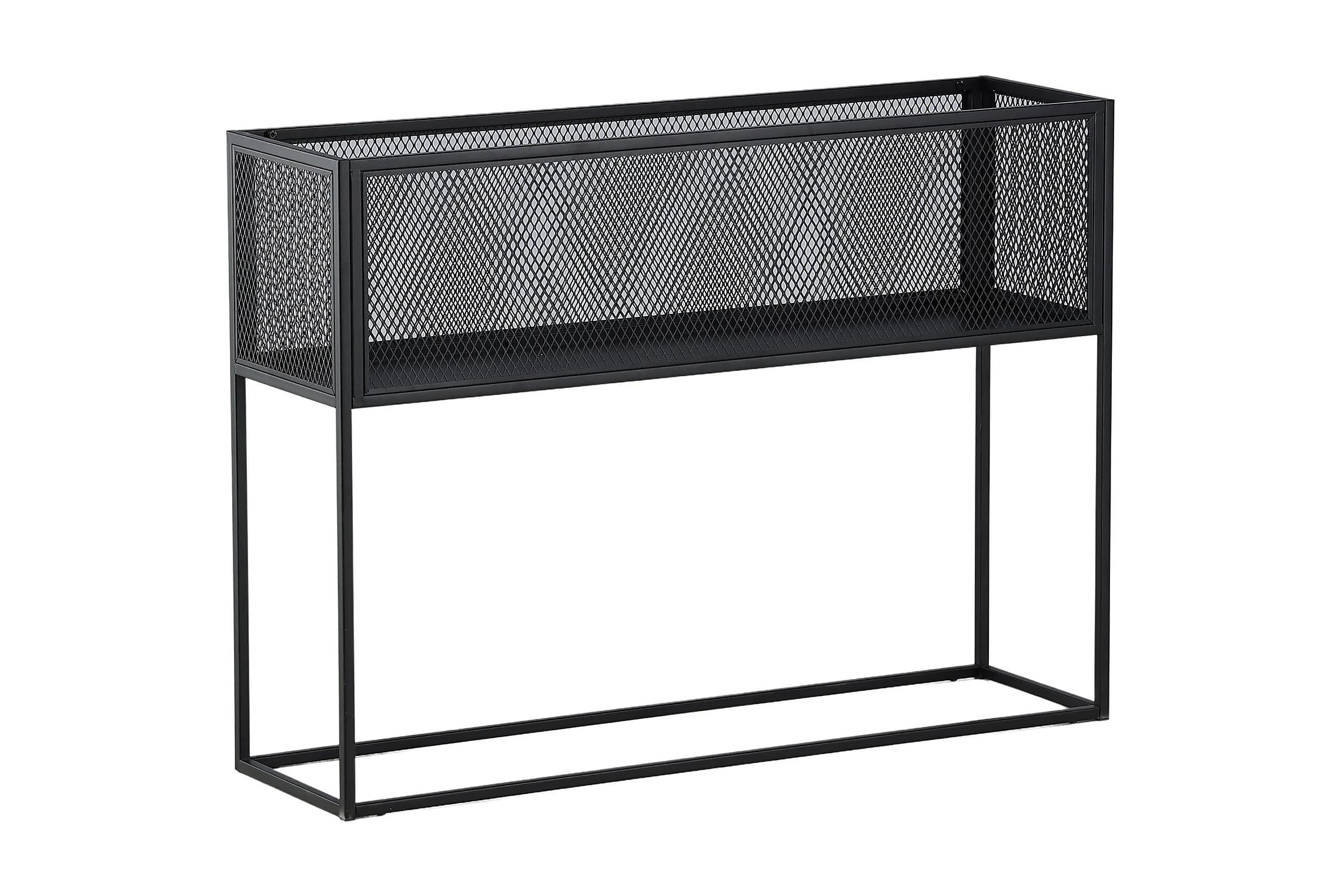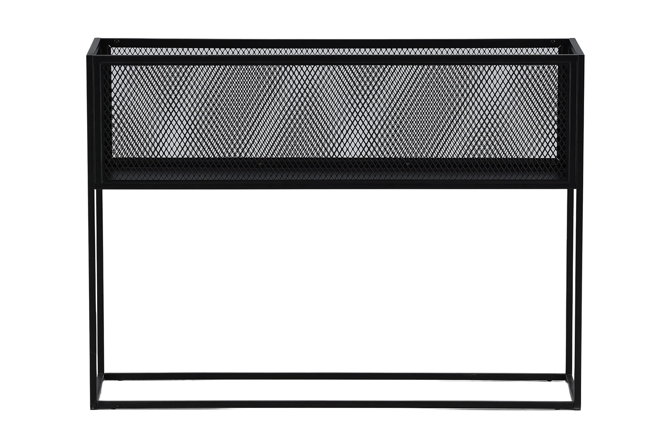 Möblera hemmet modernt och smart med hjälp av Netz avlastningshylla! Det här läckra sidobordet/hyllan har en smäcker industriell design med ett hyllplan för förvaring, nätsidor omkring hela förvaringsytan och smala höga ben i svart stål. Skåpets smidiga storlek och eleganta utsida gör den lättplacerad och passar bra in i de flesta rum i hemmet, så möblera efter egna behov och önskemål och pryd med vackra dekorationer, blommor eller annat som måste förvaras – bara fantasin sätter gränser!