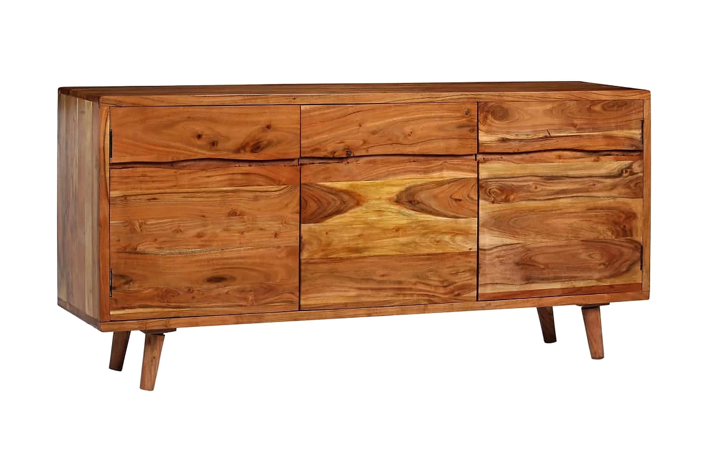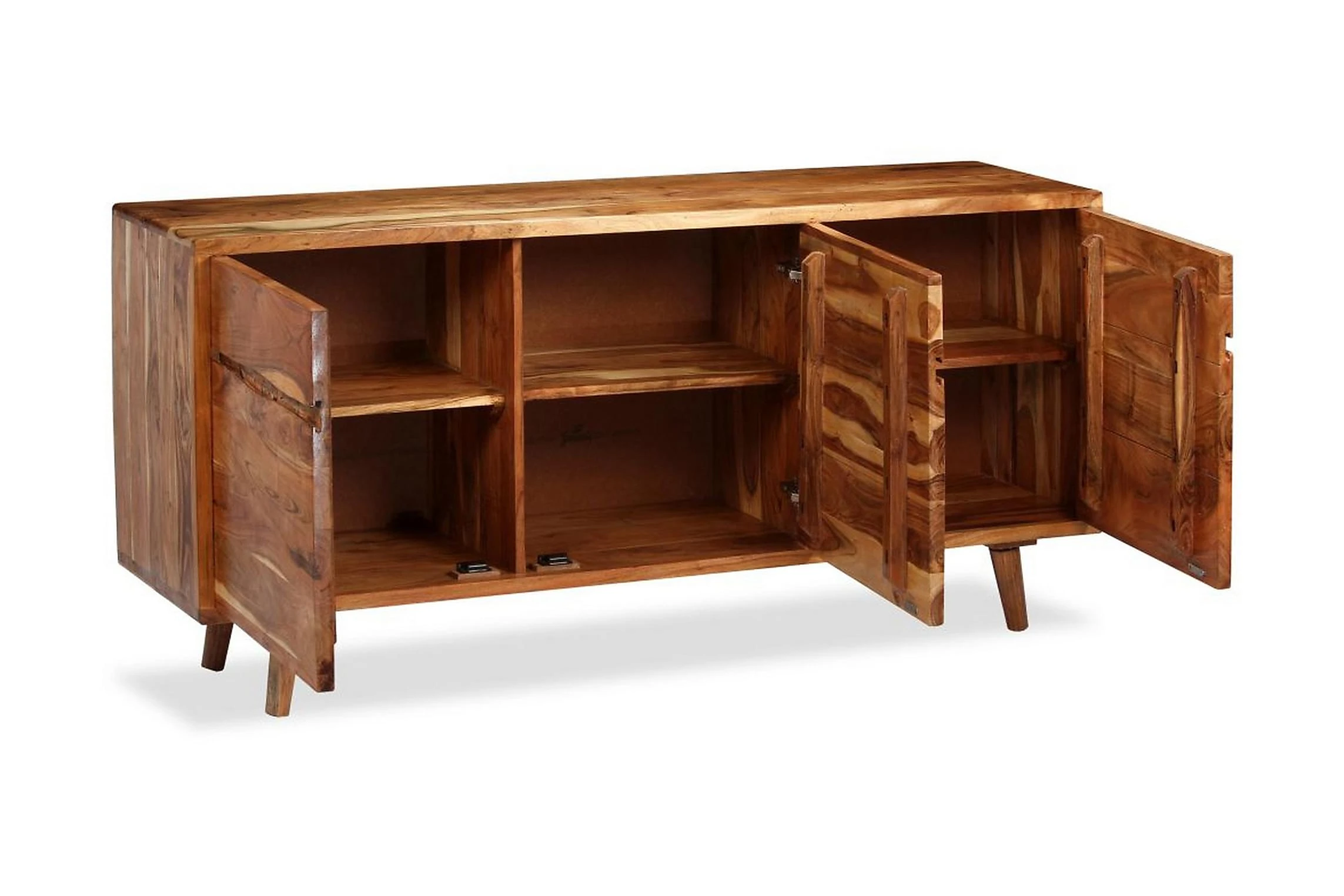 Skänken är tillverkad i massivt akaciaträ som har belagts med en vacker ytbehandling genom polering, målning och lackering för att få en elegant färg. Detta skåp är helt handgjort och de vackra träådringarna gör varje möbel unik. Skänken har en robust och stabil ovansida där du kan ställa dina vaser, fruktkorgar eller andra dekorativa föremål. Denna skänk har 3 skåp med snidade dörrar, som har gott om utrymme för att hålla tidskrifter, böcker och andra föremål inom räckhåll. Monteringen är enkel.