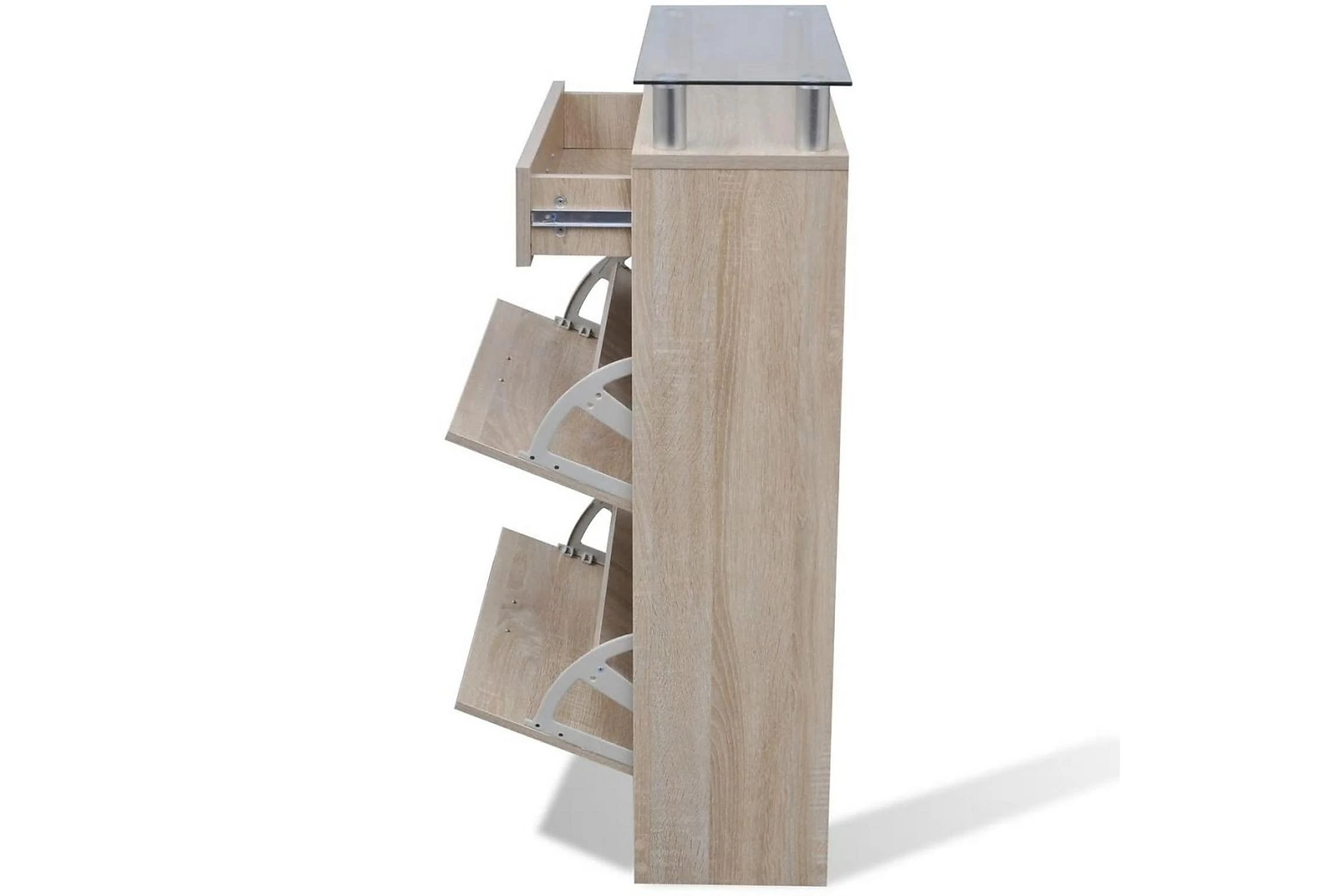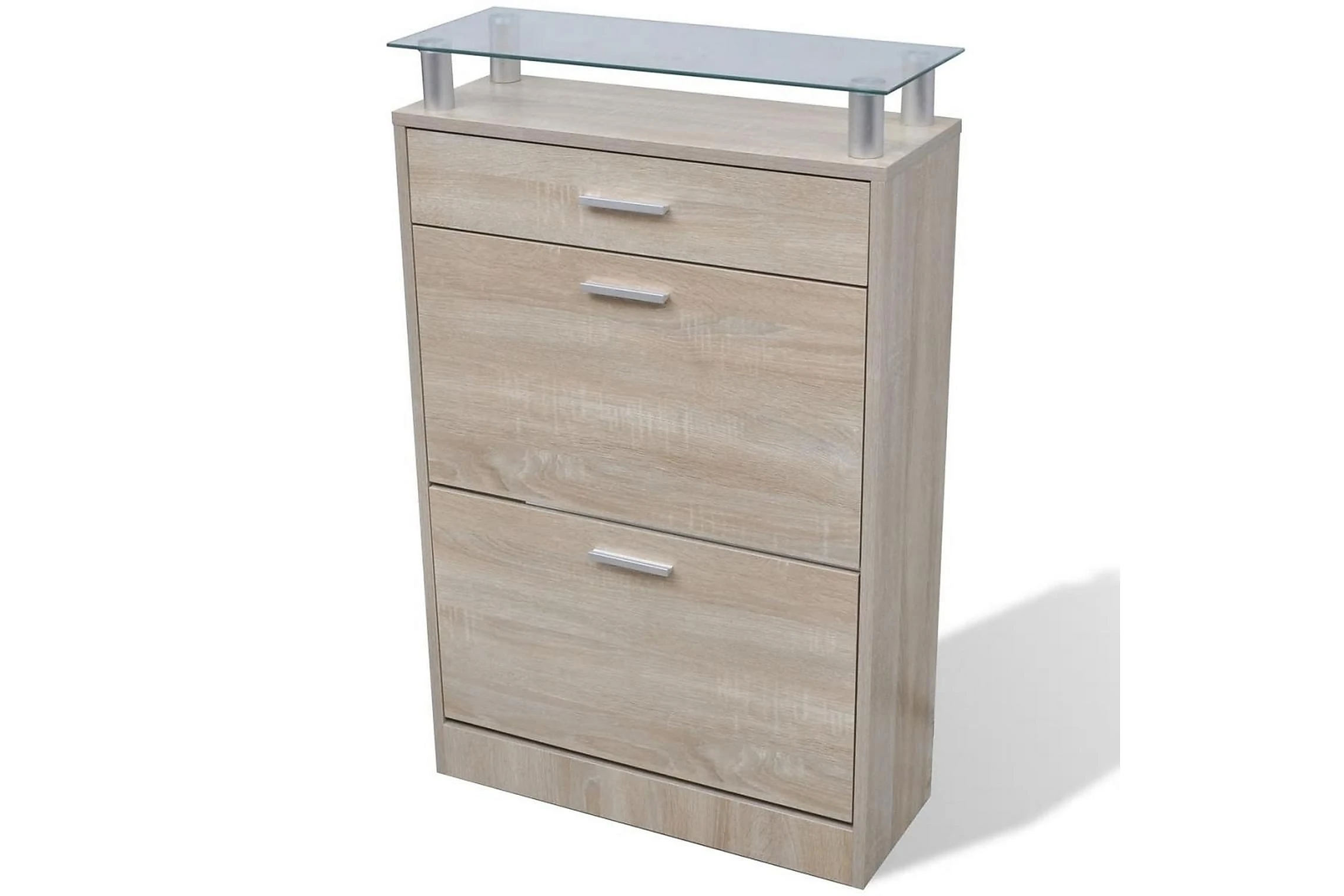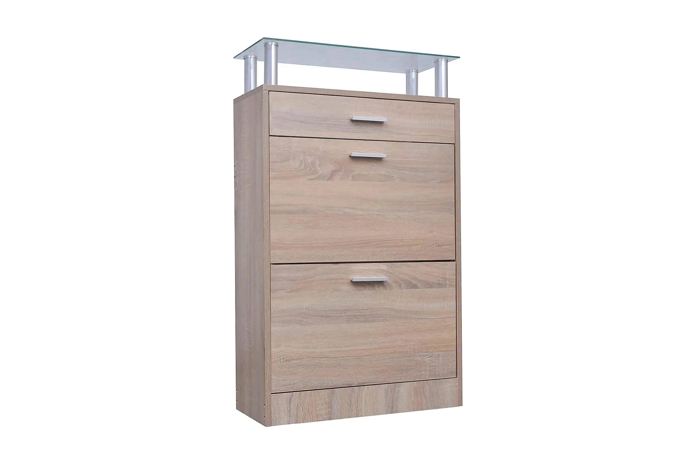 Den här skohyllan har en låda, en glasplatta och 2 förvaringsutrymmen och en enkel men elegant design. Du kommer inte längre behöva irriteras av skor som ligger överallt i hallen.