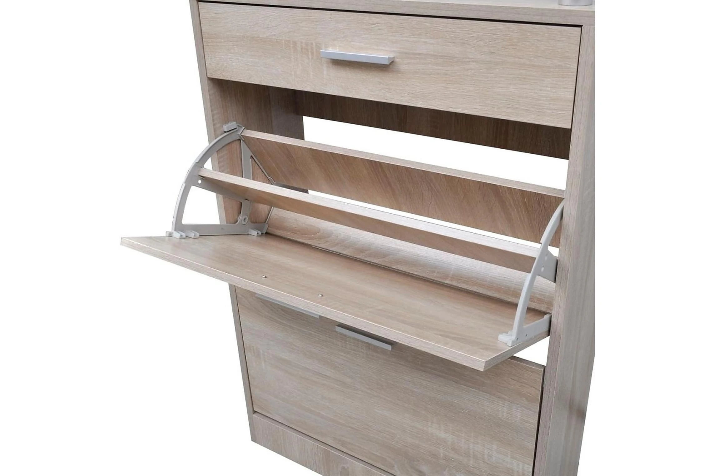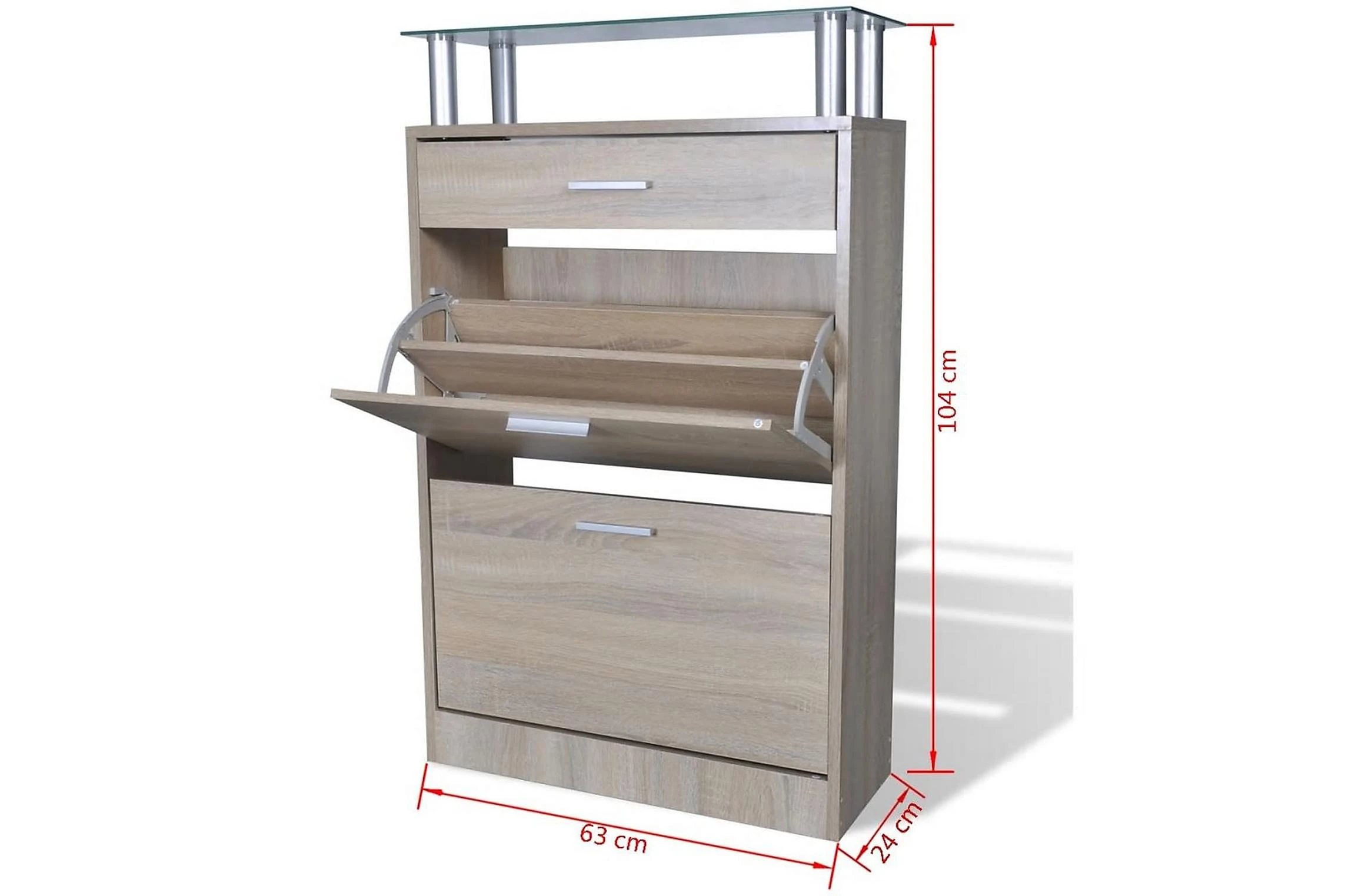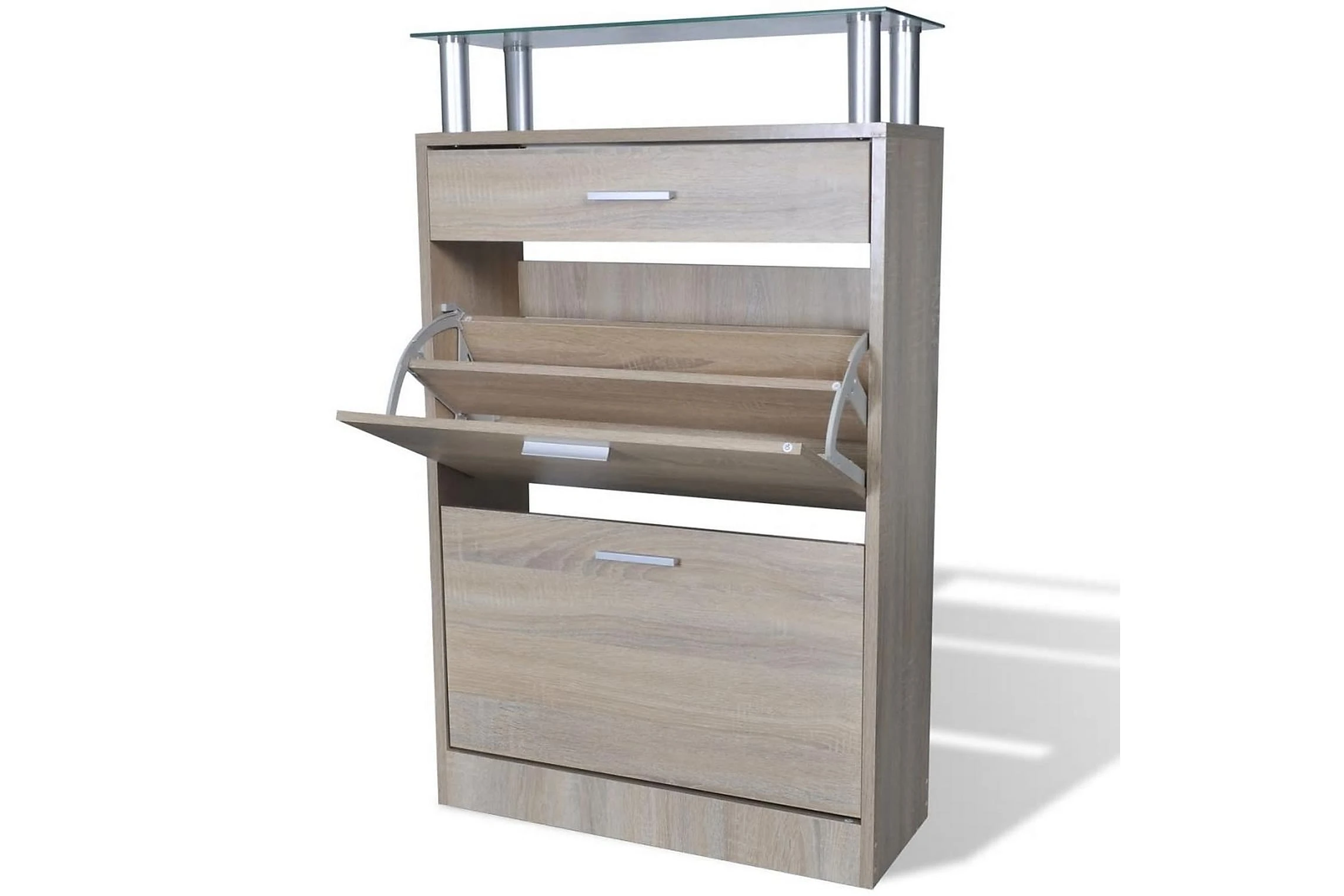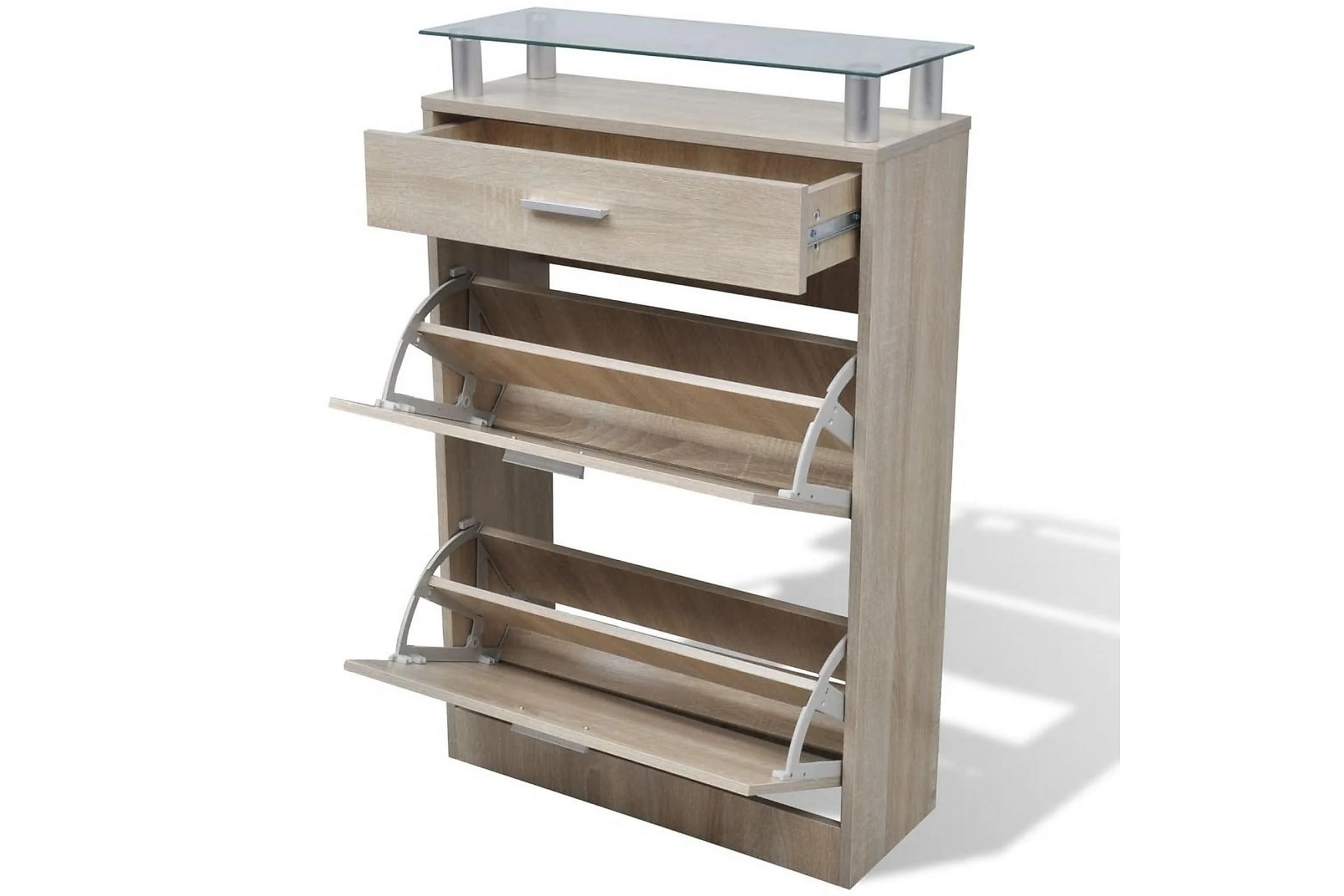 Den här skohyllan har en låda, en glasplatta och 2 förvaringsutrymmen och en enkel men elegant design. Du kommer inte längre behöva irriteras av skor som ligger överallt i hallen.