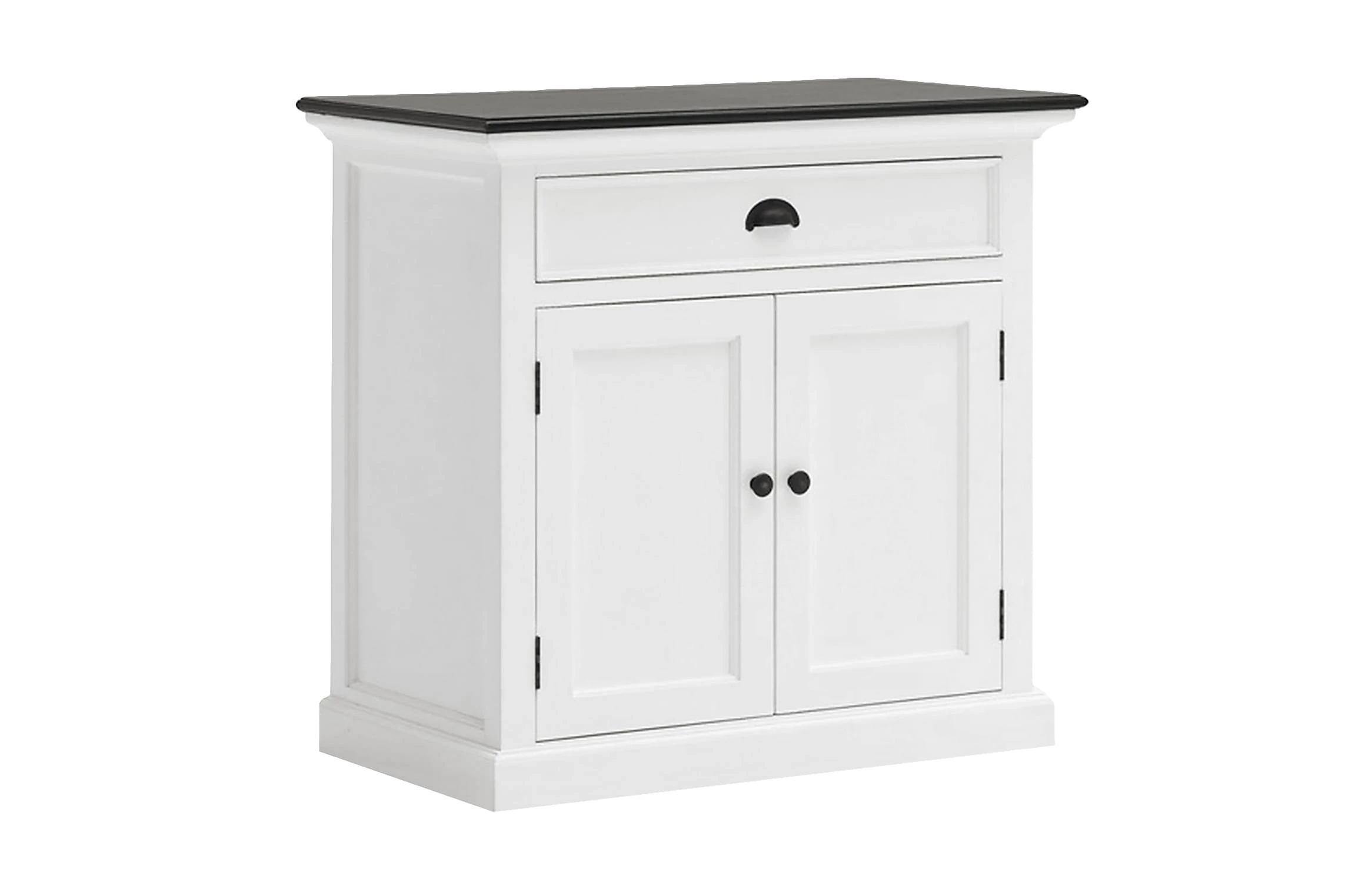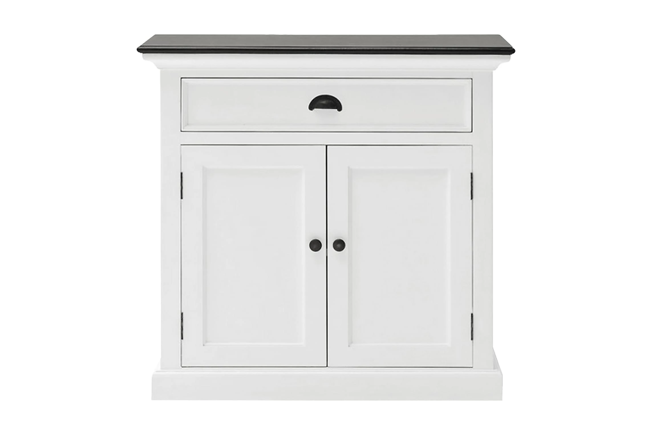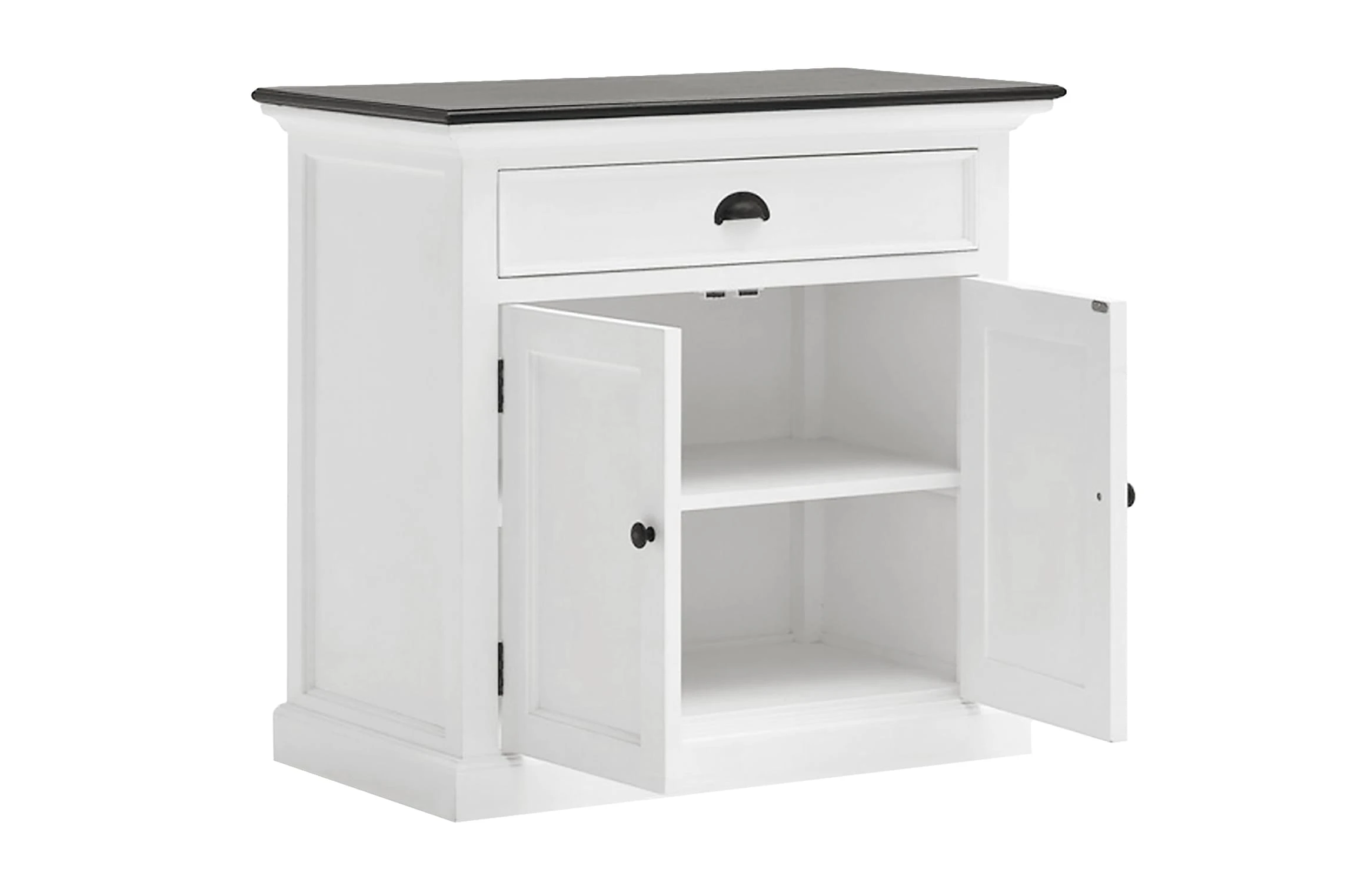 Halifax är en stilfull buffé med vackra detaljer så som handtag och knoppar i antik mässing samt en toppskiva i brunt. Det finns gott om förvaringsutrymmen med ett skåp och en större låda. Dekorera gärna skänkens avlastningsyta med personliga föremål som en extra inredningsdetalj i hemmet. Levereras monterad.