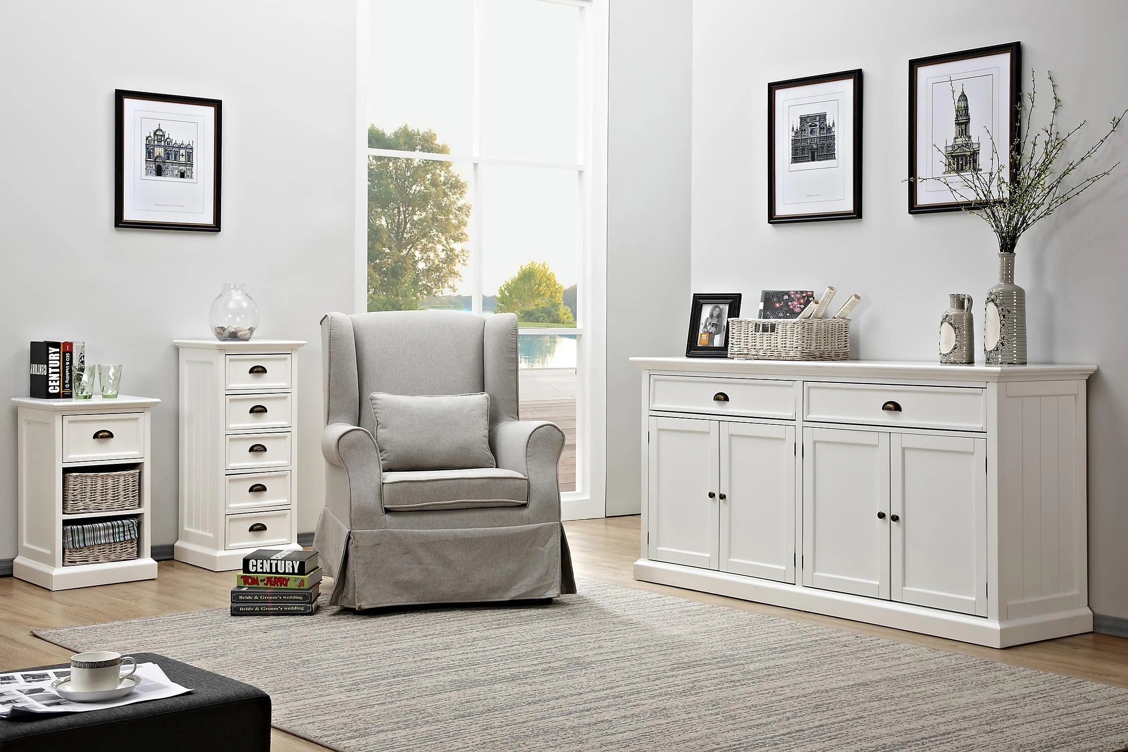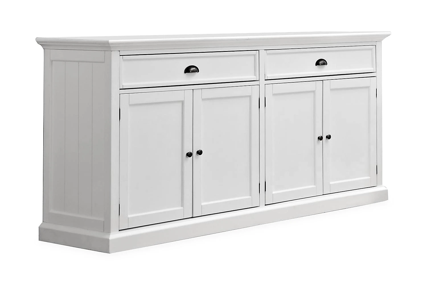 Hampton är en stilfull skänk med vackra detaljer så som skålade handtag i antik mässing. Med fyra rymliga skåp och två lådor finns det gott om förvaringsmöjligheter. Dekorera gärna skänkens avlastningsyta med ljusstakar, växter eller liknande som en extra inredningsdetalj i hemmet.