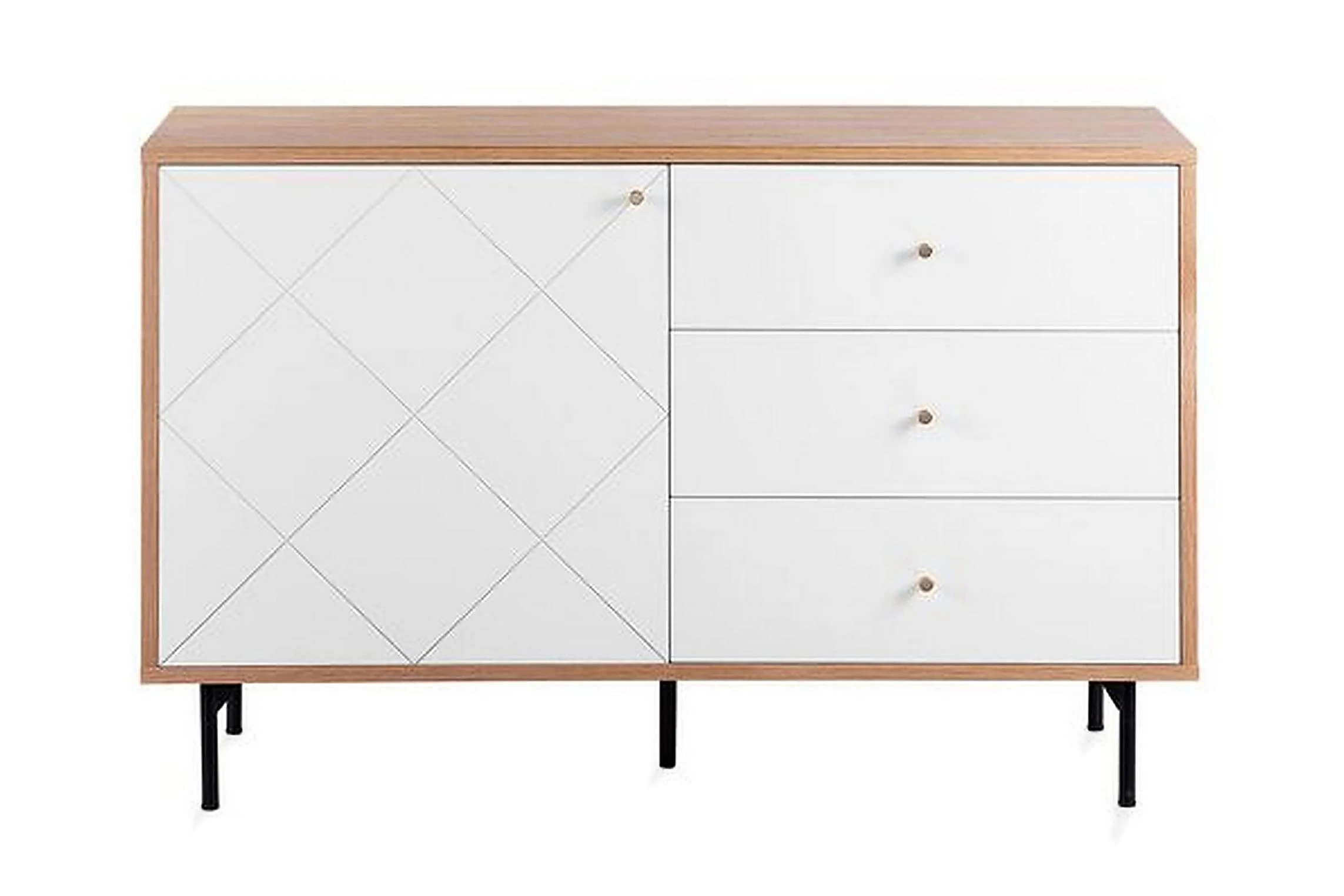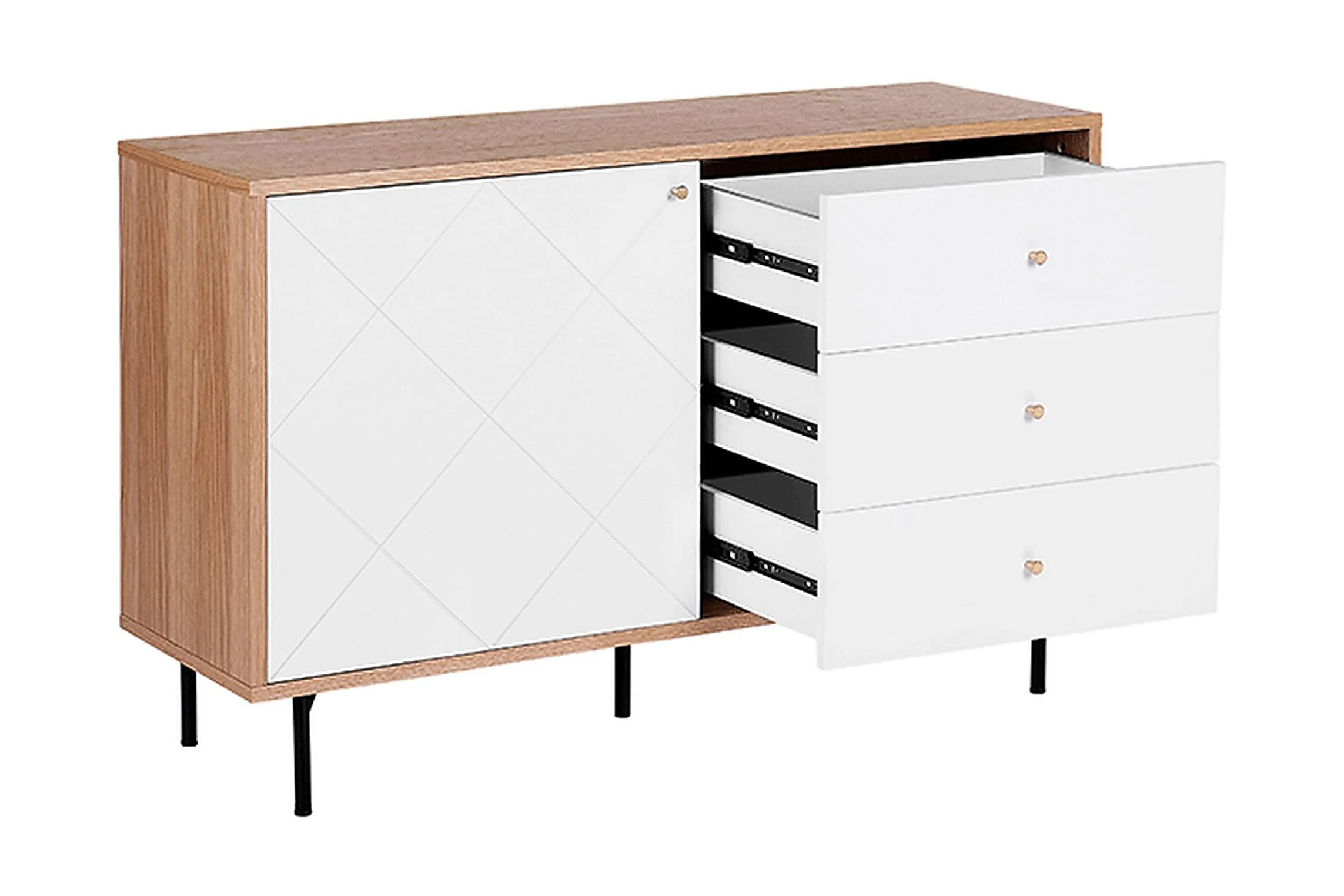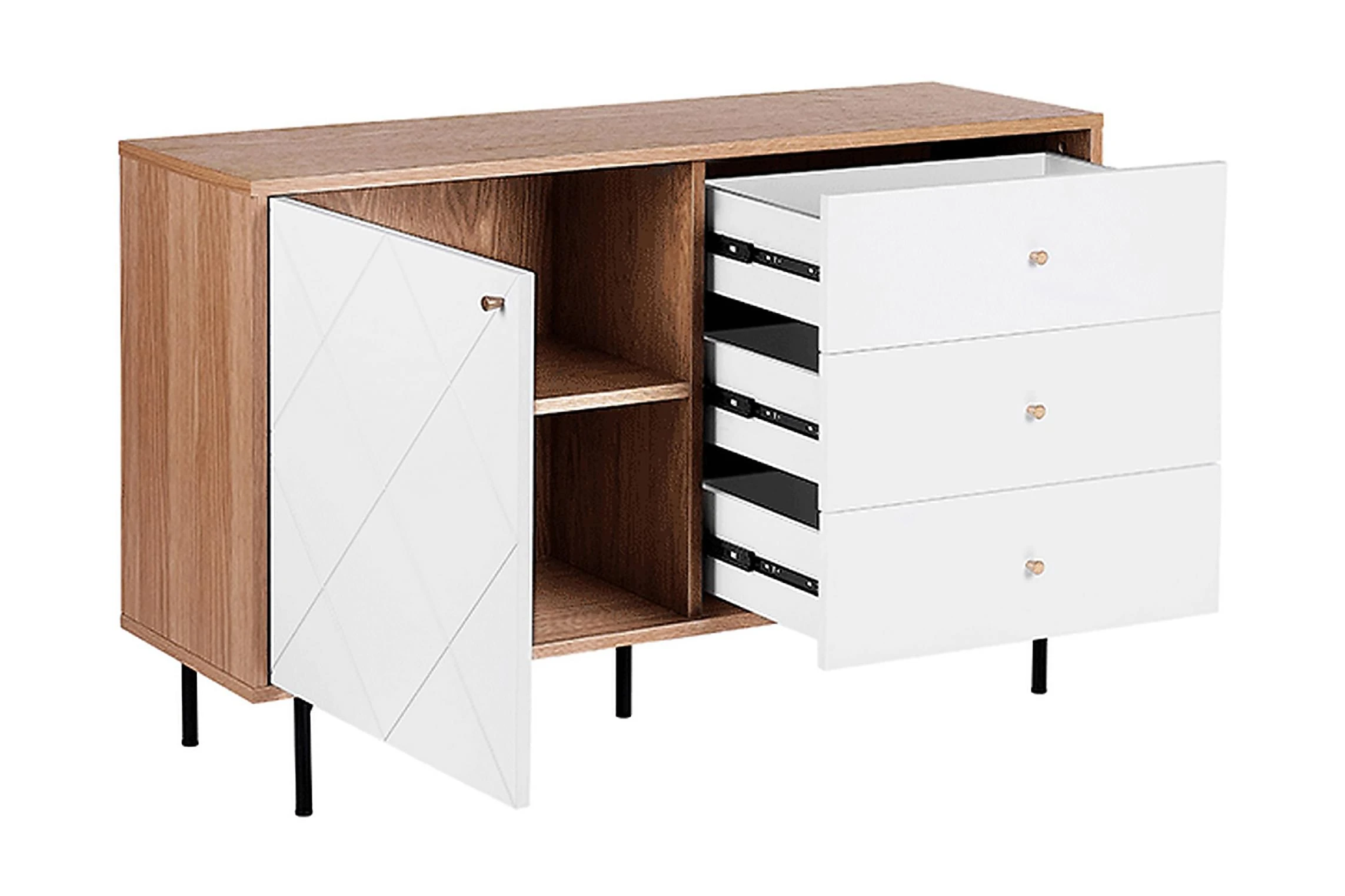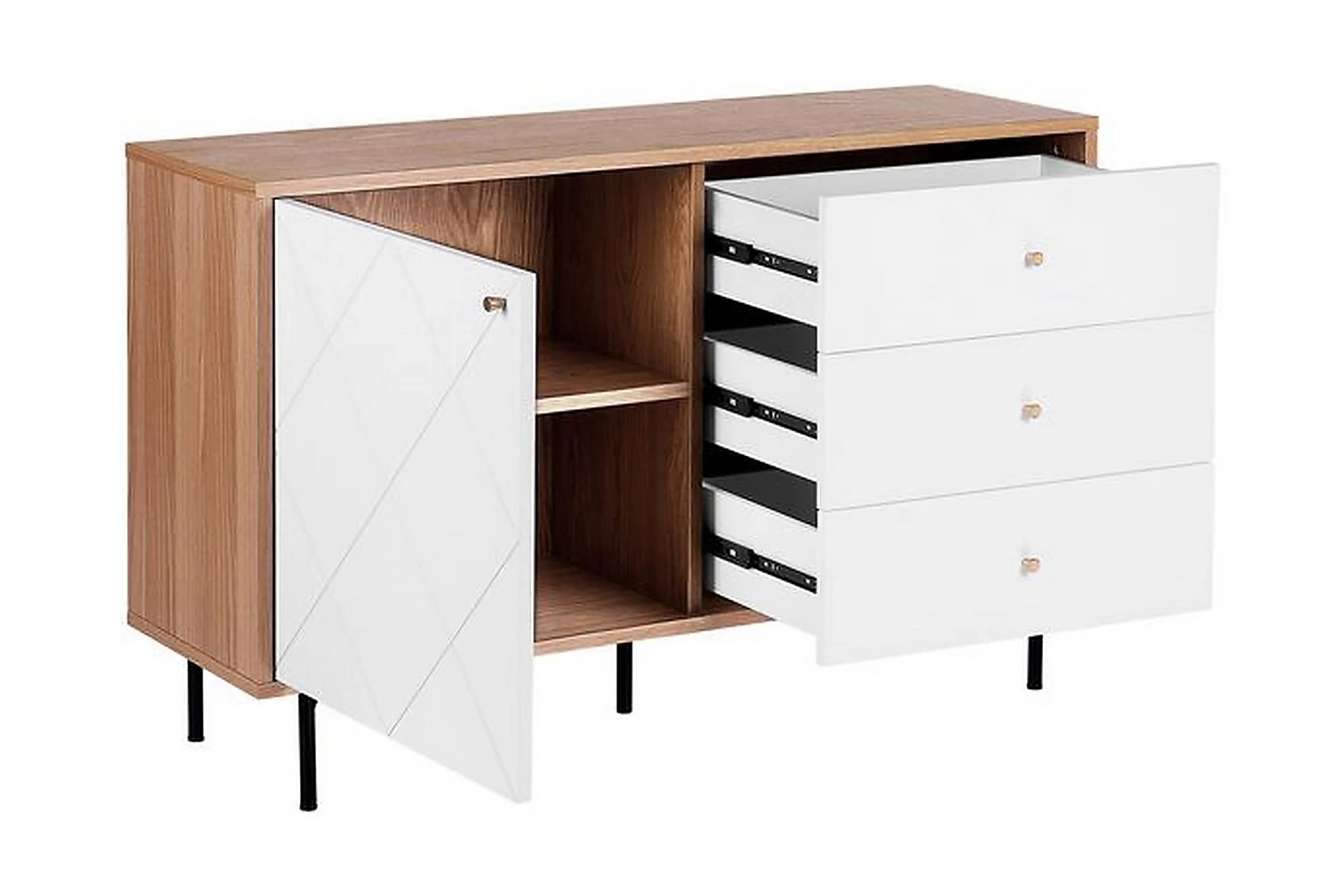 Denna rymliga skänk i skandinavisk stil är tillverkad av hållbara material. Skänken är utrustad med tre lådor och 2 hyllor gömda bakom dörr. Perfekt som TV-bänk i vardagsrum eller som förvaringsmöbel i sovrum eller hemkontor. Material: MDF. Ytterligare material: pulverlackerad metall, aluminium. Vikt: 47 Montering: Fullständig montering krävs Vikt kapacitet: 55 Produktfördelar: Högkvalitativt ich precist utförande, Kombinerar modern och klassisk design, Dekorativ, men ändå funktionell, Praktiska lådor med stabil mekanism, Mycket funktionell och praktisk