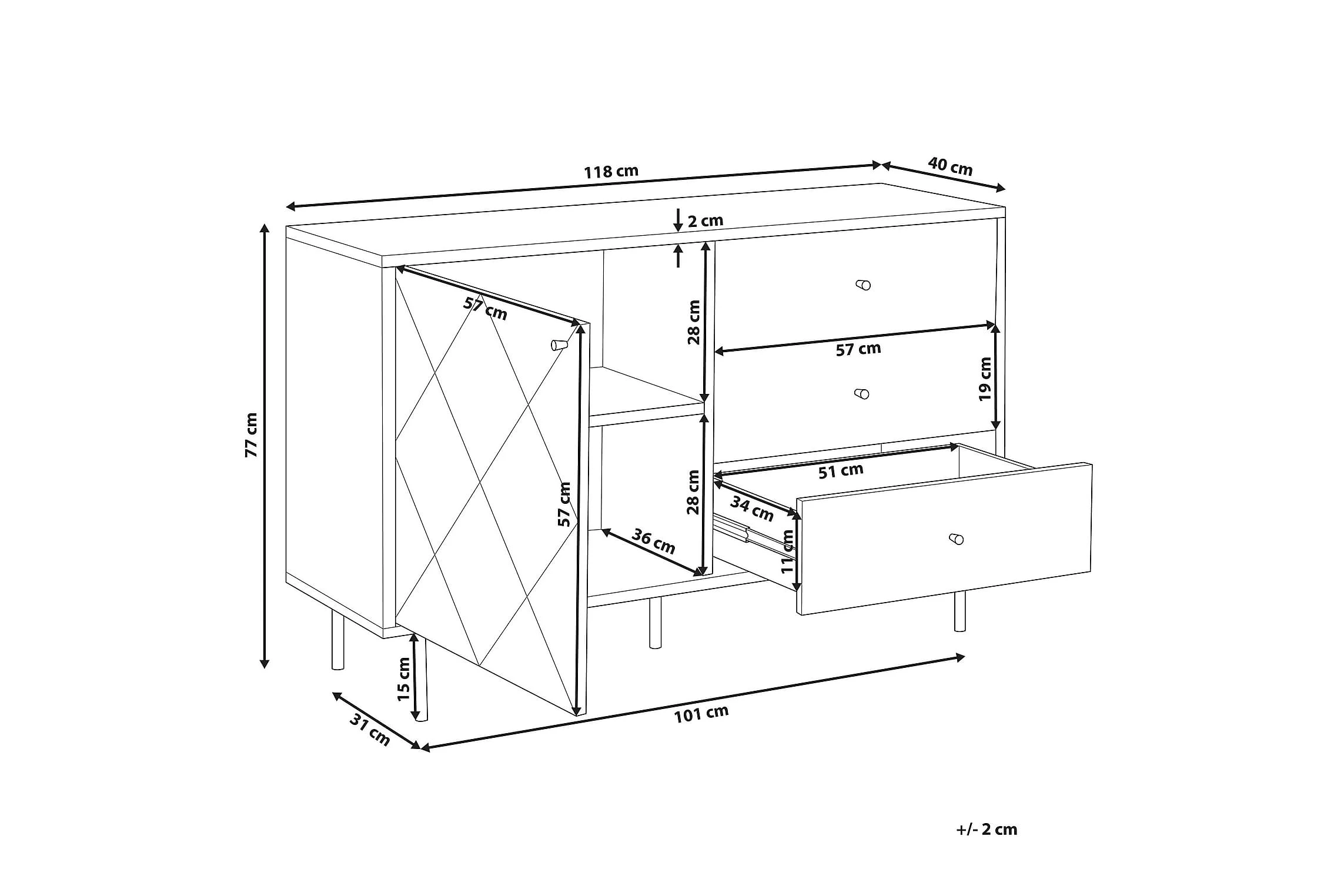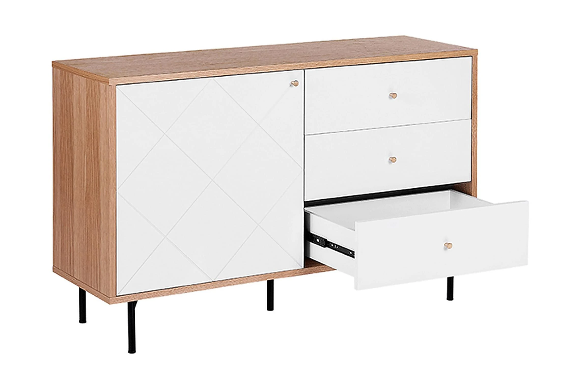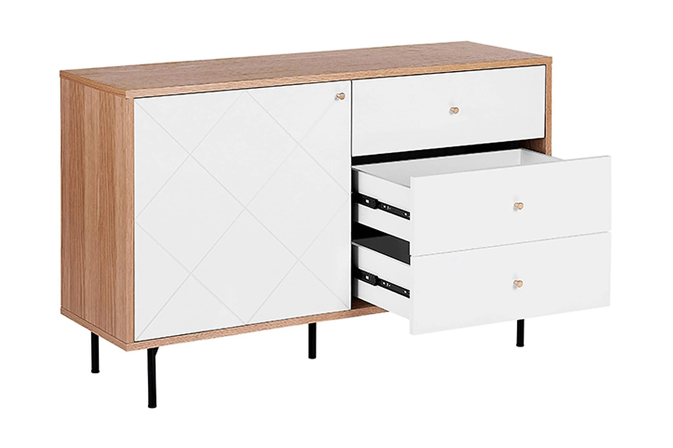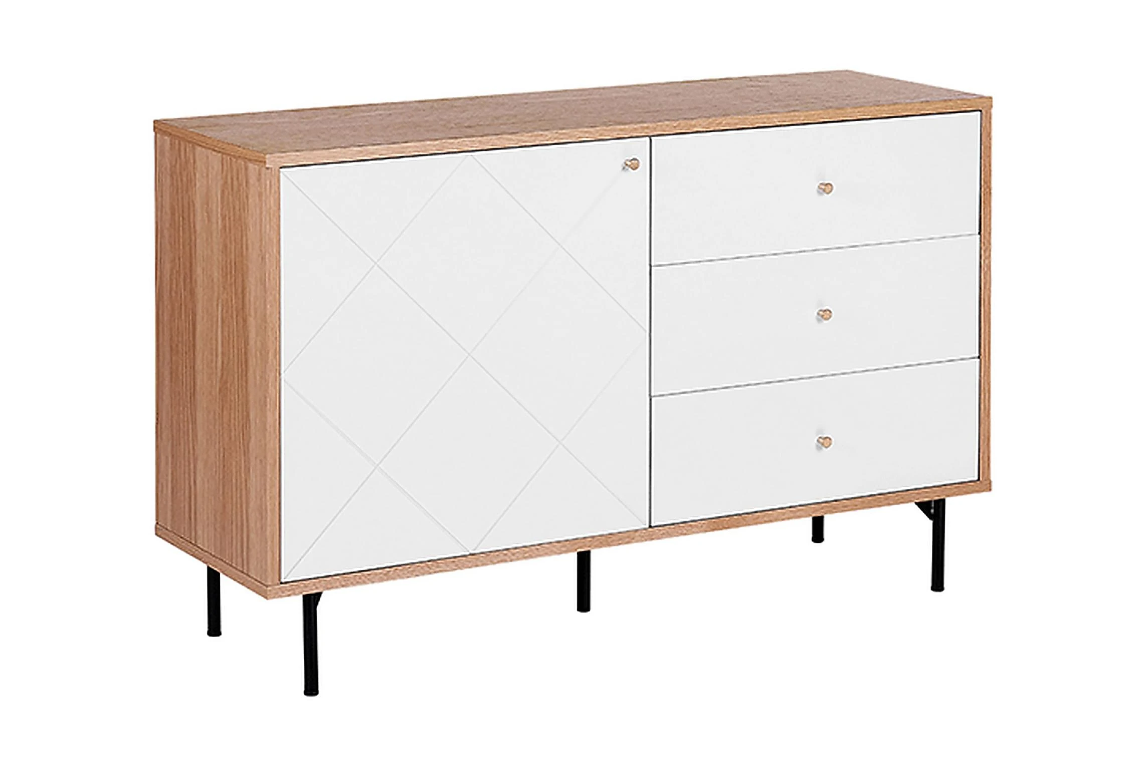 Denna rymliga skänk i skandinavisk stil är tillverkad av hållbara material. Skänken är utrustad med tre lådor och 2 hyllor gömda bakom dörr. Perfekt som TV-bänk i vardagsrum eller som förvaringsmöbel i sovrum eller hemkontor. Material: MDF. Ytterligare material: pulverlackerad metall, aluminium. Vikt: 47 Montering: Fullständig montering krävs Vikt kapacitet: 55 Produktfördelar: Högkvalitativt ich precist utförande, Kombinerar modern och klassisk design, Dekorativ, men ändå funktionell, Praktiska lådor med stabil mekanism, Mycket funktionell och praktisk