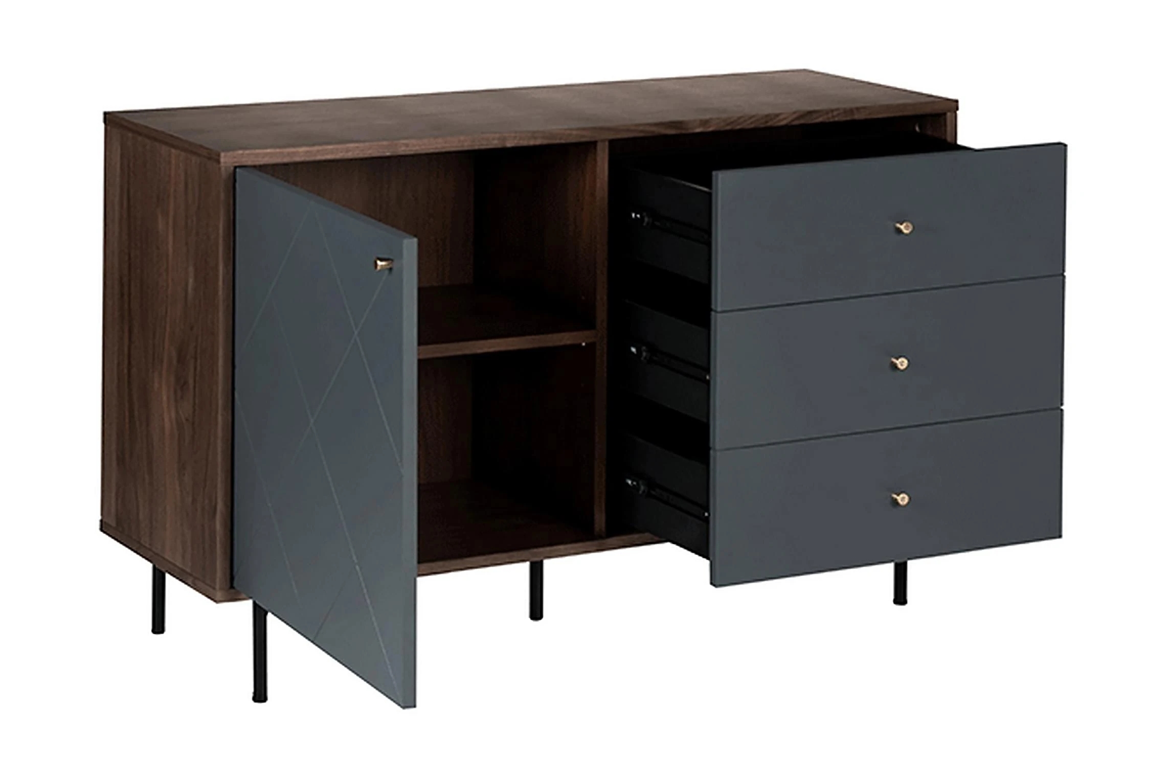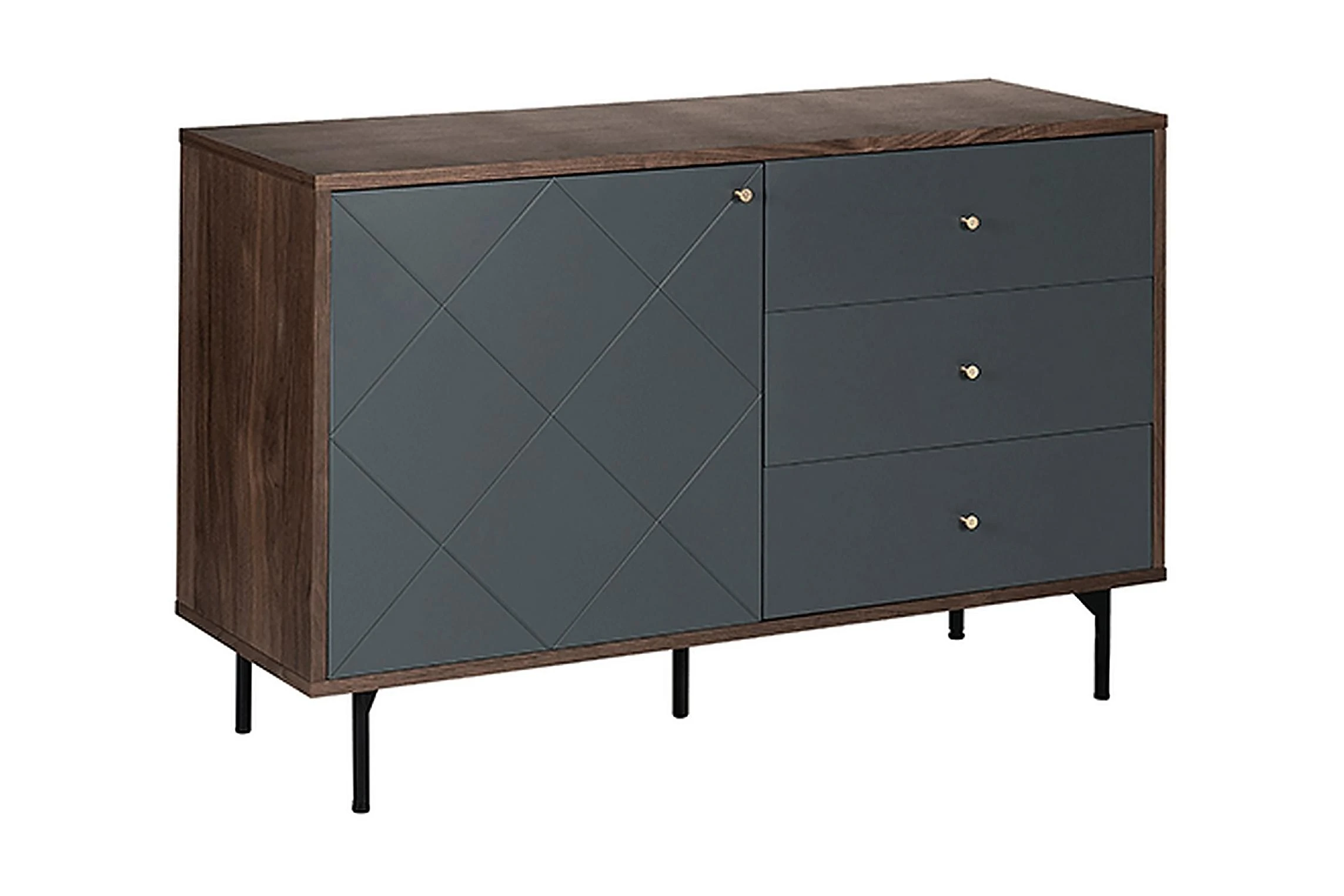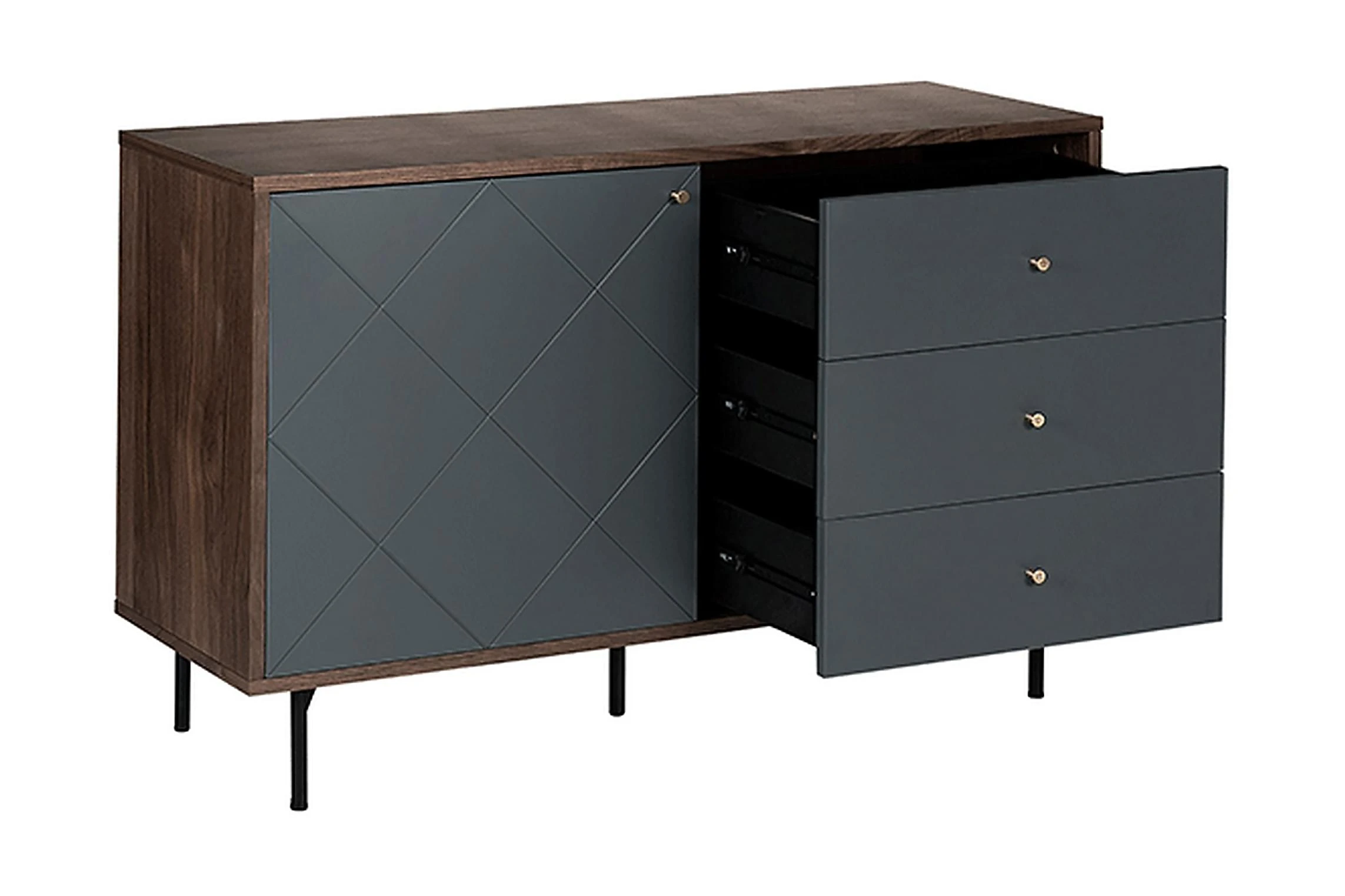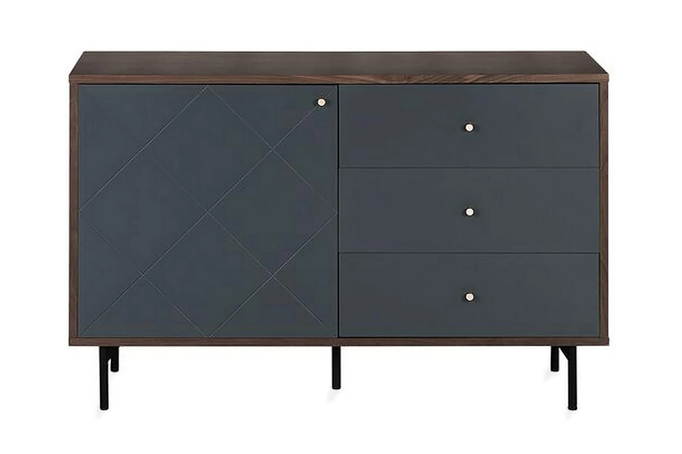Denna rymliga skänk i skandinavisk stil är tillverkad av hållbara material. Skänken är utrustad med tre lådor och 2 hyllor gömda bakom dörr. Perfekt som TV-bänk i vardagsrum eller som förvaringsmöbel i sovrum eller hemkontor. Material: MDF. Ytterligare material: pulverlackerad metall, aluminium. Vikt: 47 Montering: Fullständig montering krävs Vikt kapacitet: 55 Produktfördelar: Högkvalitativt ich precist utförande, Kombinerar modern och klassisk design, Dekorativ, men ändå funktionell, Praktiska lådor med stabil mekanism, Mycket funktionell och praktisk
