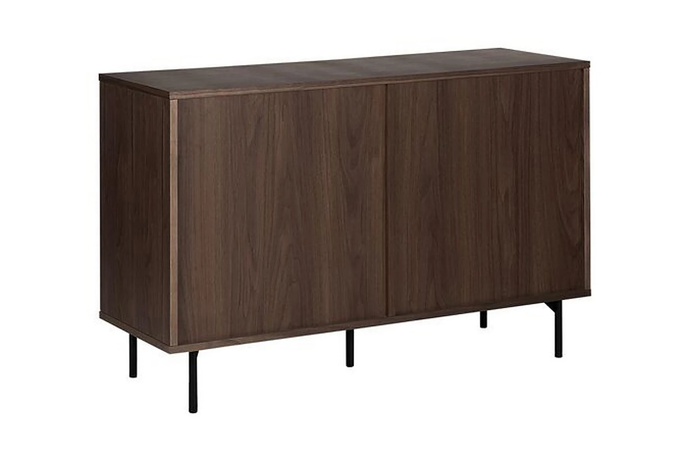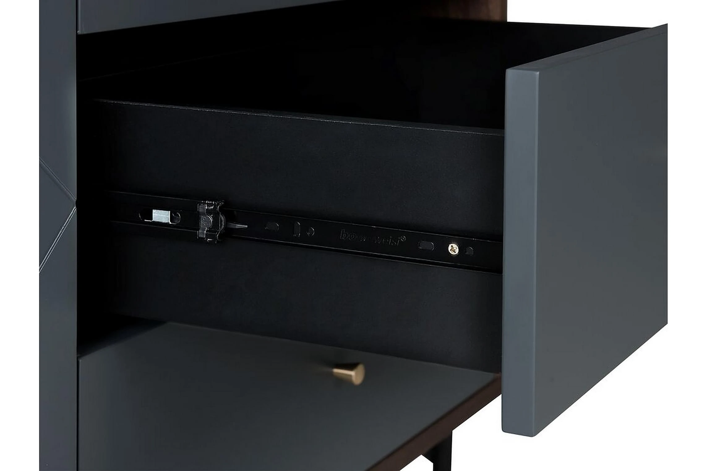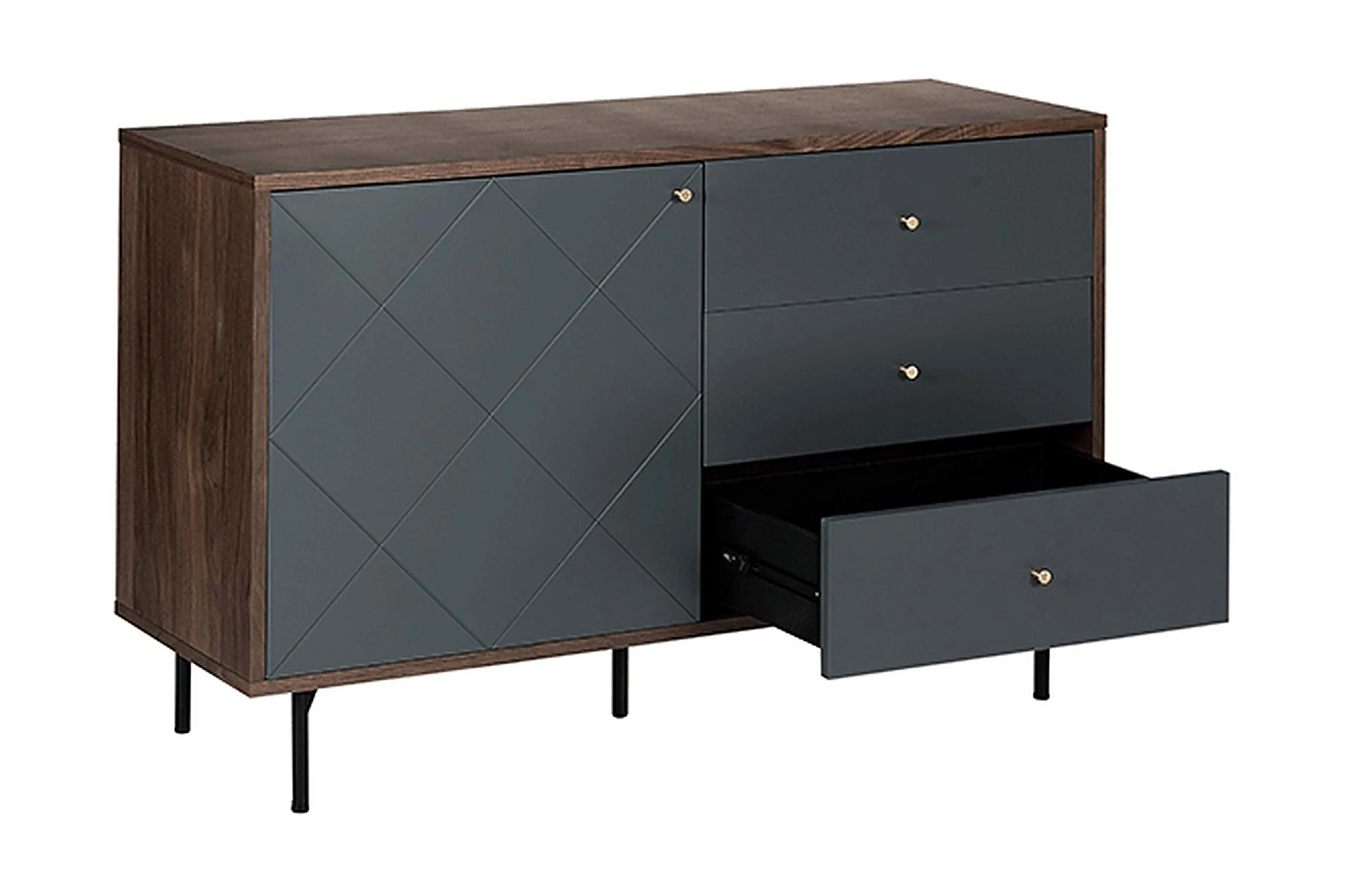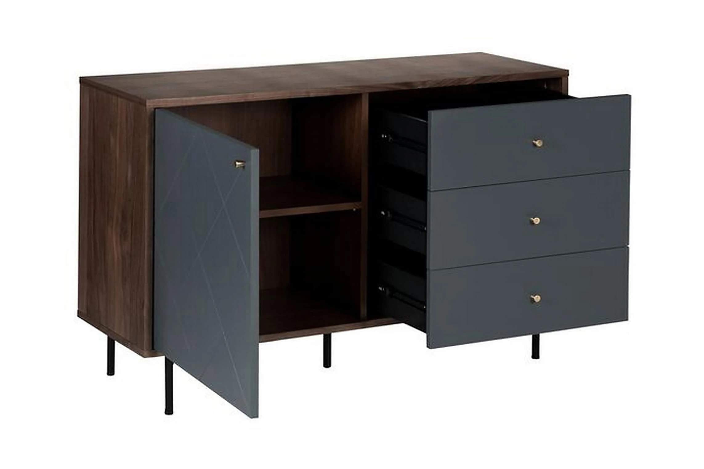 Denna rymliga skänk i skandinavisk stil är tillverkad av hållbara material. Skänken är utrustad med tre lådor och 2 hyllor gömda bakom dörr. Perfekt som TV-bänk i vardagsrum eller som förvaringsmöbel i sovrum eller hemkontor. Material: MDF. Ytterligare material: pulverlackerad metall, aluminium. Vikt: 47 Montering: Fullständig montering krävs Vikt kapacitet: 55 Produktfördelar: Högkvalitativt ich precist utförande, Kombinerar modern och klassisk design, Dekorativ, men ändå funktionell, Praktiska lådor med stabil mekanism, Mycket funktionell och praktisk