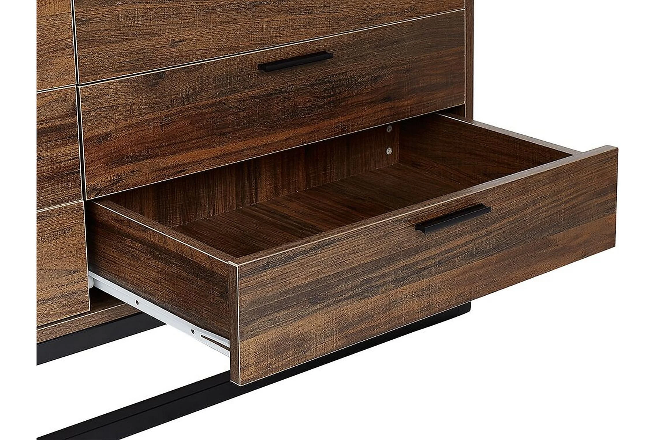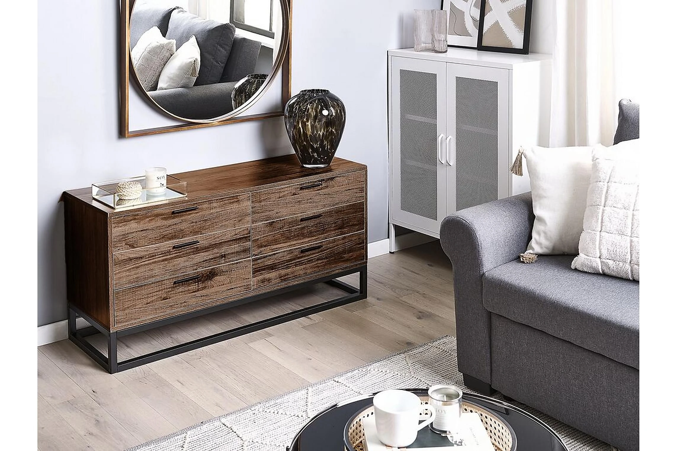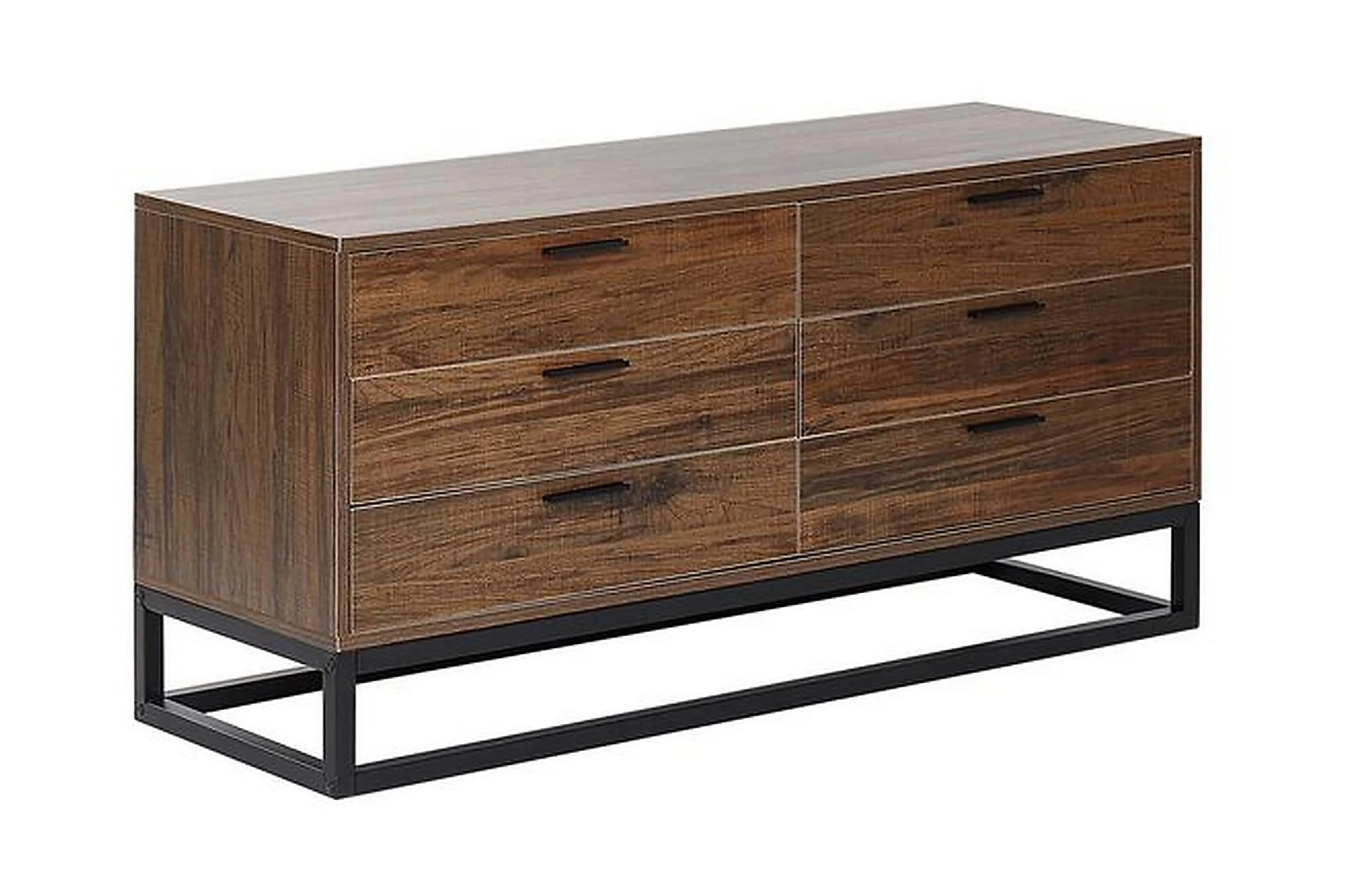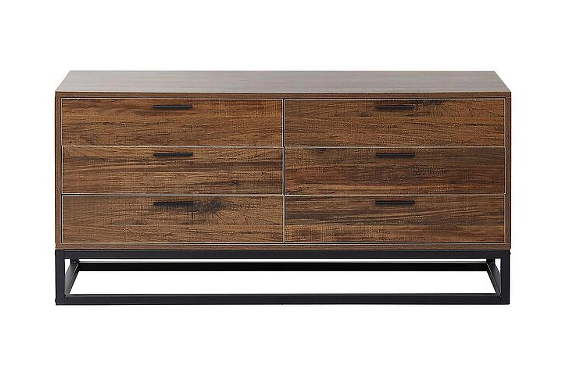 Rustik, boho, industriell eller minimalistisk, den här universella skänken passar till alla moderna utrymmen. Tillverkad av högkvalitativt konstruerat trä har den en träliknande yta i mörk ton som värmer upp varje rum. Den har sex rymliga lådor som ger dig gott om lagringsutrymme för alla typer av tillbehör eller kläder. Tack vare den breda toppen kan den också fungera som en TV-bänk. Material: spånskiva. Ytterligare material: stål. Vikt: 36 Montering: Fullständig montering krävs Benhöjd: 16 Produktfördelar: Precis finish, Hög hållbarhet, Traditionell design med en modern touch, Passar in i olika inredningsstilar, Funktionella och rymlig lådor