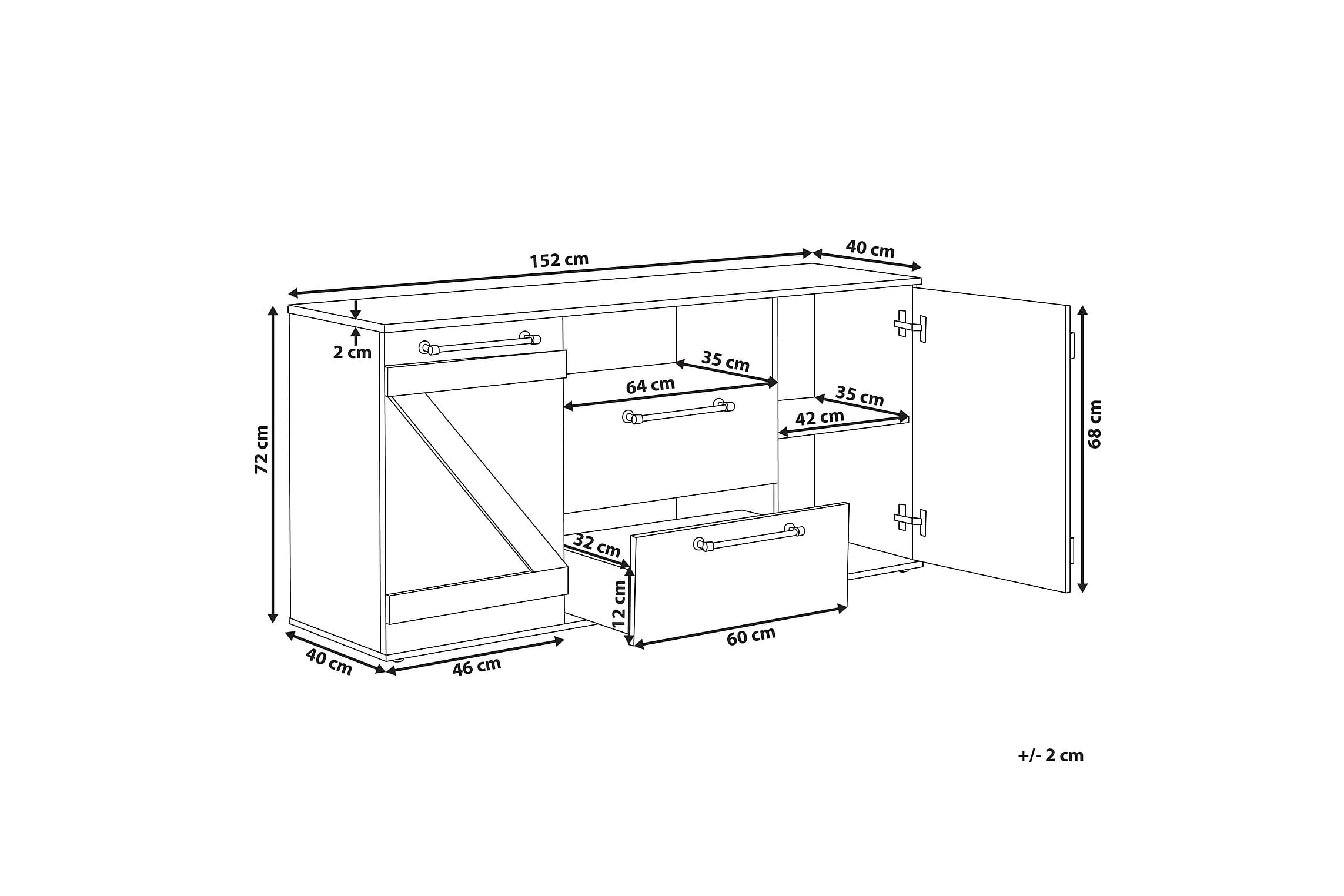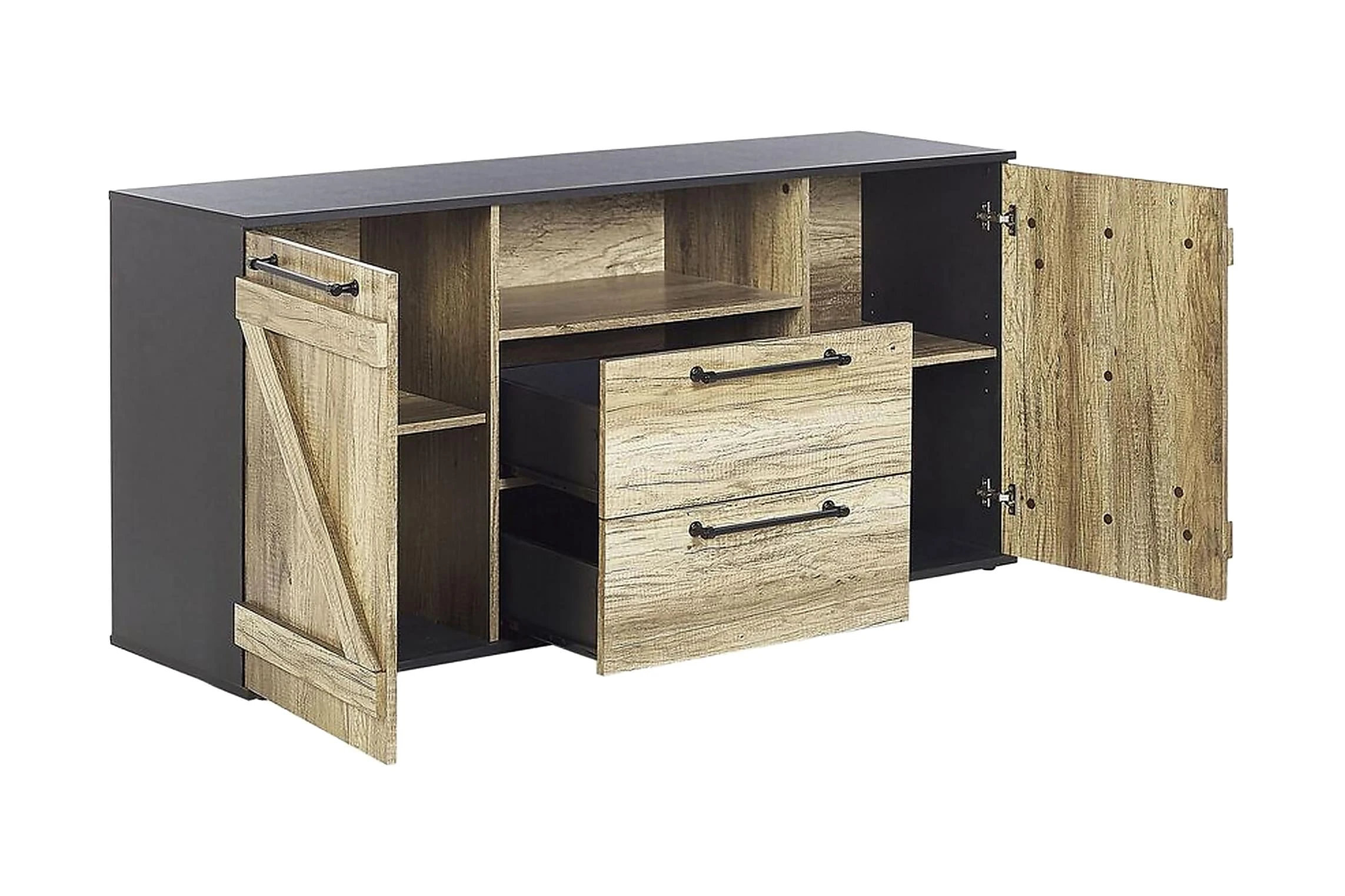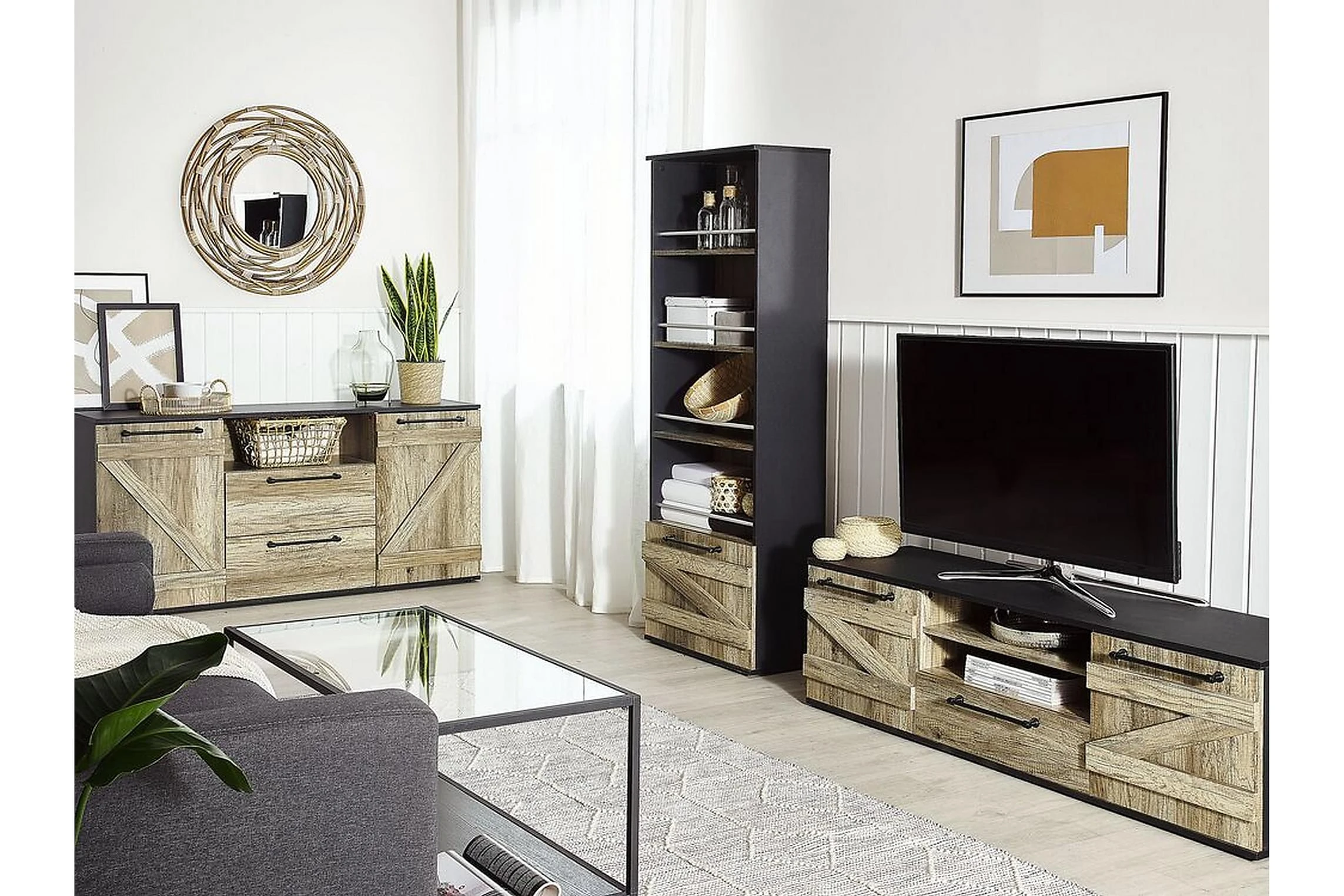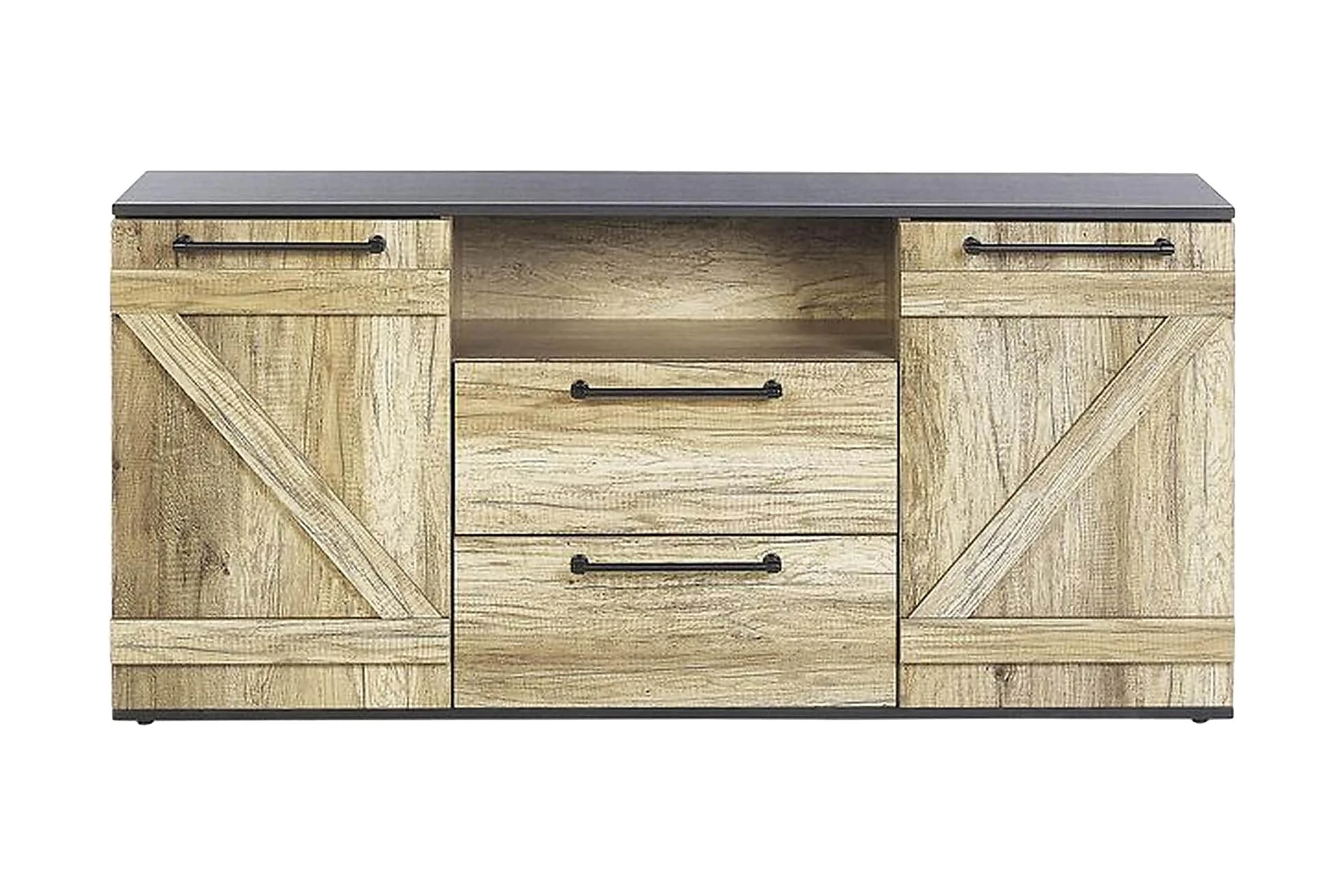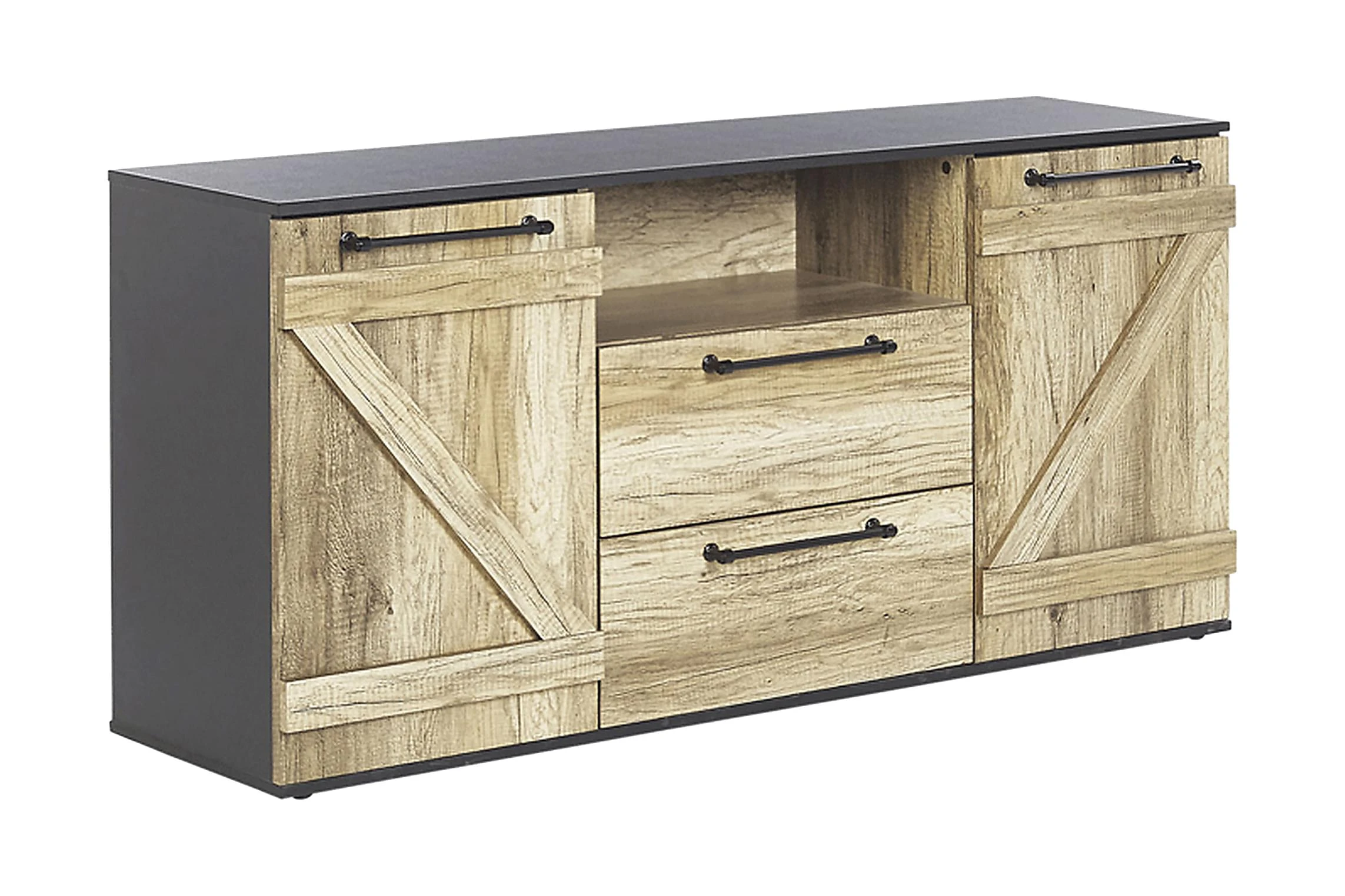 Ordna ditt vardagsrum i en fantastisk stil. Denna skänk är en mycket funktionell bit med sina rymliga skåp och två lådor. Kombinationen av ljus träfärg med en korneffekt och det klassiska svarta gör interiören ännu mer elegant. Tvärstängerna på skåpens dörrar framkallar utseendet på de råa, gamla stilmöblerna. Material: spånskiva. Ytterligare material: metall. Vikt: 50 Montering: Fullständig montering krävs Produktfördelar: Hög hållbarhet, Perfekt utformade detaljer, Modern design, Perfekt för industriella interiörer, Gott lagringsutrymme