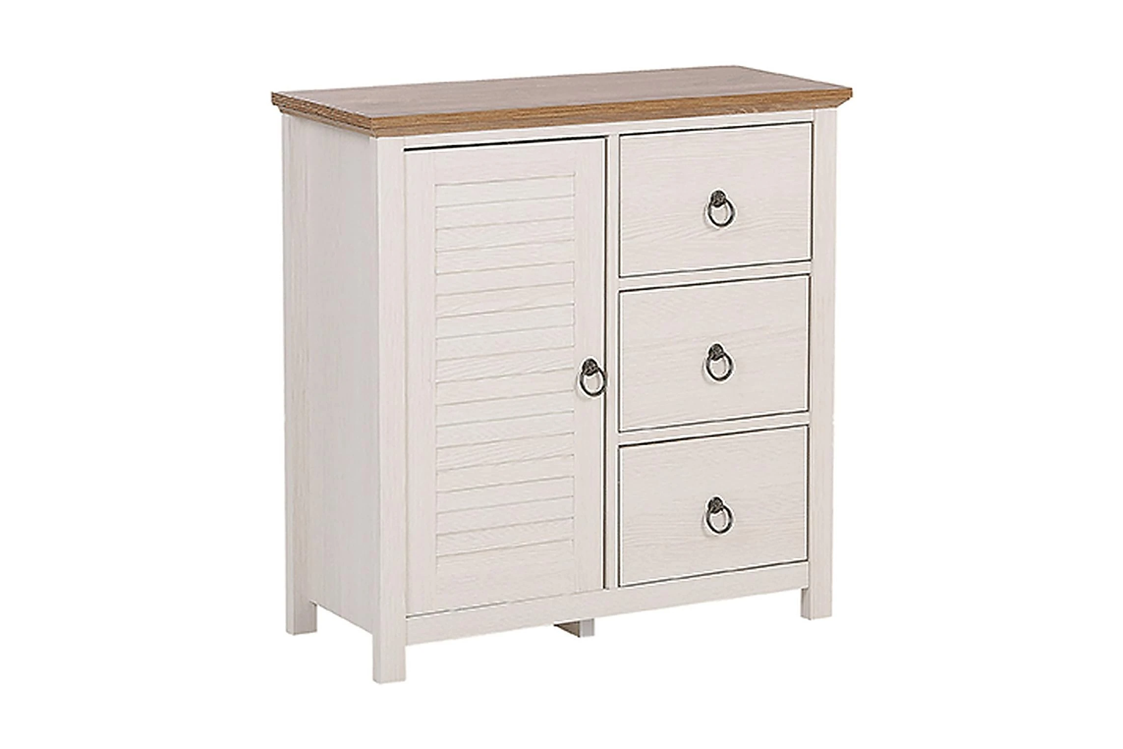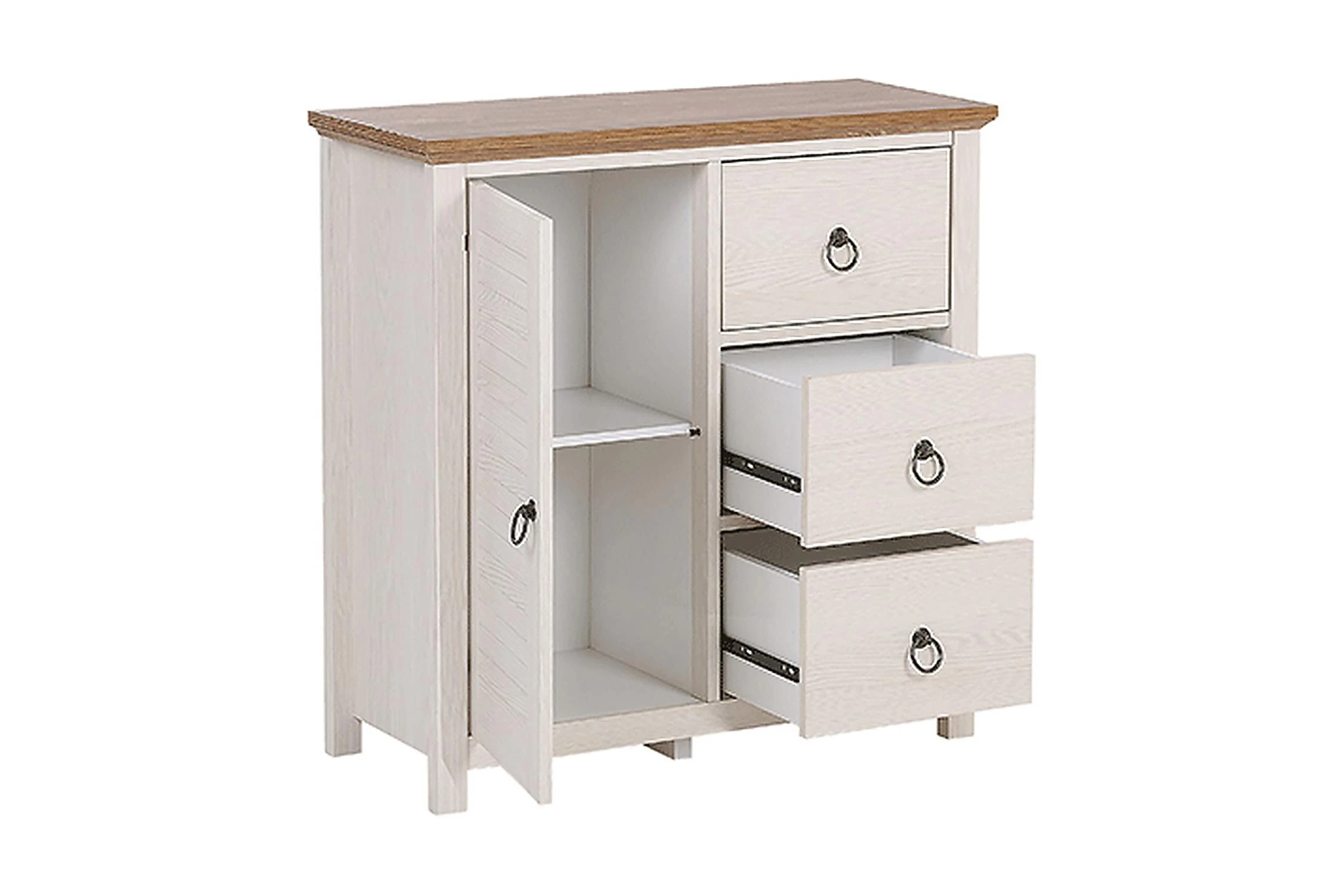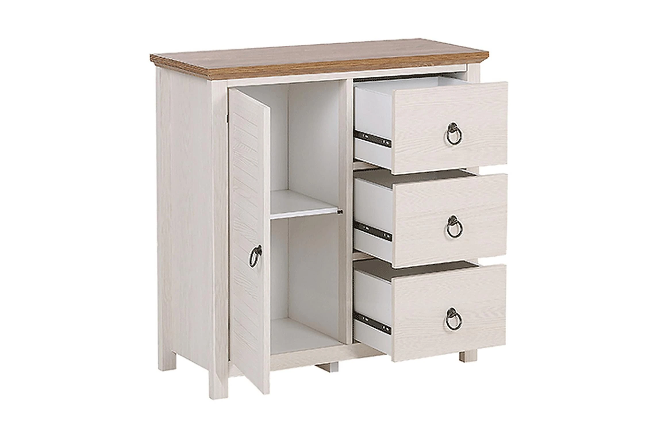Traditionell rustikal stil skapar hemtrevlig atmosfär i varje rum. Denna elegant skänk kommer att försköna din omgivning och bli din favorita möbel! Skänken erbjuder gott om lagringsutrymme med sina 3 rymliga lådor och ett skåp. Tack vare den vita färgen på skänket som står i kontrast till en mörkare topp, sticker möbeln ut. I kombination med dekorationer som fotografier eller dekorativa vaser kommer det säkert att ge en mysig atmosfär i ditt hem! Material: MDF. Ytterligare material: metall. Vikt: 28 Montering: Fullständig montering krävs Vikt kapacitet: 50 Produktfördelar: Exceptionellt robust och solid konstruktion, Högkvalitativa material, Praktiska och rymliga lådor, Perfekt för både ett sovrum och ett vardagsrum, Gott lagringsutrymme