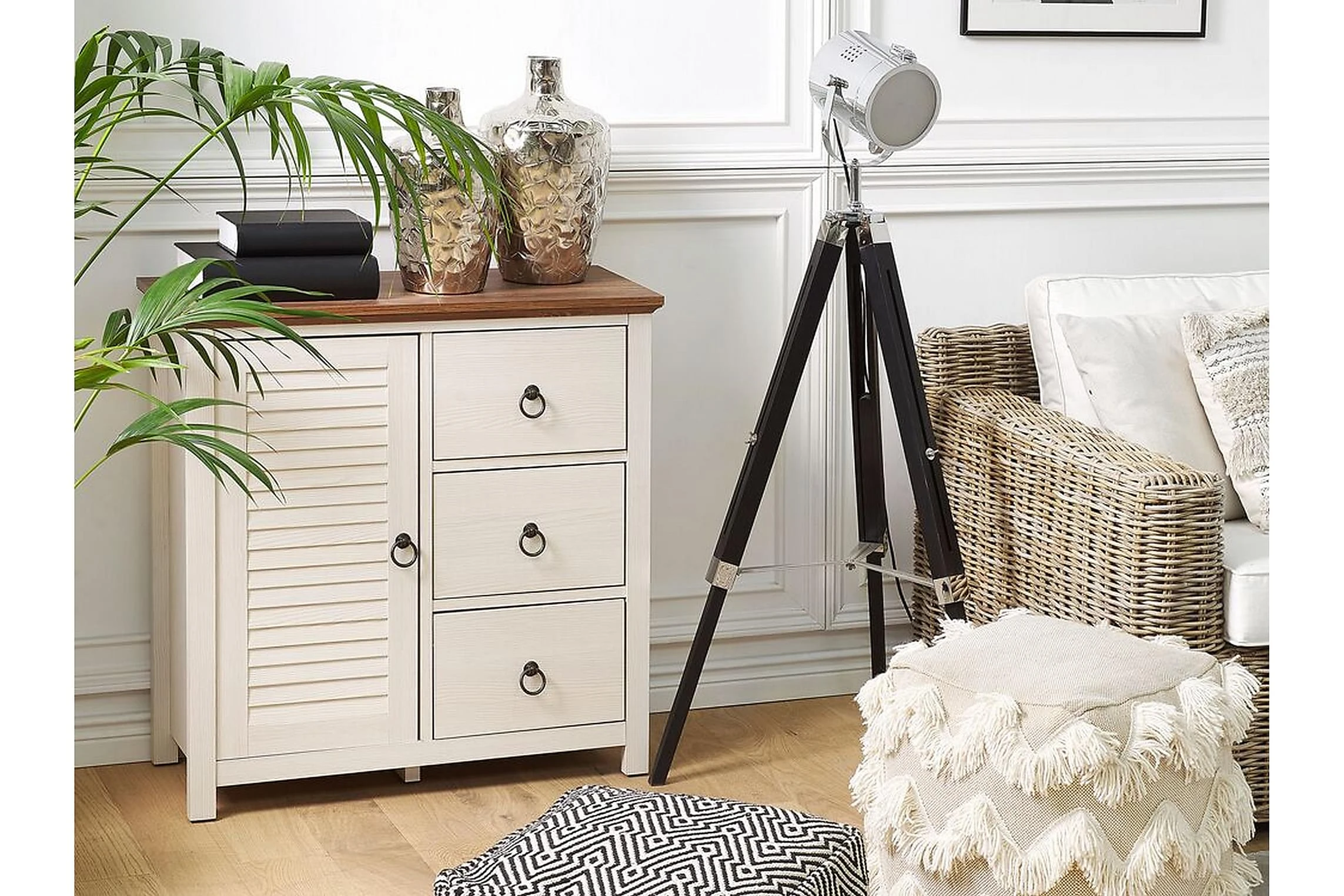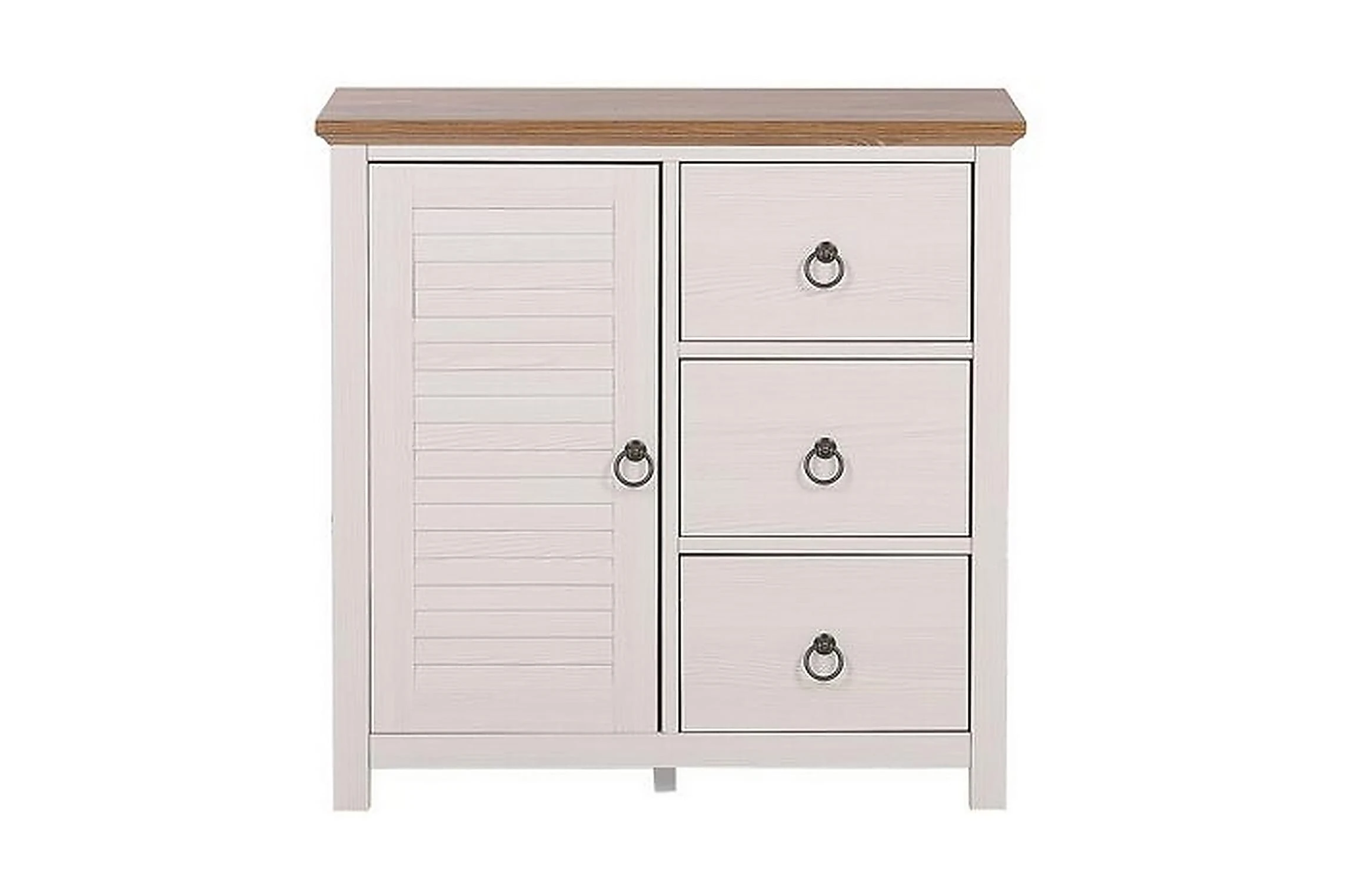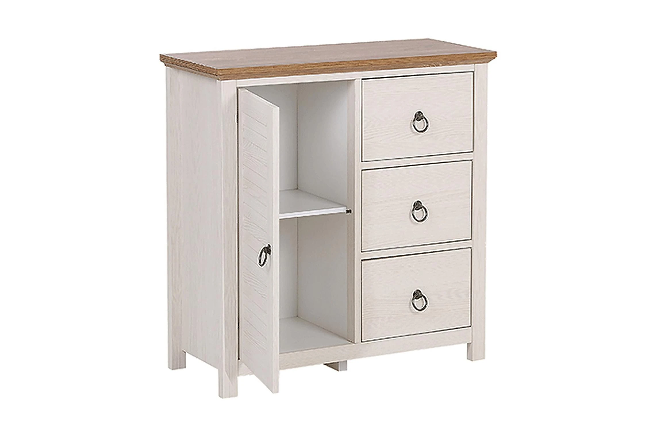 Traditionell rustikal stil skapar hemtrevlig atmosfär i varje rum. Denna elegant skänk kommer att försköna din omgivning och bli din favorita möbel! Skänken erbjuder gott om lagringsutrymme med sina 3 rymliga lådor och ett skåp. Tack vare den vita färgen på skänket som står i kontrast till en mörkare topp, sticker möbeln ut. I kombination med dekorationer som fotografier eller dekorativa vaser kommer det säkert att ge en mysig atmosfär i ditt hem! Material: MDF. Ytterligare material: metall. Vikt: 28 Montering: Fullständig montering krävs Vikt kapacitet: 50 Produktfördelar: Exceptionellt robust och solid konstruktion, Högkvalitativa material, Praktiska och rymliga lådor, Perfekt för både ett sovrum och ett vardagsrum, Gott lagringsutrymme