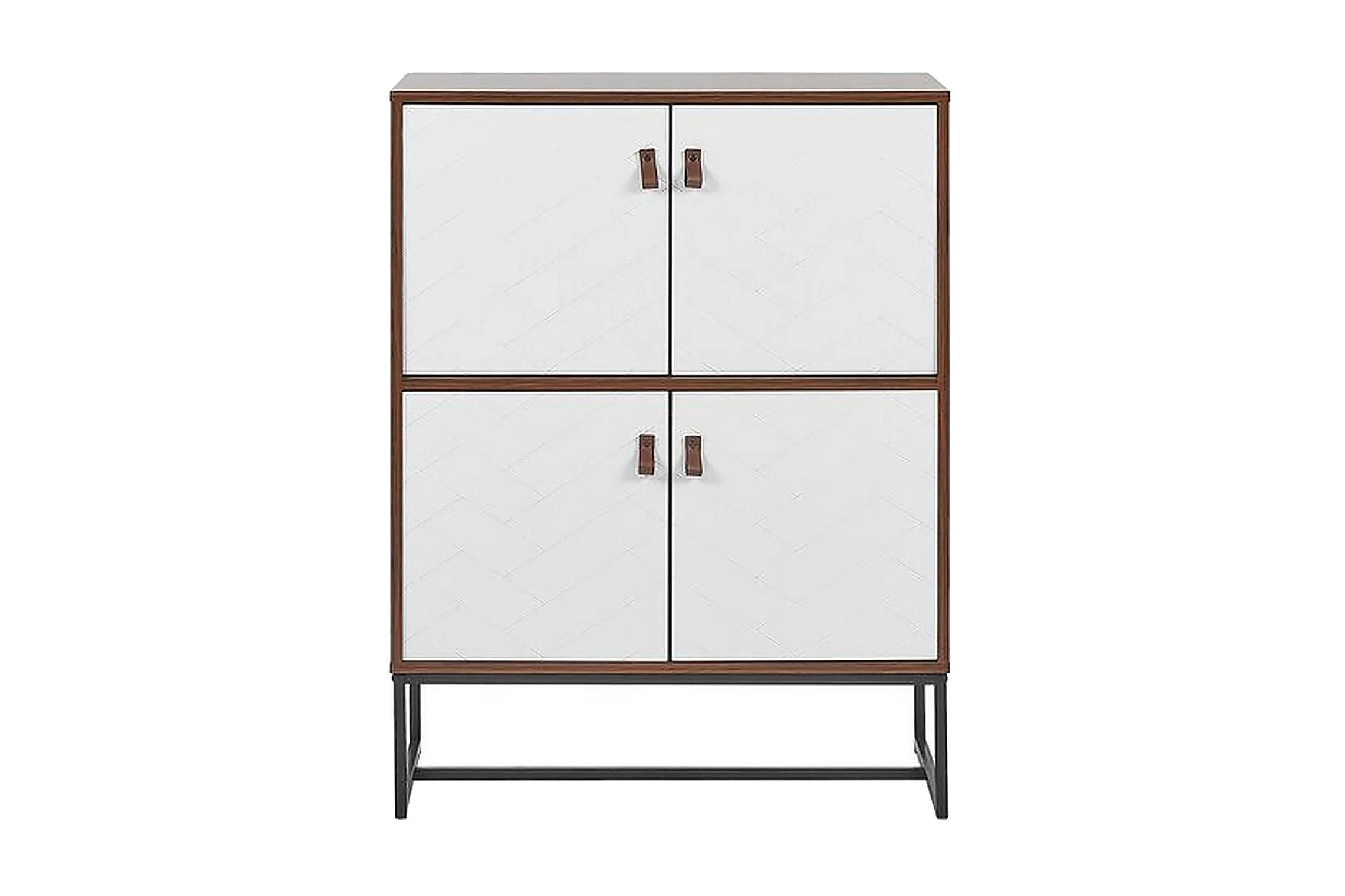 Om du letar efter traditionella förvaringsmöbler med modern touch är den här skänken ett bra val. Den är tillverkad av slitstark MDF-skiva i vit och mörk träfärg och ligger på en svart stabil metallbas. Den har 4 skåp som ger extra utrymme. Detaljer som konstläderhandtag och matt front förbättrar möbelns unika utseende. Material: MDF. Ytterligare material: metall, konstläder. Vikt: 27 Montering: Fullständig montering krävs Benhöjd: 19 Produktfördelar: Perfekt utförda detaljer, Tillverkad av hållbara material, Traditionell design med en modern touch, Med filttass för att förhindra repor på ytan, Gott utrymme för förvaring