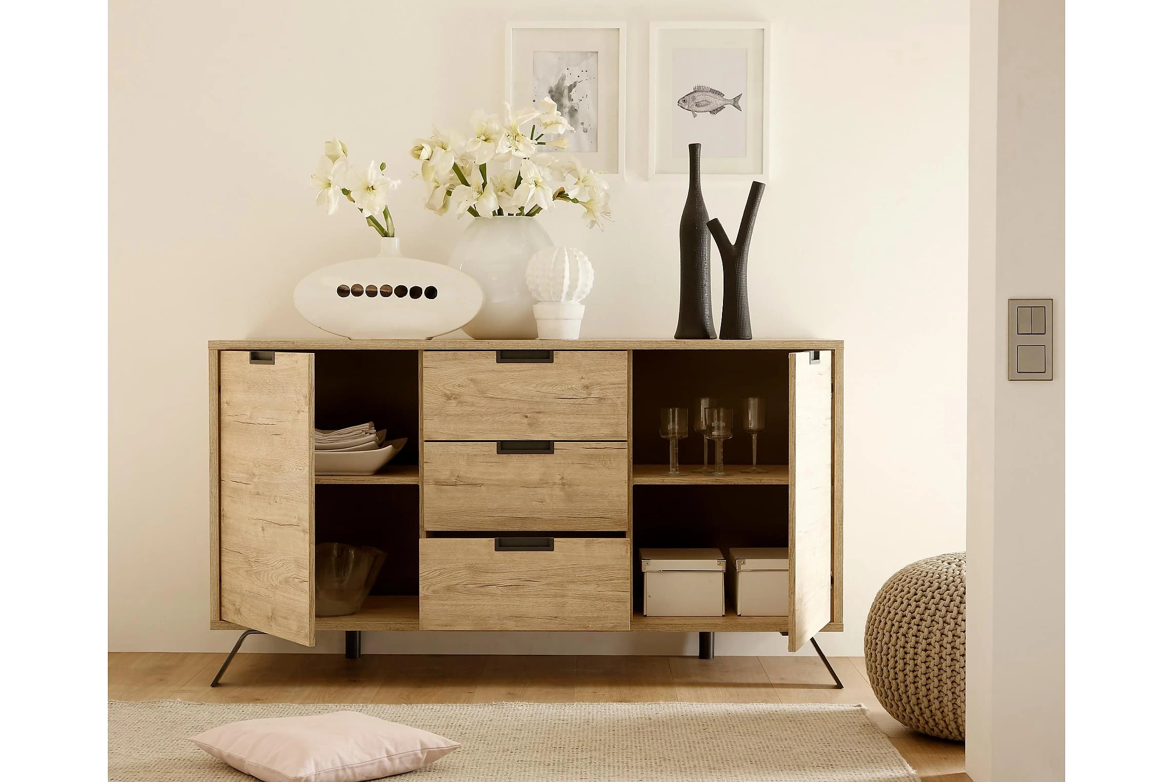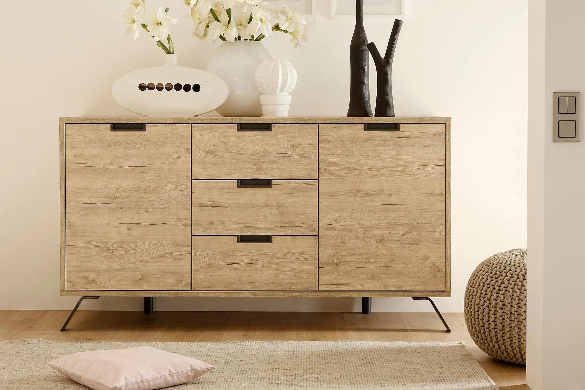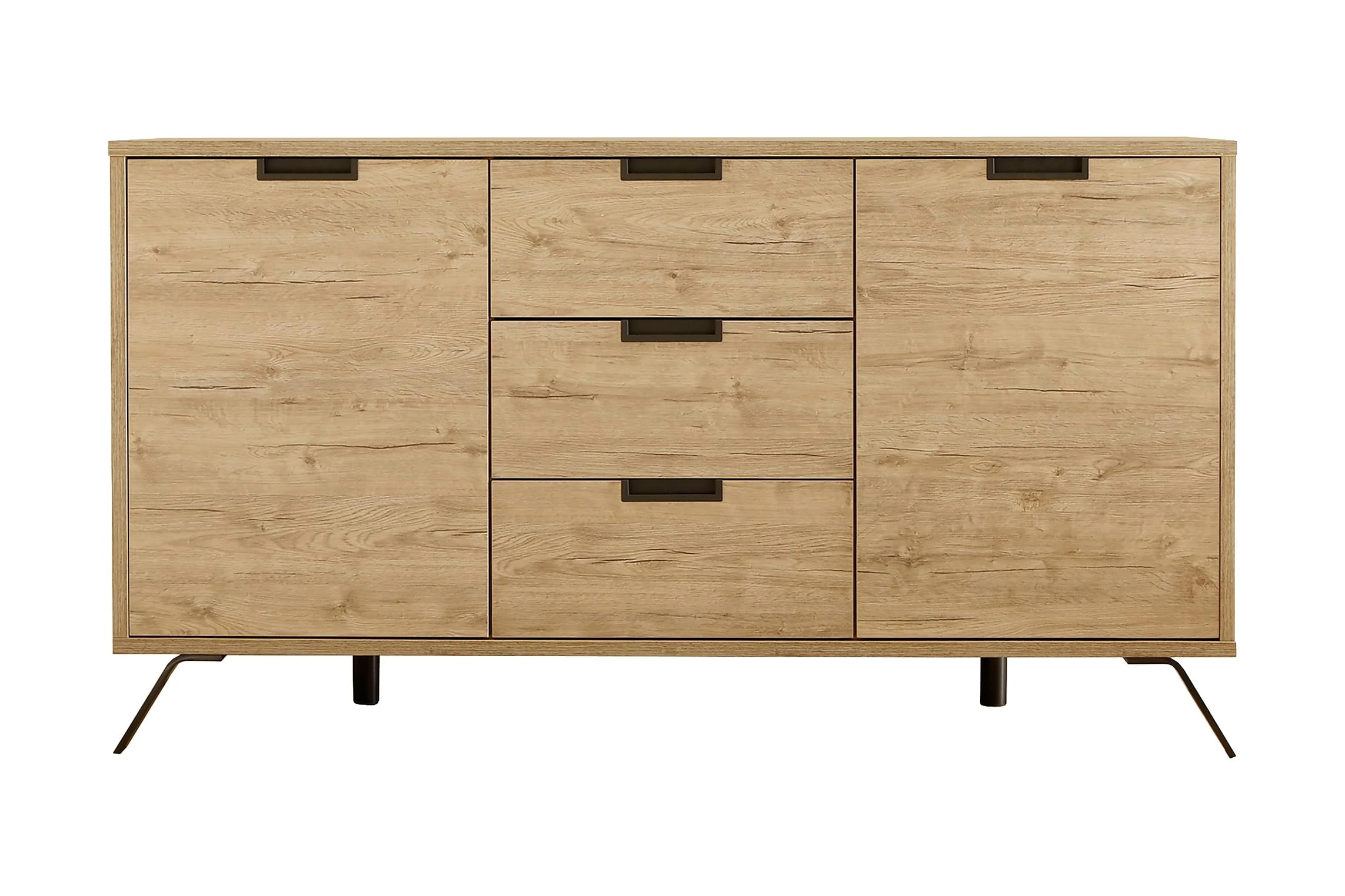 TV-bänk Terreno är en elegant möbel i träliknande Sheerwood Ek. Skänken har 2 rymliga skåp och 3 lådor som erbjuder gott om förvaringsutrymme. En stilren design med raka linjer och vinklade metallben ger skänken ett exklusivt utseende. Passar perfekt i det moderna såväl som det rustika hemmet. Stilsäker förvaring på hög nivå!